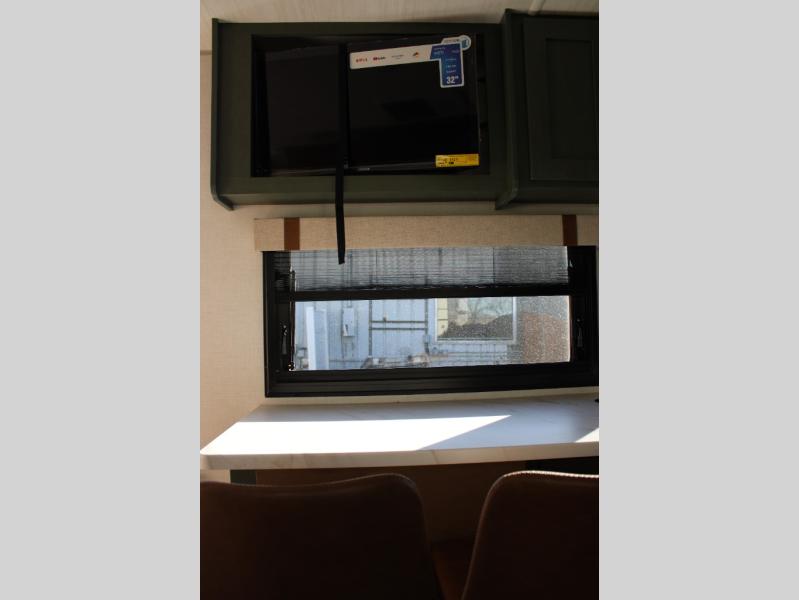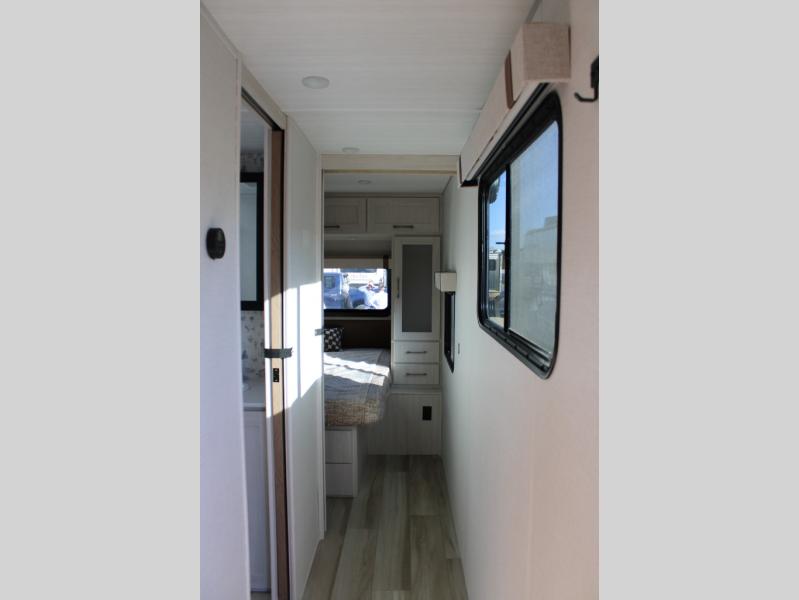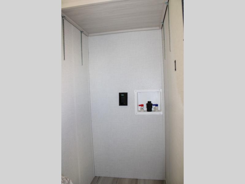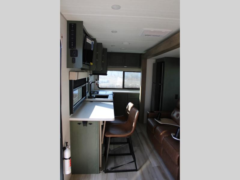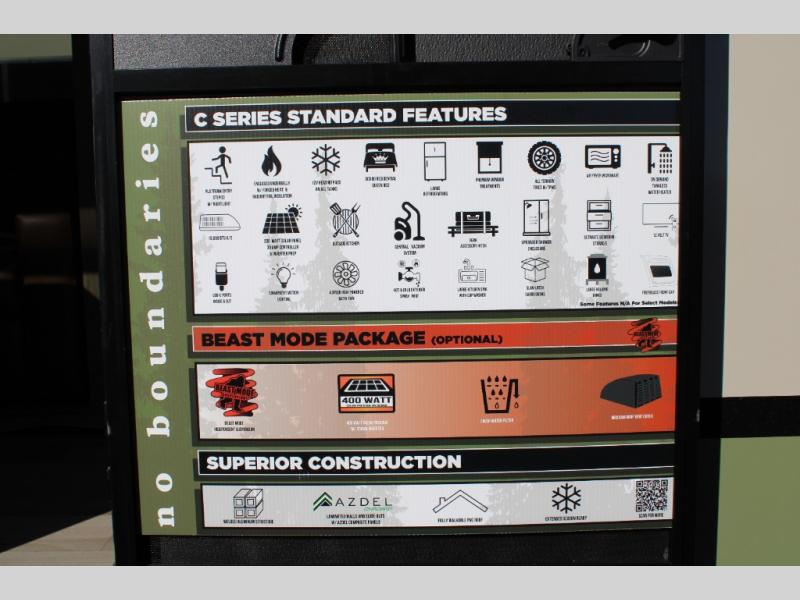 This spacious travel trailer is perfect for weekend trips to the lake. After you've unloaded the pass-through storage and put out the 20' awning, you can make lunch on the outside kitchen. If the weather isn't cooperating, the rear kitchen inside provides all the appliances needed to prepare meals. A Bar 2 Table provides a place to dine together, and there is a flip-up window here to let more light in! Your guests can sleep on the tri-fold sofa, while you take the queen bed in the front private bedroom. This unit also includes a closet with washer and dryer prep if you plan to add these appliances. When the optional Beast Mode Package is chosen on this model, you'll enjoy the Beast Mode suspension, an additional 200-watt solar panel, a Maxxair vent cover and more!