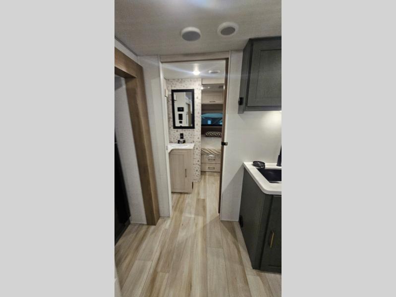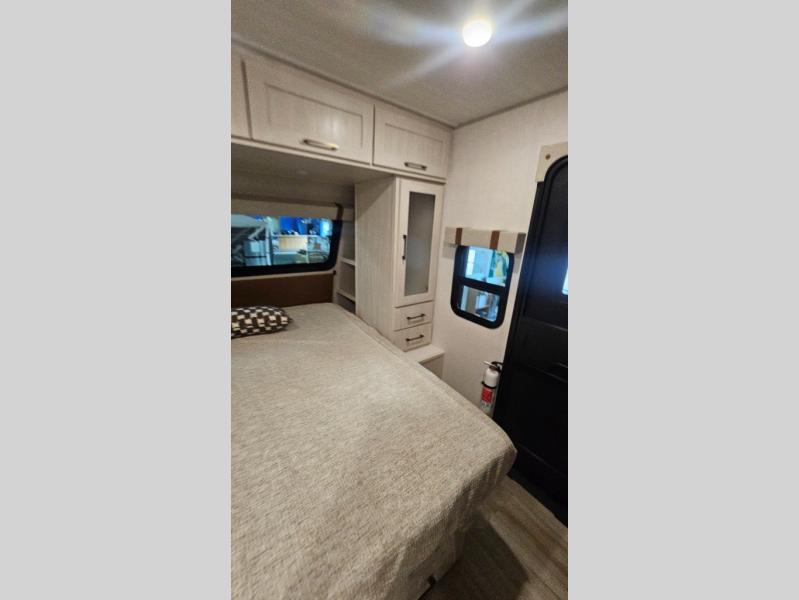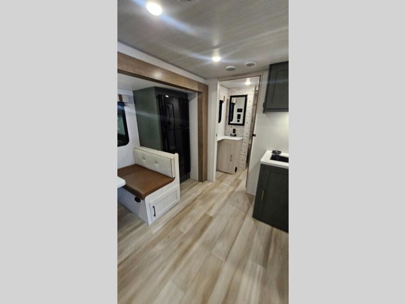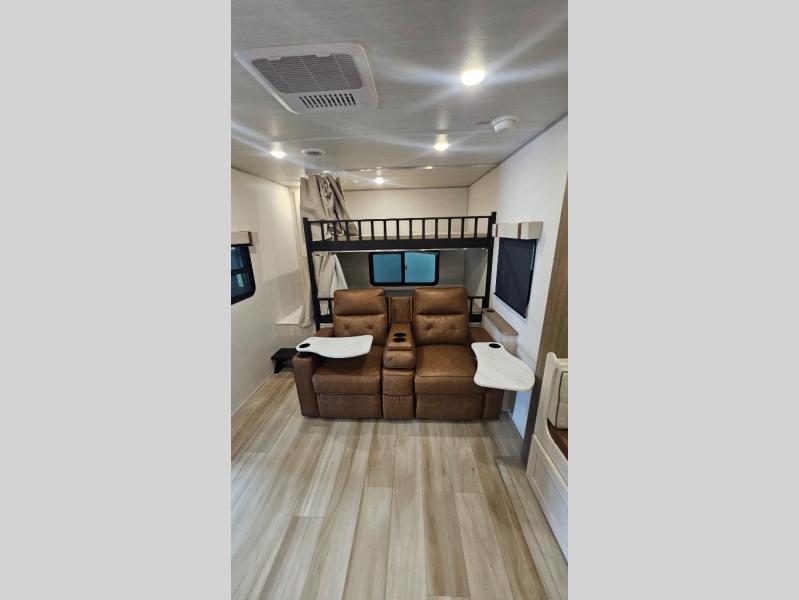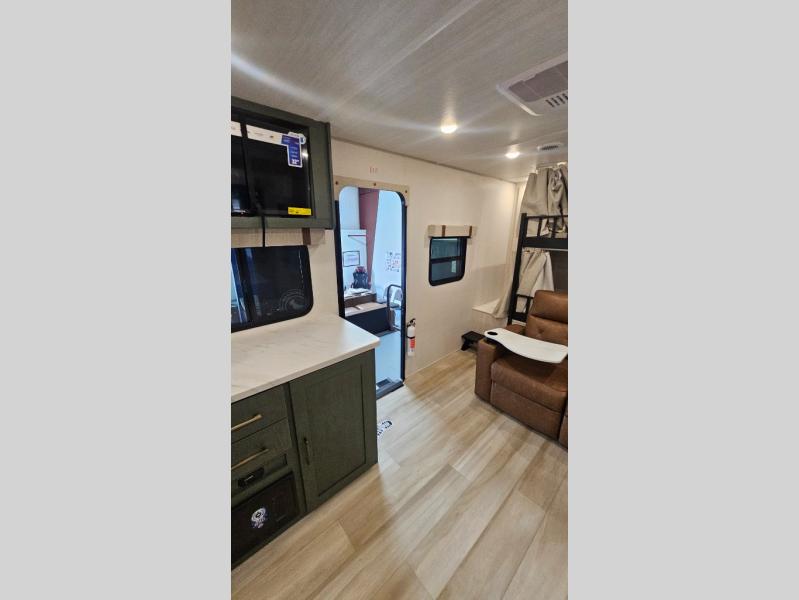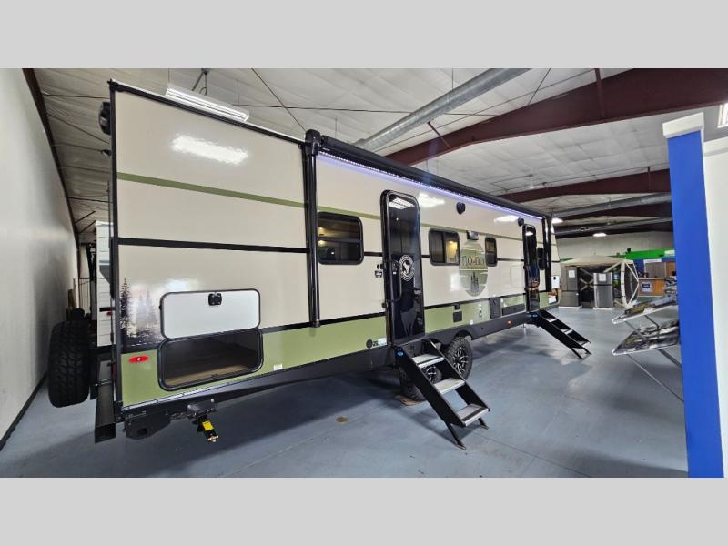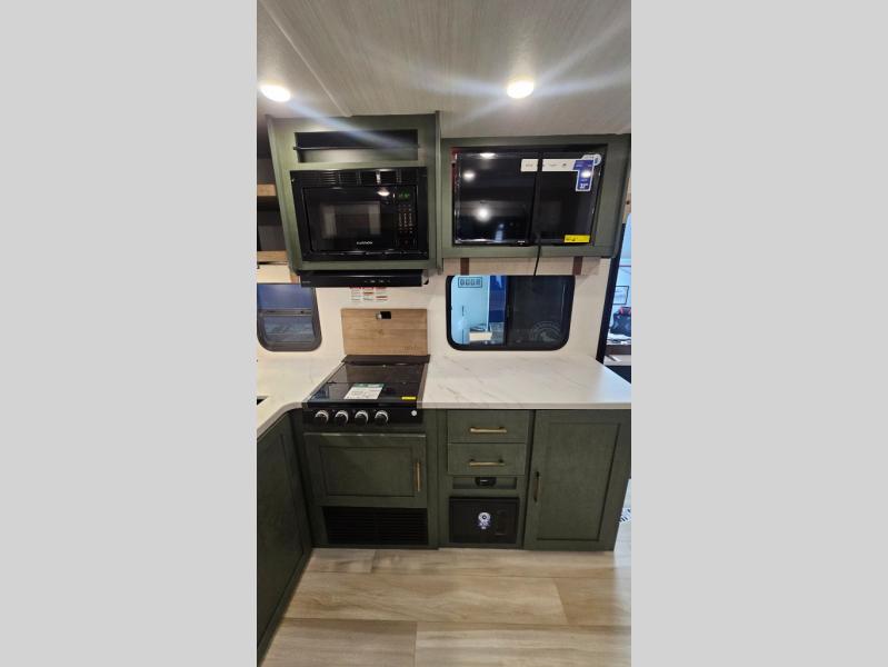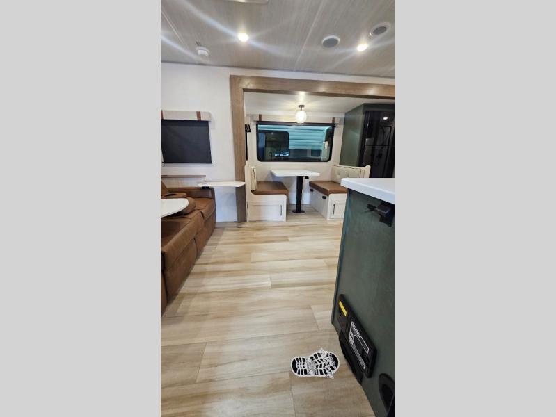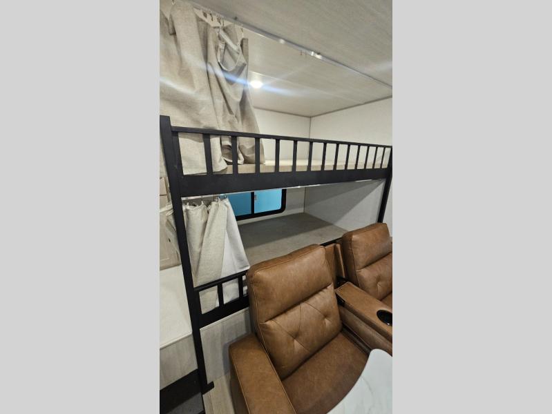 It will be so easy to enjoy camping trips in this No Boundaries travel trailer! The front master bedroom includes one of the dual entry doors so you can slip out early for a morning run without waking anyone else up. When you return, you can freshen up in the walk-thru bath, then head to the kitchen to make breakfast. There is also an outside kitchen so you can cook in the fresh mountain air. A booth dinette provides a place to dine together, and the sofa will be the perfect place to relax. There are also double-size bunks in the back with a wardrobe for your guests' things!