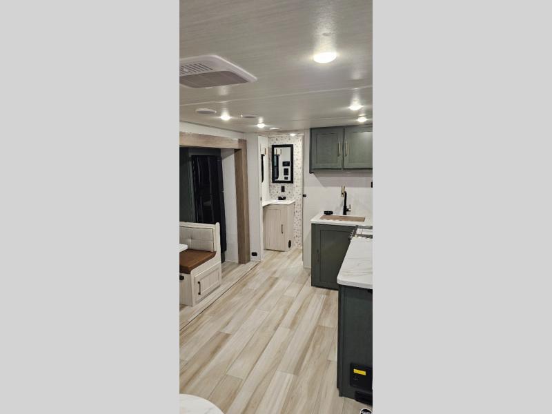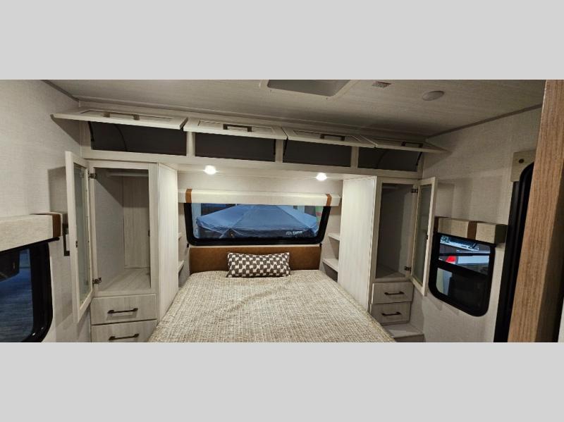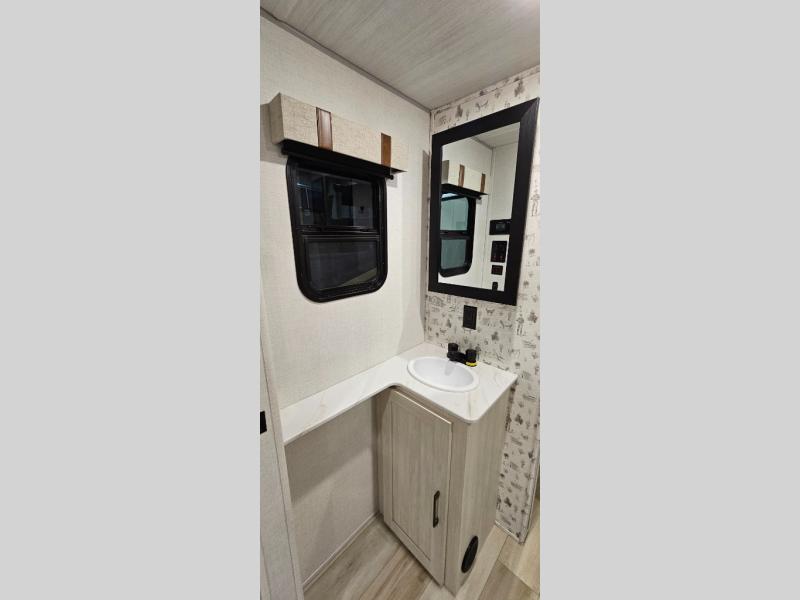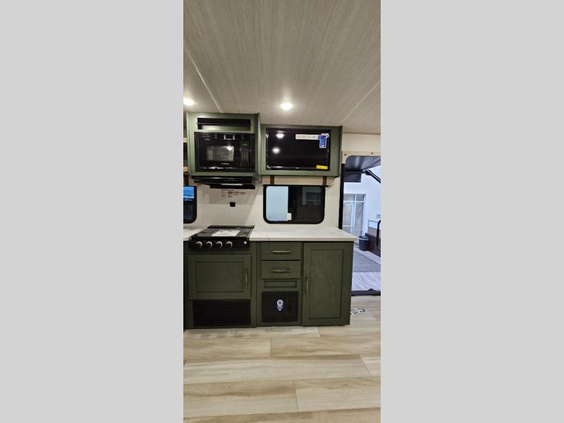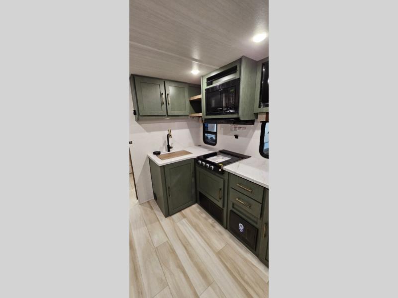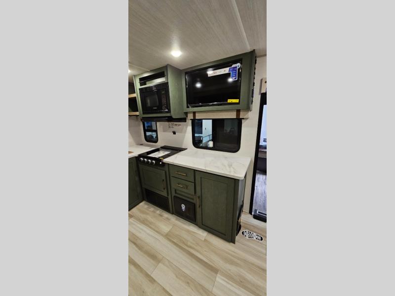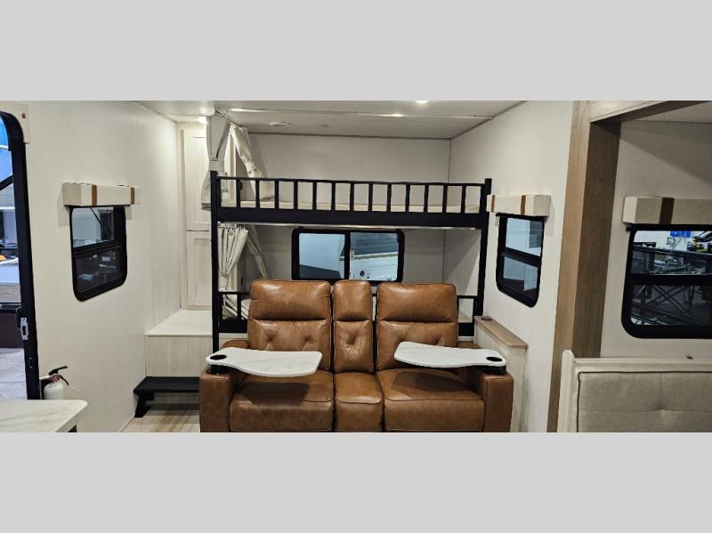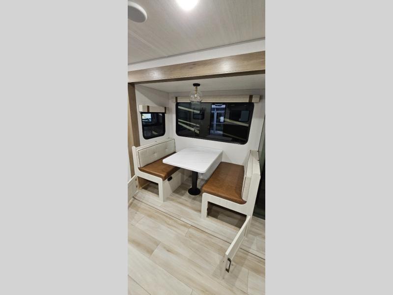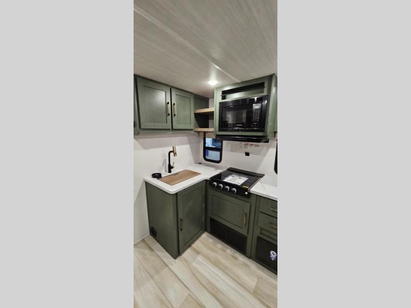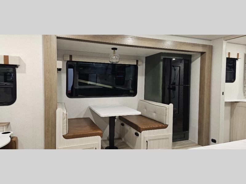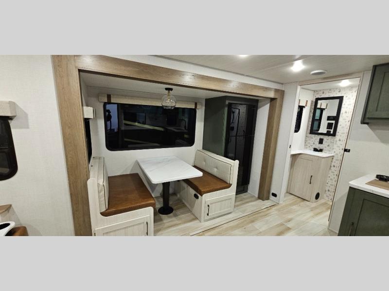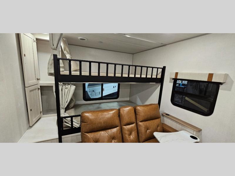 It will be so easy to enjoy camping trips in this No Boundaries travel trailer! The front master bedroom includes one of the dual entry doors so you can slip out early for a morning run without waking anyone else up. When you return, you can freshen up in the walk-thru bath, then head to the kitchen to make breakfast. There is also an outside kitchen so you can cook in the fresh mountain air. A booth dinette provides a place to dine together, and the sofa will be the perfect place to relax. There are also double-size bunks in the back with a wardrobe for your guests' things!