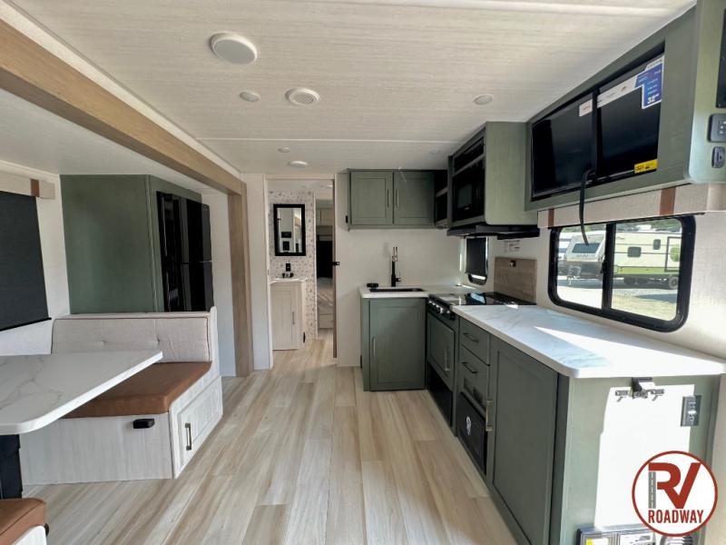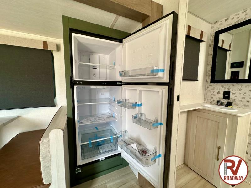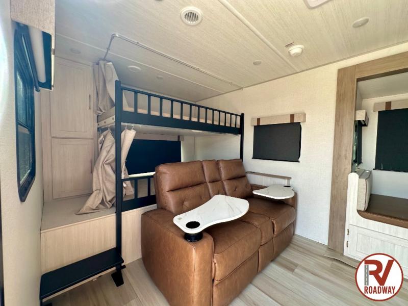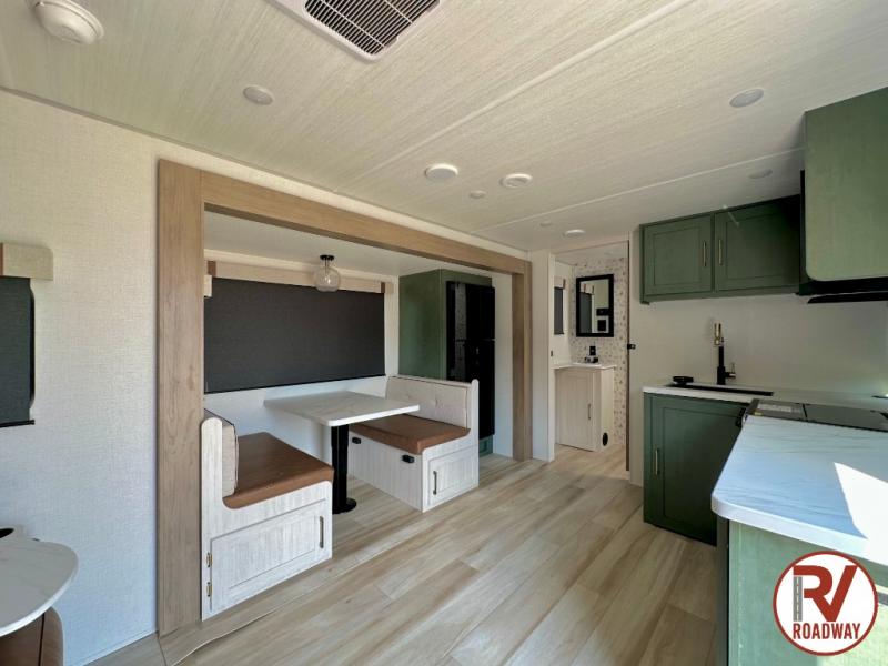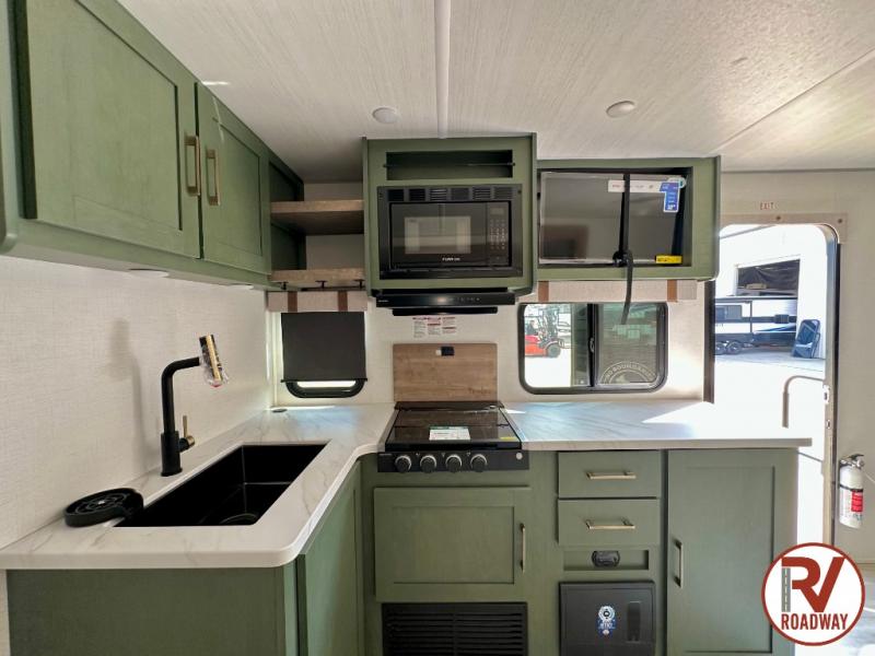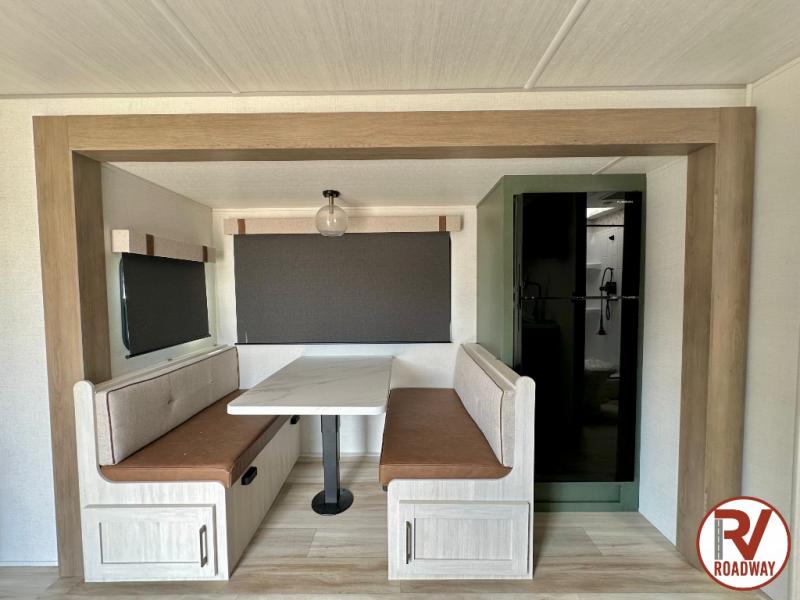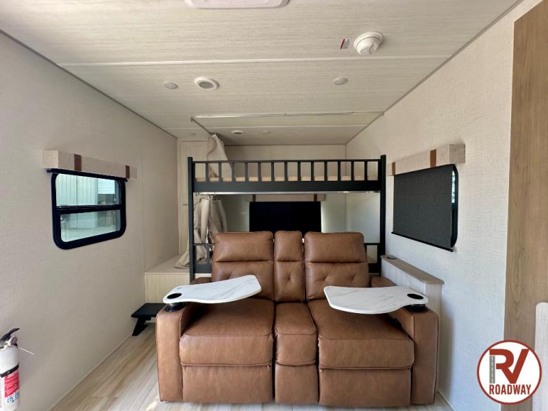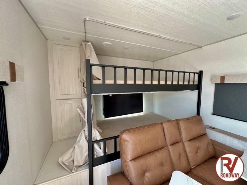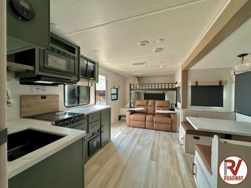 It will be so easy to enjoy camping trips in this No Boundaries travel trailer! The front master bedroom includes one of the dual entry doors so you can slip out early for a morning run without waking anyone else up. When you return, you can freshen up in the walk-thru bath, then head to the kitchen to make breakfast. There is also an outside kitchen so you can cook in the fresh mountain air. A booth dinette provides a place to dine together, and the sofa will be the perfect place to relax. There are also double-size bunks in the back with a wardrobe for your guests' things!