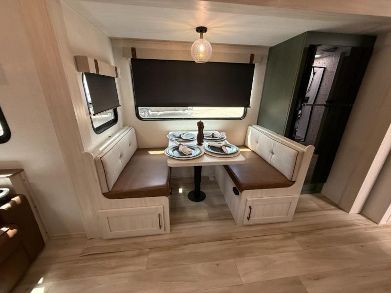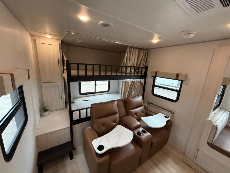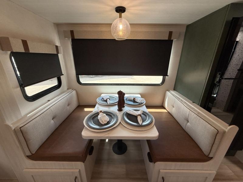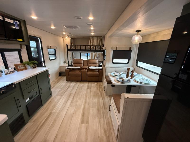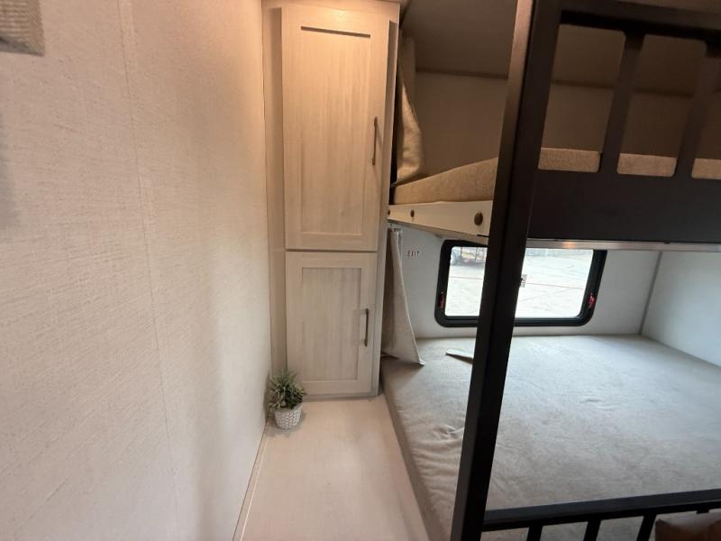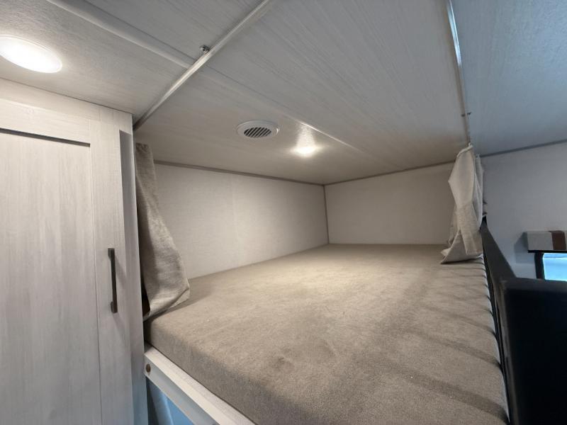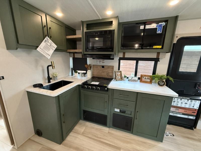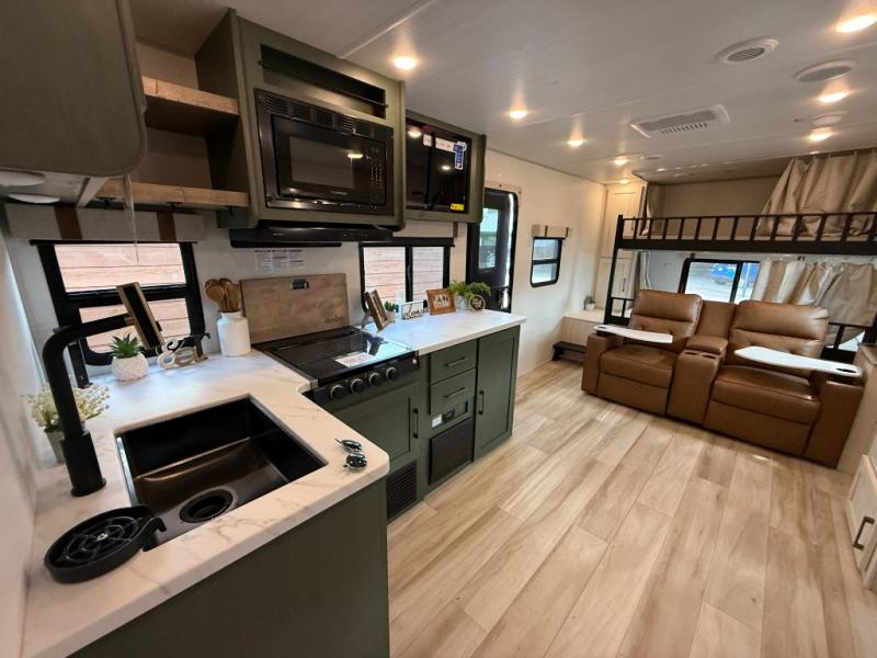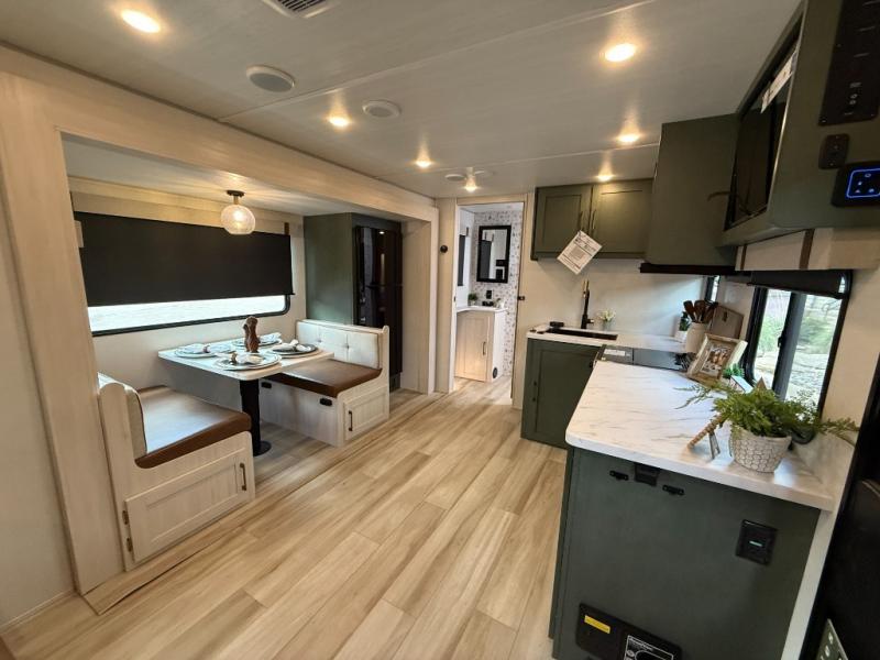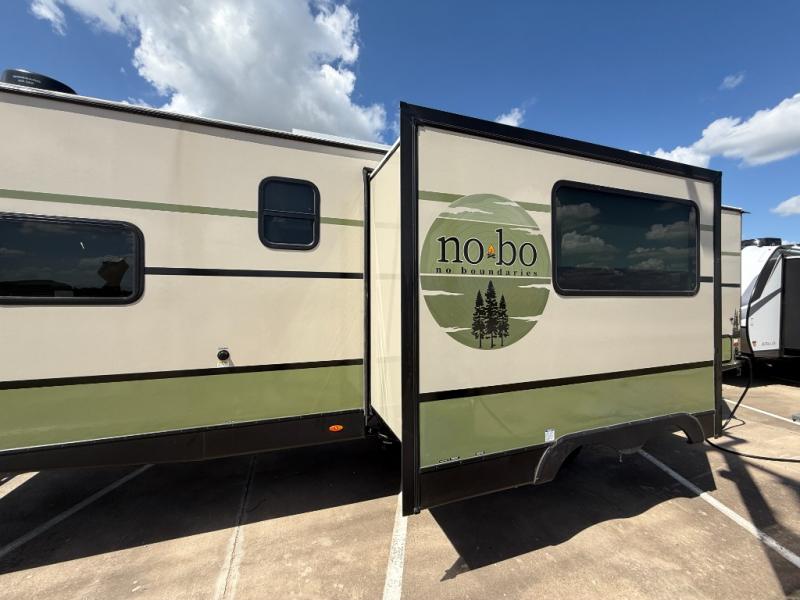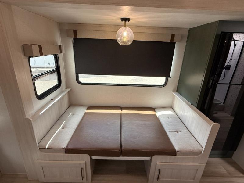 It will be so easy to enjoy camping trips in this No Boundaries travel trailer! The front master bedroom includes one of the dual entry doors so you can slip out early for a morning run without waking anyone else up. When you return, you can freshen up in the walk-thru bath, then head to the kitchen to make breakfast. There is also an outside kitchen so you can cook in the fresh mountain air. A booth dinette provides a place to dine together, and the sofa will be the perfect place to relax. There are also double-size bunks in the back with a wardrobe for your guests' things!