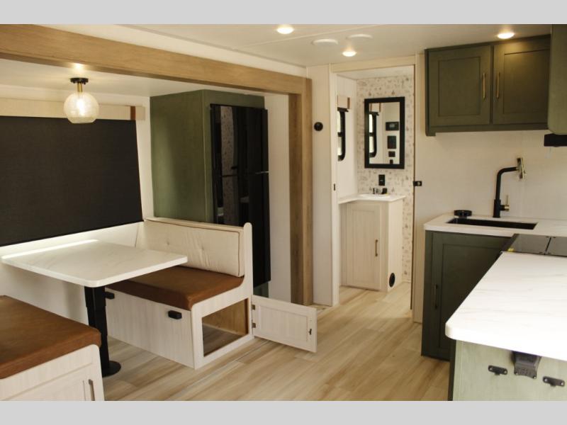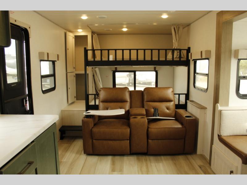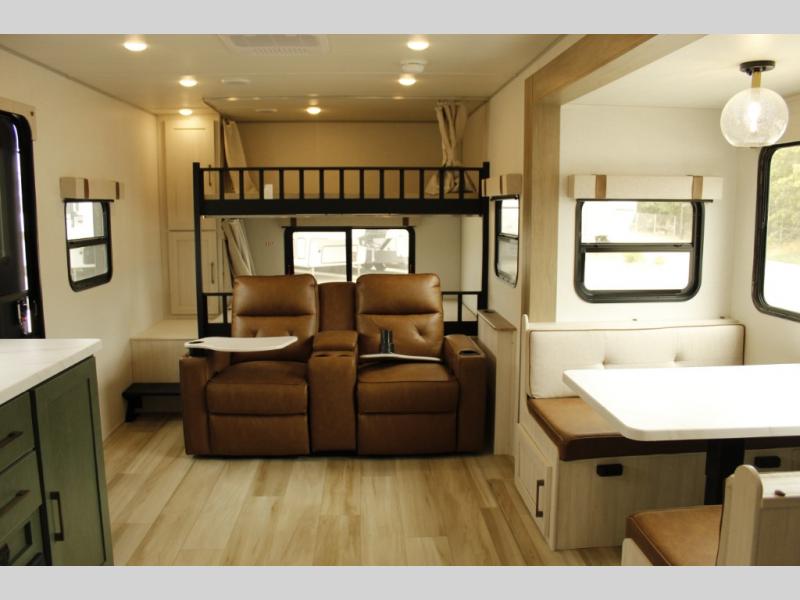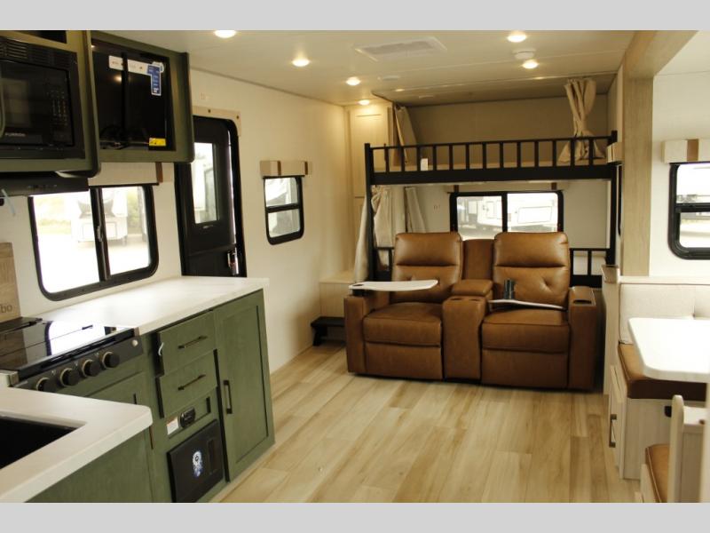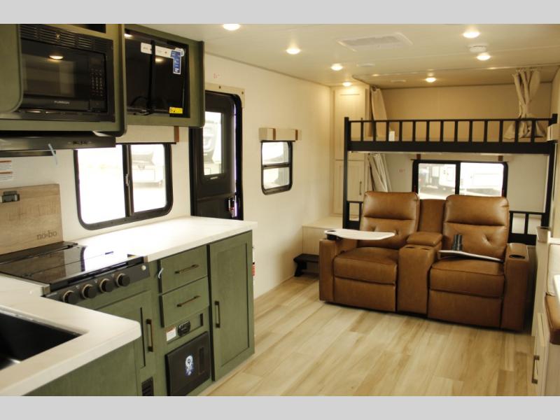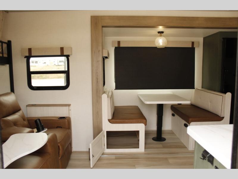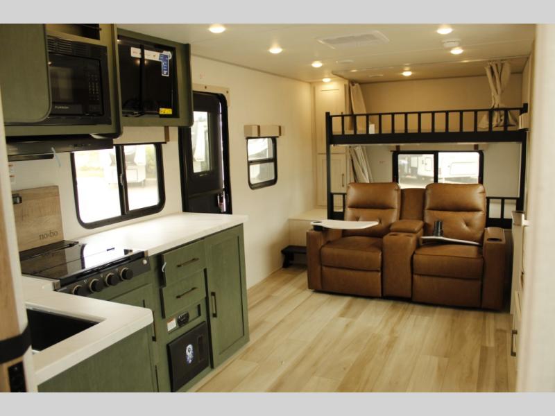 It will be so easy to enjoy camping trips in this No Boundaries travel trailer! The front master bedroom includes one of the dual entry doors so you can slip out early for a morning run without waking anyone else up. When you return, you can freshen up in the walk-thru bath, then head to the kitchen to make breakfast. There is also an outside kitchen so you can cook in the fresh mountain air. A booth dinette provides a place to dine together, and the sofa will be the perfect place to relax. There are also double-size bunks in the back with a wardrobe for your guests' things!
