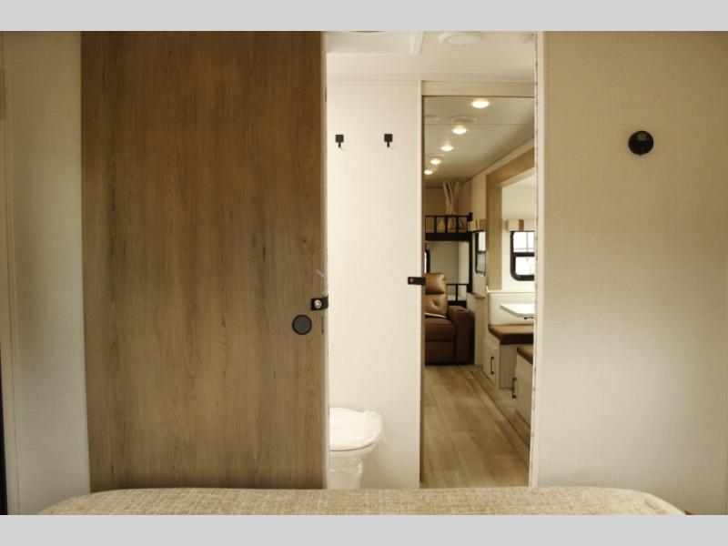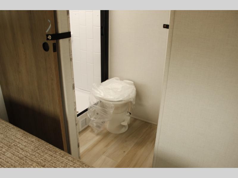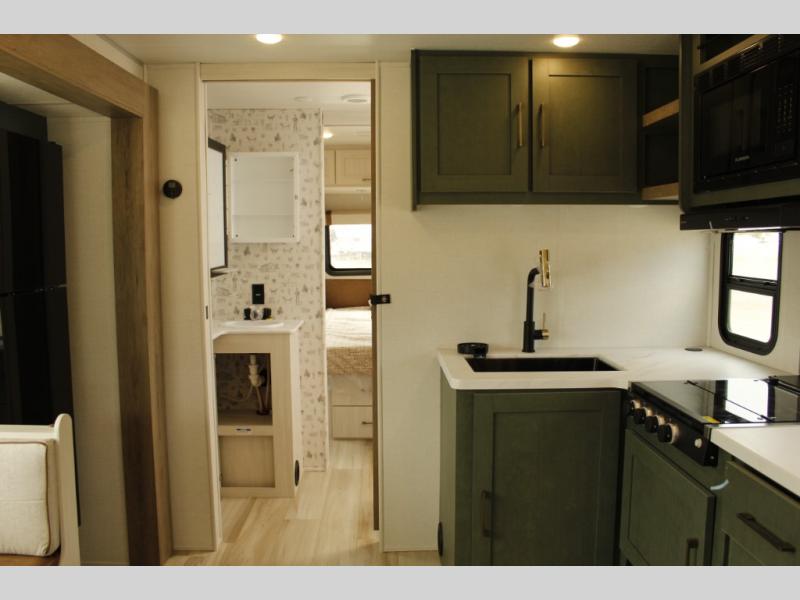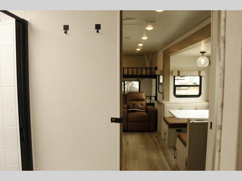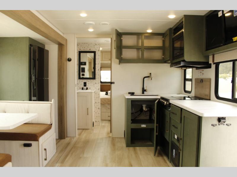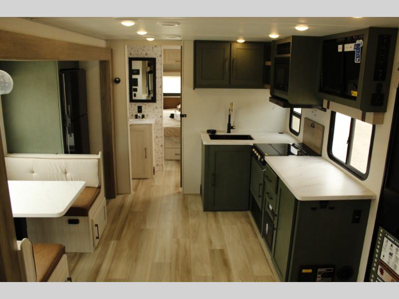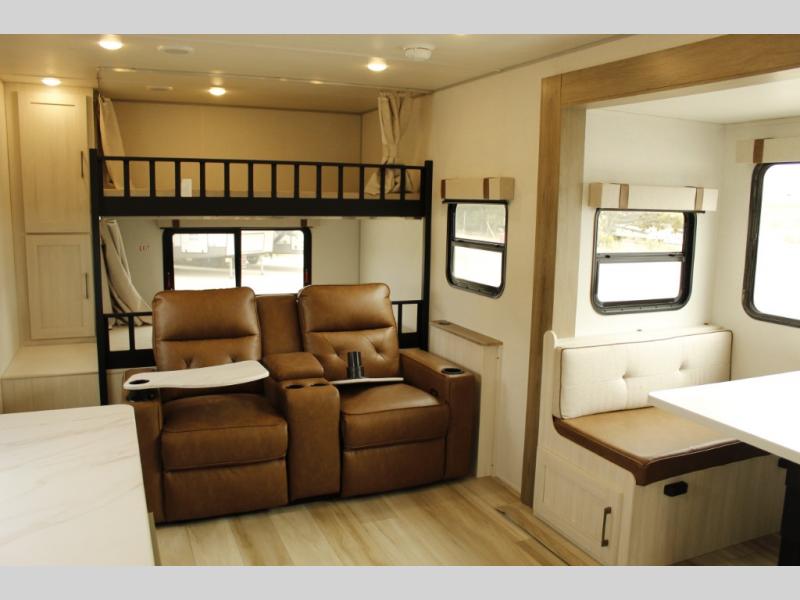 It will be so easy to enjoy camping trips in this No Boundaries travel trailer! The front master bedroom includes one of the dual entry doors so you can slip out early for a morning run without waking anyone else up. When you return, you can freshen up in the walk-thru bath, then head to the kitchen to make breakfast. There is also an outside kitchen so you can cook in the fresh mountain air. A booth dinette provides a place to dine together, and the sofa will be the perfect place to relax. There are also double-size bunks in the back with a wardrobe for your guests' things!
