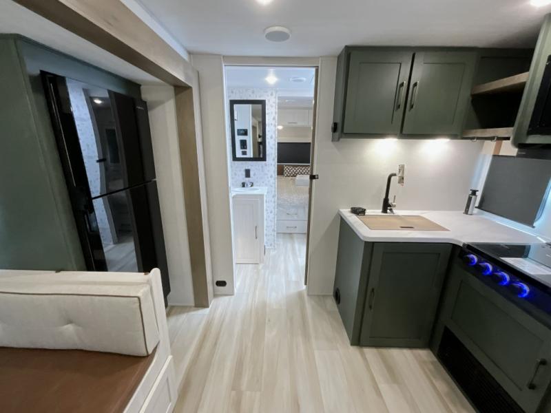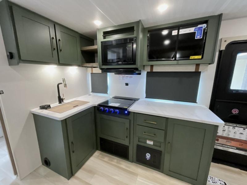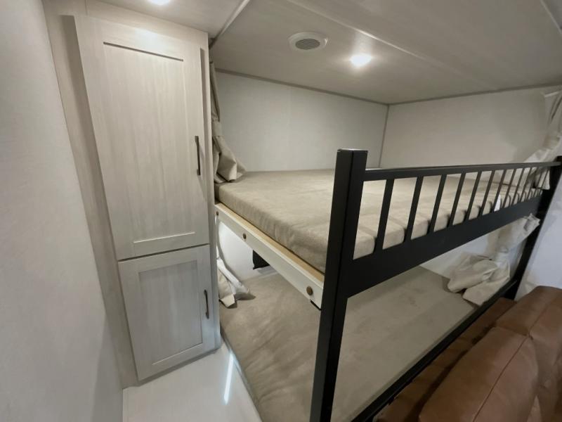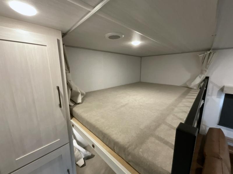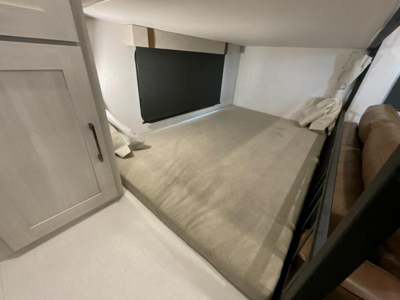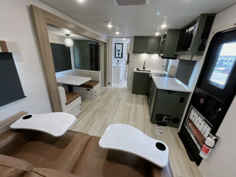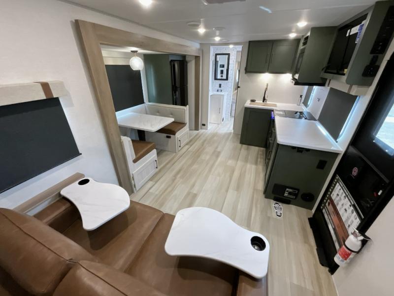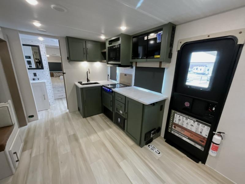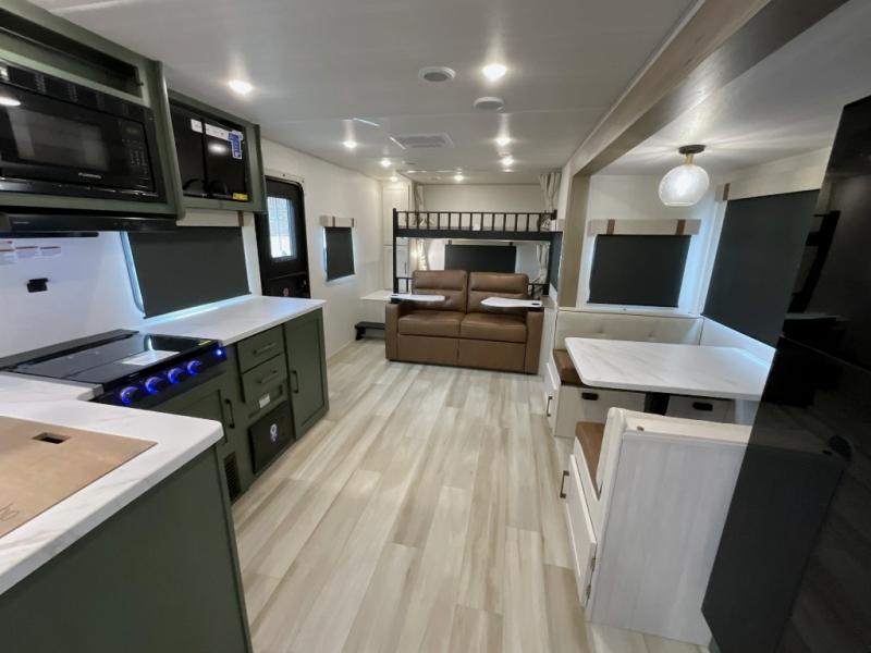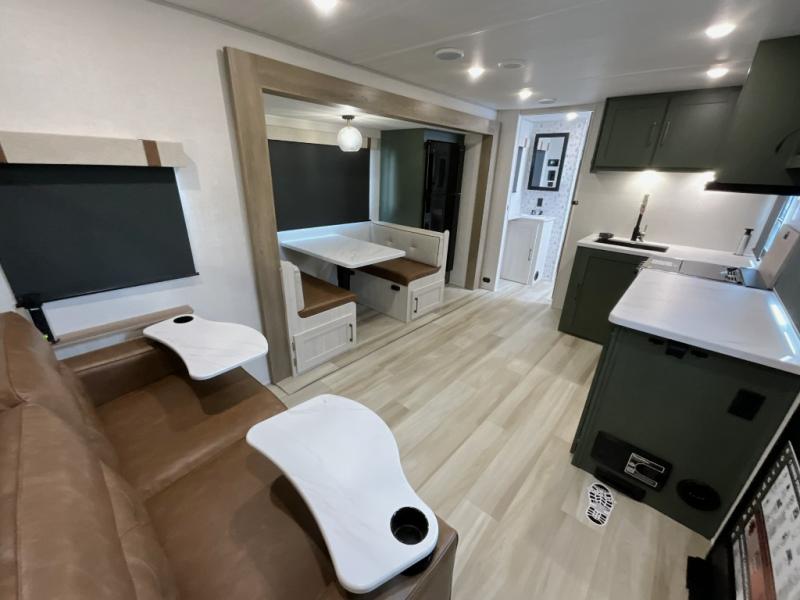 It will be so easy to enjoy camping trips in this No Boundaries travel trailer! The front master bedroom includes one of the dual entry doors so you can slip out early for a morning run without waking anyone else up. When you return, you can freshen up in the walk-thru bath, then head to the kitchen to make breakfast. There is also an outside kitchen so you can cook in the fresh mountain air. A booth dinette provides a place to dine together, and the sofa will be the perfect place to relax. There are also double-size bunks in the back with a wardrobe for your guests' things!