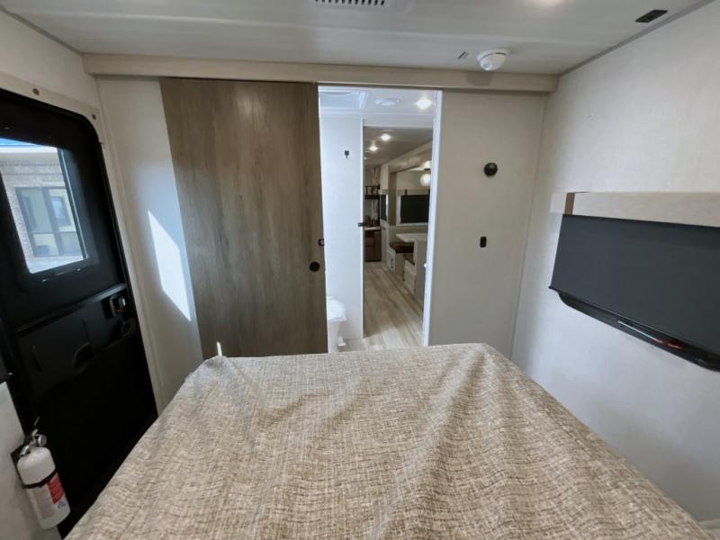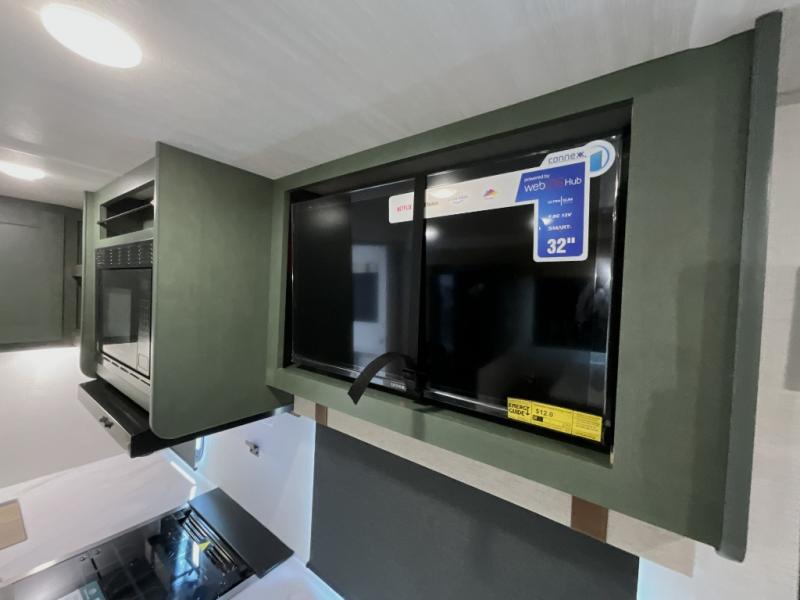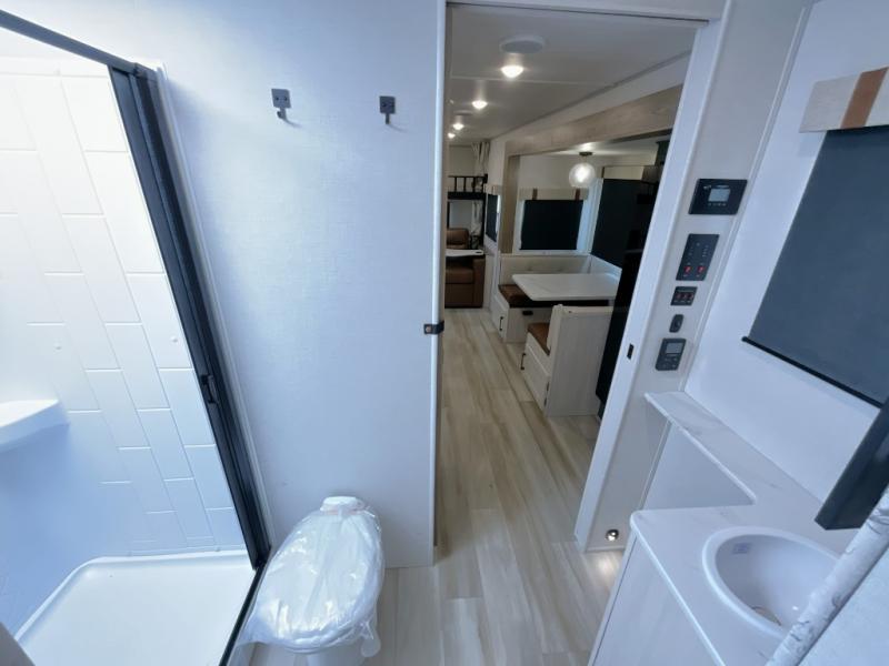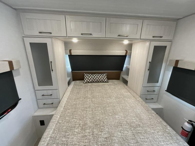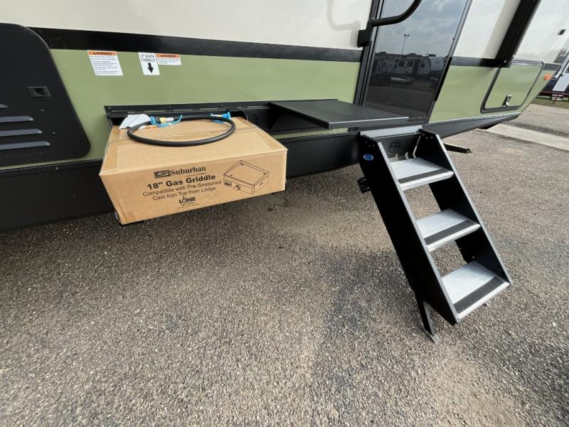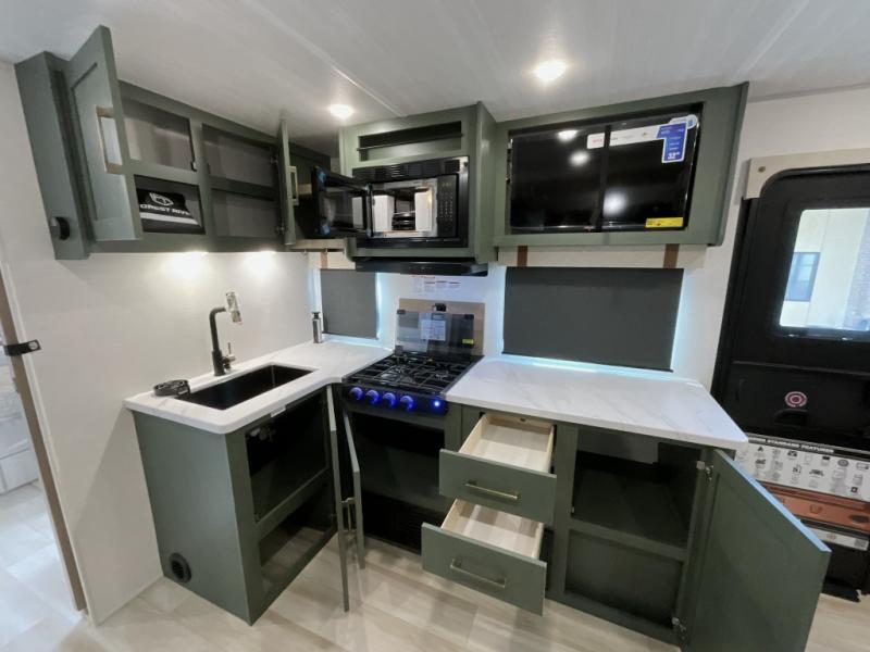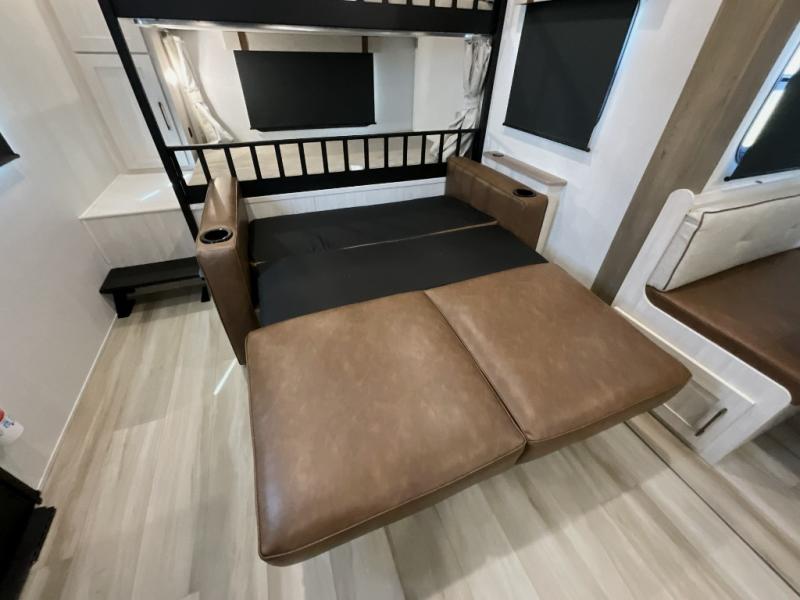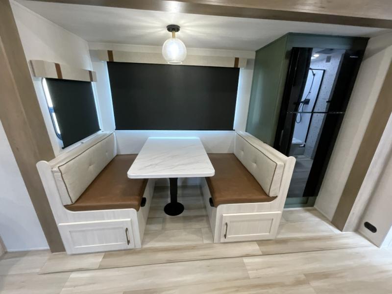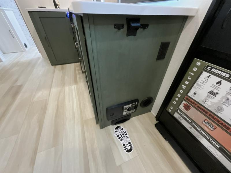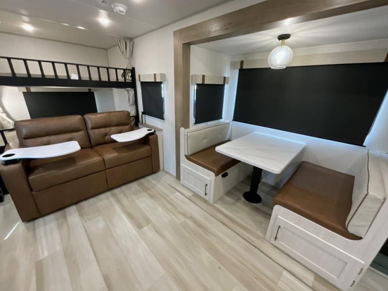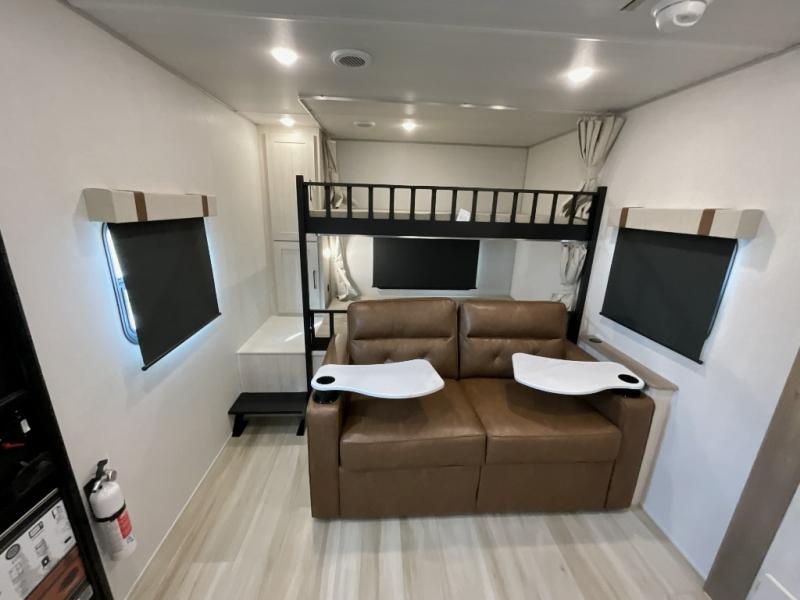 It will be so easy to enjoy camping trips in this No Boundaries travel trailer! The front master bedroom includes one of the dual entry doors so you can slip out early for a morning run without waking anyone else up. When you return, you can freshen up in the walk-thru bath, then head to the kitchen to make breakfast. There is also an outside kitchen so you can cook in the fresh mountain air. A booth dinette provides a place to dine together, and the sofa will be the perfect place to relax. There are also double-size bunks in the back with a wardrobe for your guests' things!
