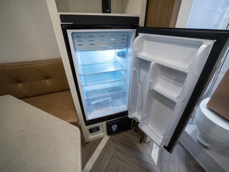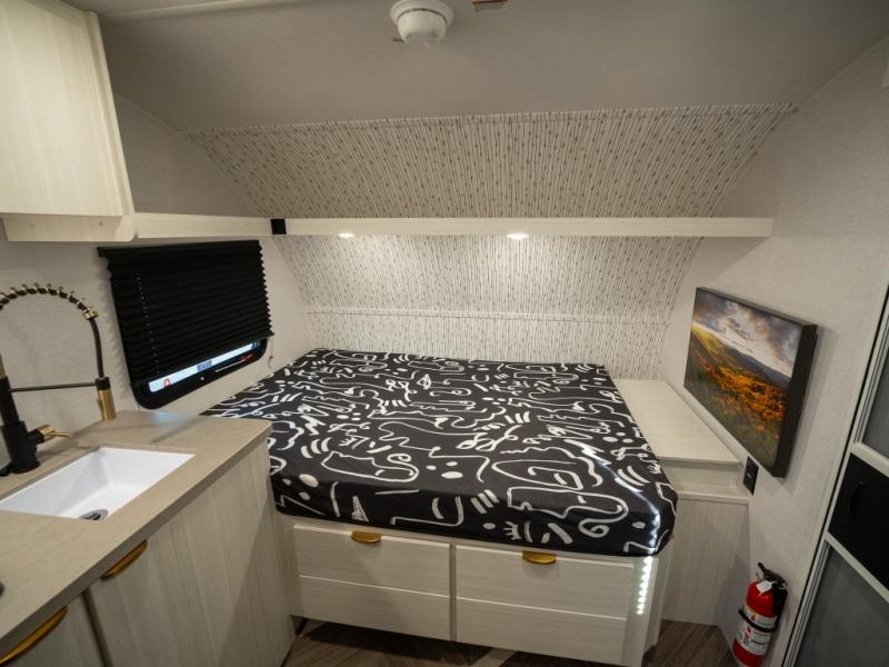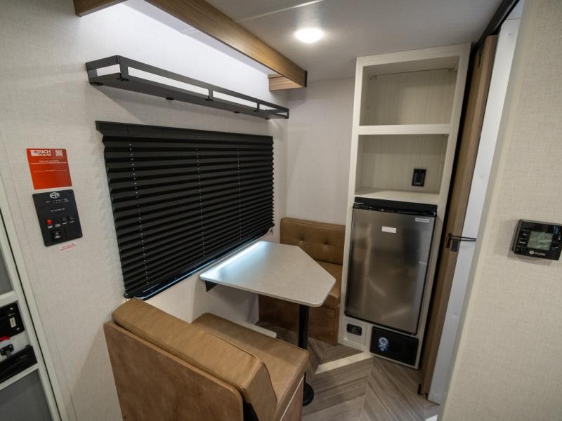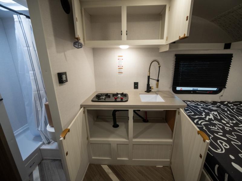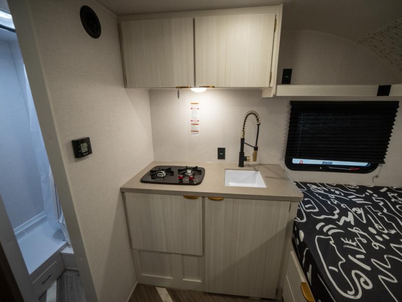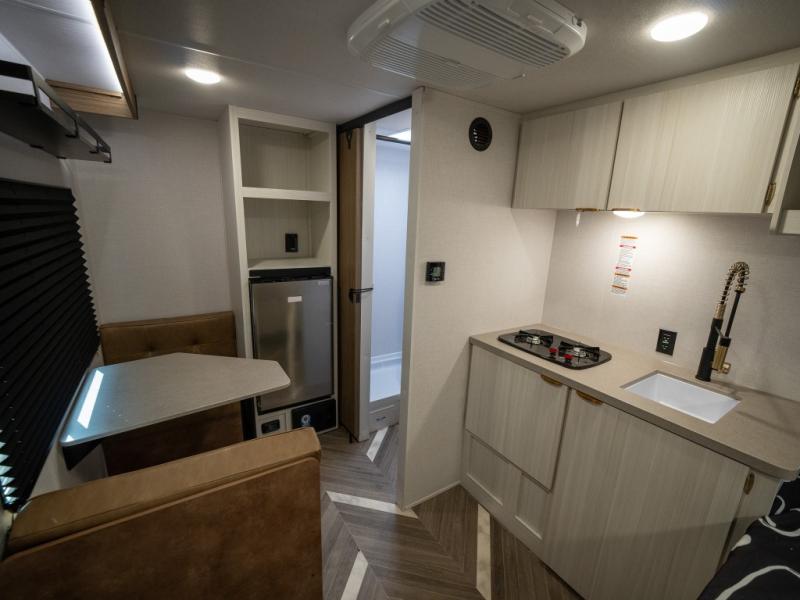 Step inside and you’re welcomed by a spacious queen bed positioned at the front, offering a cozy and restful retreat after a long day of adventure. Overhead cabinets provide convenient storage, while an additional compartment at the foot of the bed keeps your clothing and essentials neatly tucked away. Moving toward the center, you’ll find a compact yet mighty kitchen area designed for both function and comfort, featuring a high-rise kitchen faucet, a cooktop for preparing your favorite meals, and ample cabinet space above for all your cooking necessities. A nearby 12V refrigerator ensures your groceries stay fresh and easily accessible. At the rear corner, a versatile dinette creates the perfect spot to enjoy meals, play board games, or catch up on work. Opposite the dinette, the well-appointed bathroom includes a walk-in shower, giving you the convenience and privacy of your own facilities without relying on the campsite amenities.