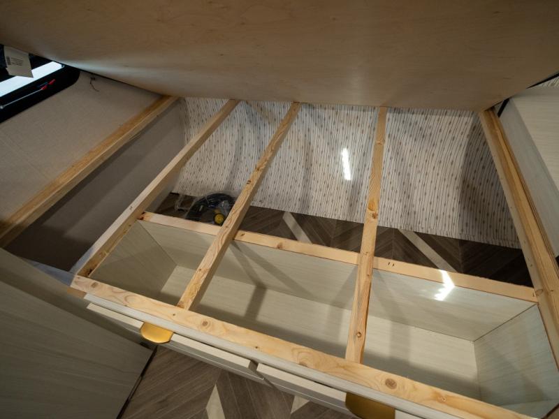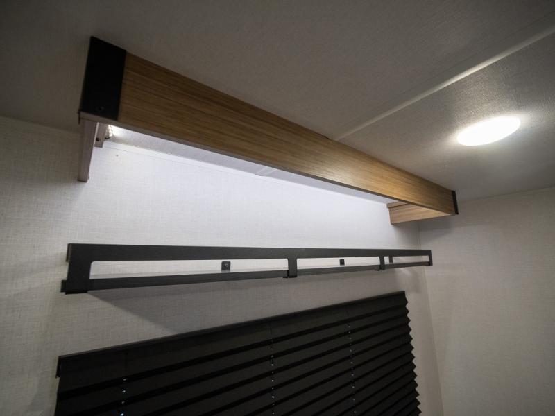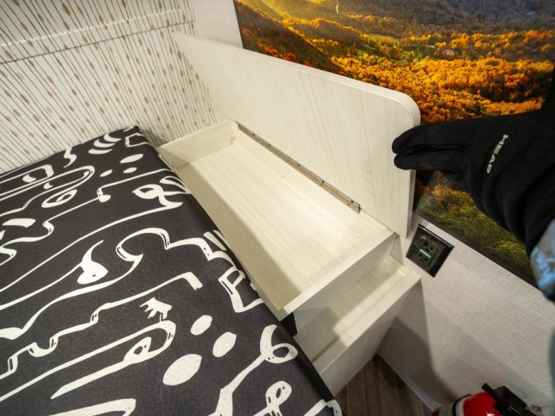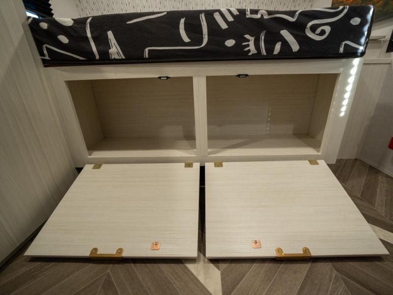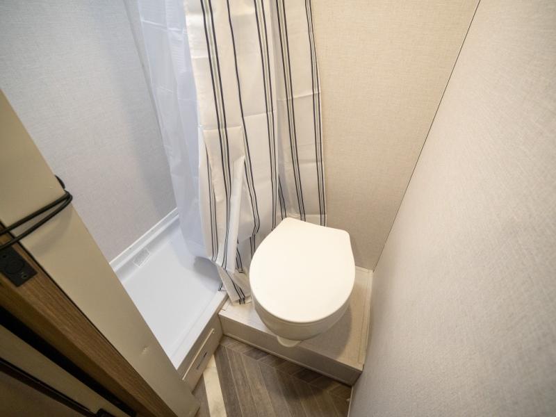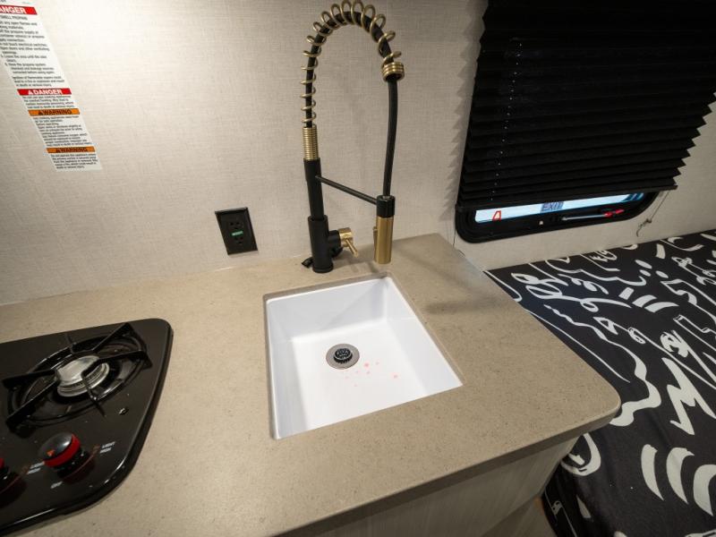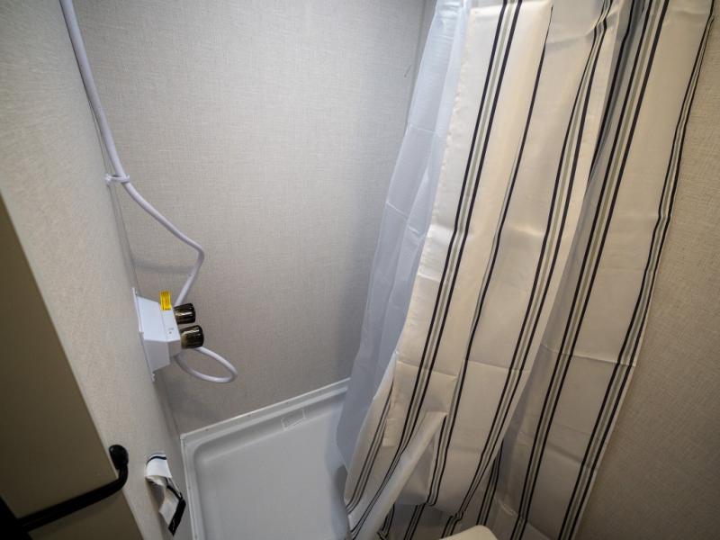 Step inside and you’re welcomed by a spacious queen bed positioned at the front, offering a cozy and restful retreat after a long day of adventure. Overhead cabinets provide convenient storage, while an additional compartment at the foot of the bed keeps your clothing and essentials neatly tucked away. Moving toward the center, you’ll find a compact yet mighty kitchen area designed for both function and comfort, featuring a high-rise kitchen faucet, a cooktop for preparing your favorite meals, and ample cabinet space above for all your cooking necessities. A nearby 12V refrigerator ensures your groceries stay fresh and easily accessible. At the rear corner, a versatile dinette creates the perfect spot to enjoy meals, play board games, or catch up on work. Opposite the dinette, the well-appointed bathroom includes a walk-in shower, giving you the convenience and privacy of your own facilities without relying on the campsite amenities.