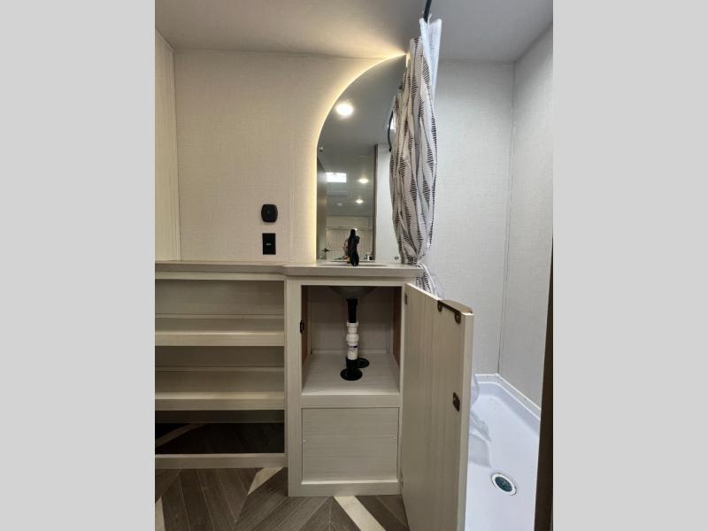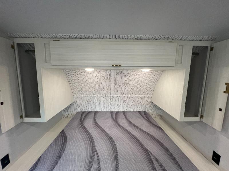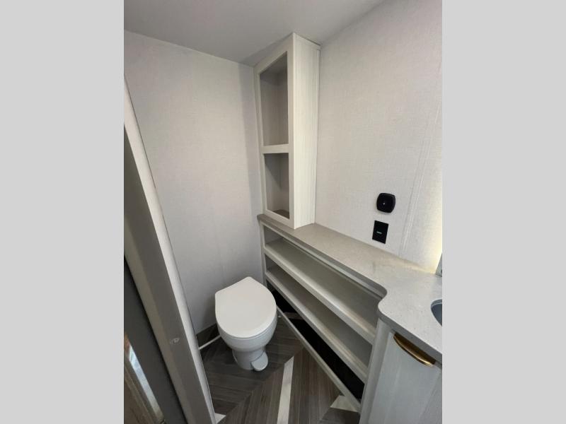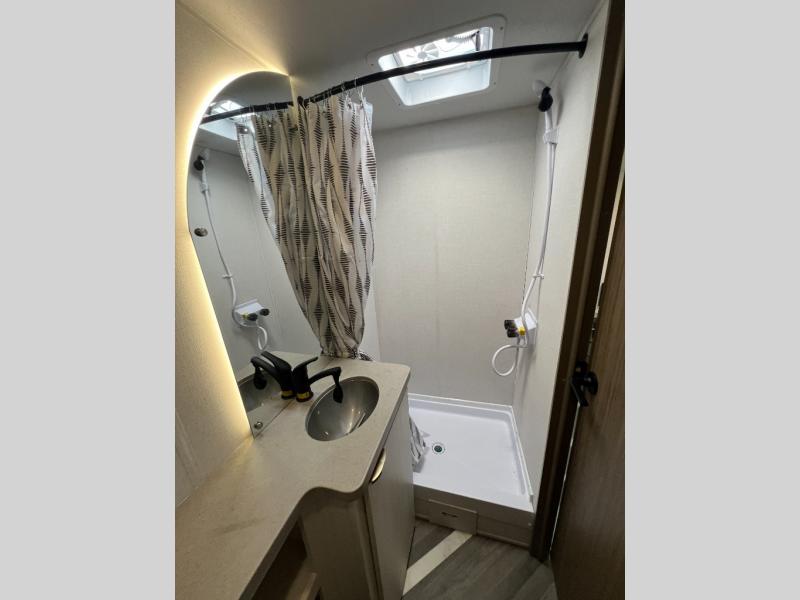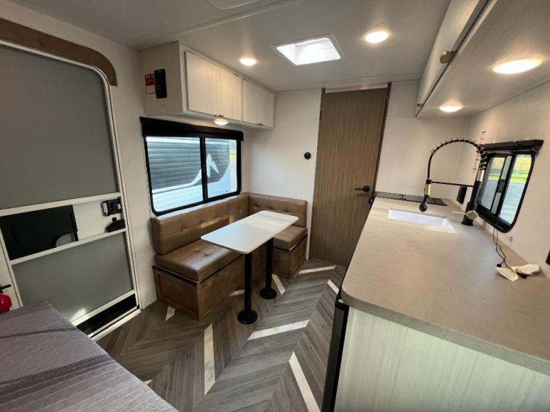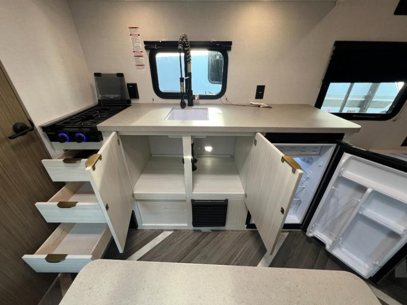 This Limited Edition travel trailer is the perfect couples coach! As you enter, the queen bed in front features dual wardrobes and an overhead space for your personal belongings. The middle L-shaped open lounge with a table provides a place to relax and let a guest sleep over, and across from here, the countertop which features a sink, counter space, and a two burner cooktop allows you to prepare meals and snacks easily. There is even a refrigerator for your perishables. You will also enjoy the full rear bath with shower to stay clean and generous bath counterspace. On the outside, an 8' 12V power awning will provide an outdoor living space you are sure to love as well!