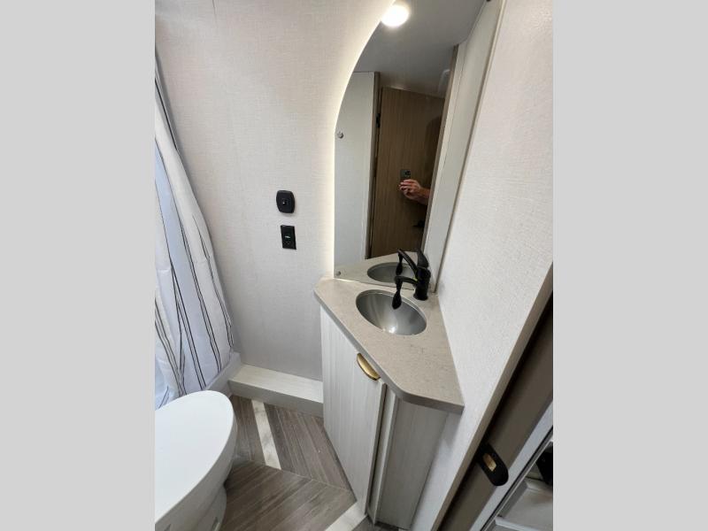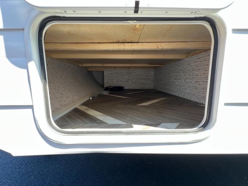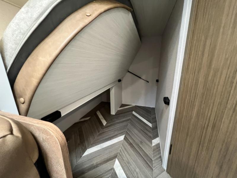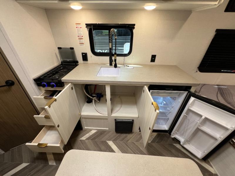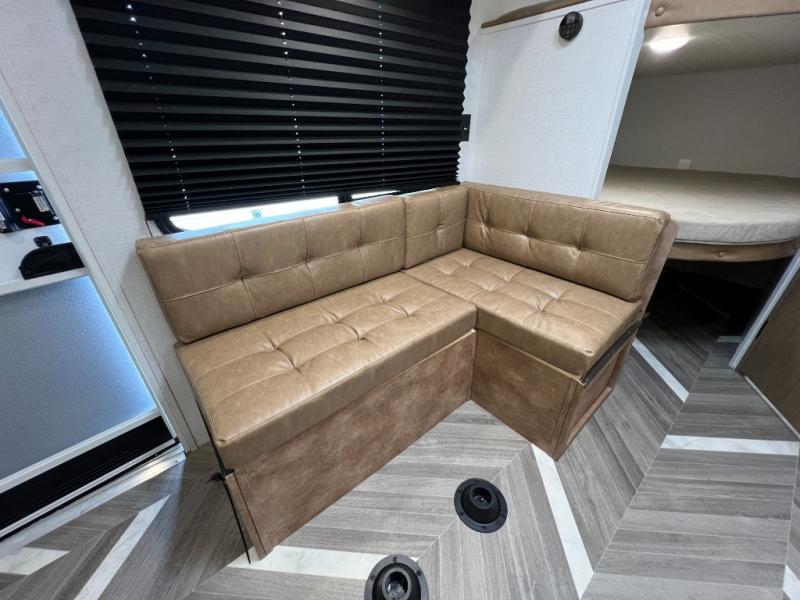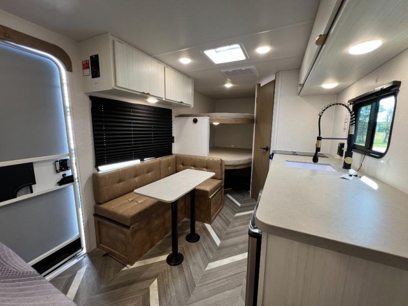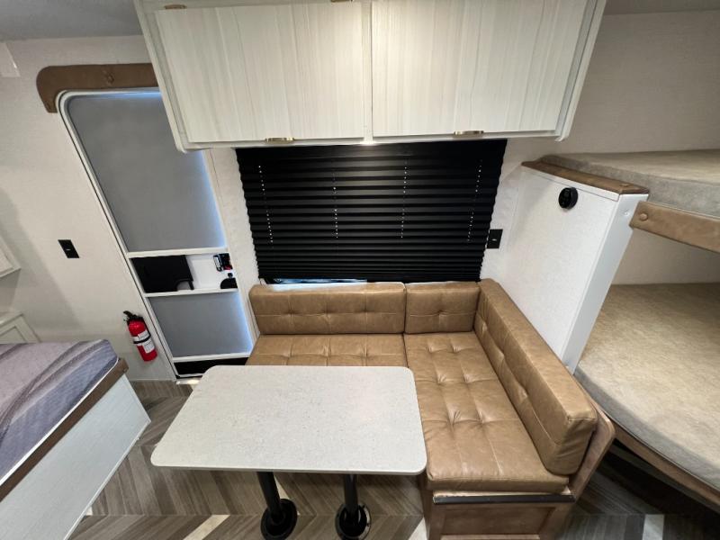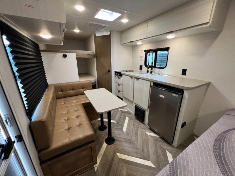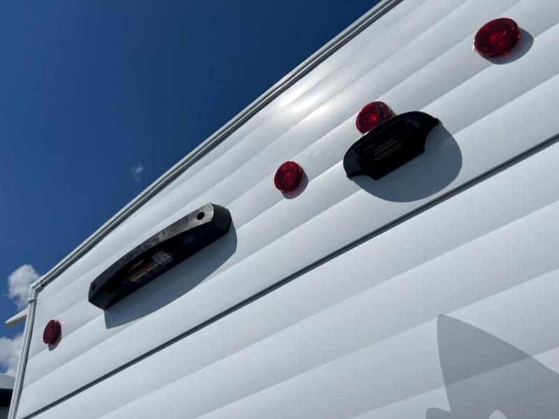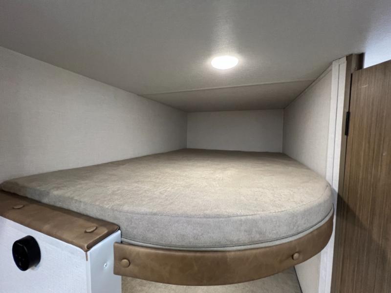 This Limited Edition travel trailer is perfect for your crew of seven thanks to the double-size bunks! You can take the front queen bed for yourselves, and any other guests can sleep on the L-shaped open lounge if needed. You will find a kitchen overhead cabinet for spices, and wardrobe by the bed for your clothes. Prepare all your meals in the fully-equipped kitchen that includes plenty of counter space and a refrigerator. On the outside, a 14' 12V power awning will provide an outdoor living space you are sure to love as well!