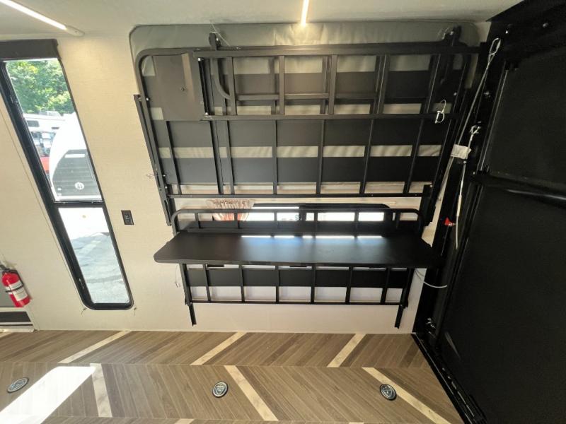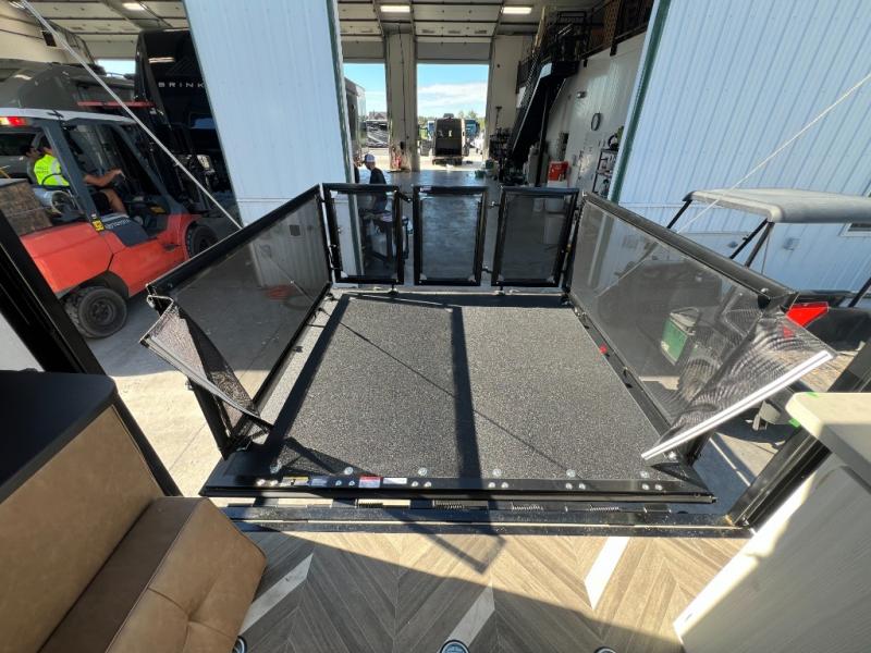 Load up your off-road toys with the ramp door into the 10' 5" garage area in this Ozark toy hauler! Once you reach your destination, unhook your toys from the tie-downs and rest on the comfortable bunk beds. The kitchen has everything you need to prepare your best home cooked meals including the deep stainless steel sink for an easy clean up and the 12V refrigerator. The full bathroom has a large shower pan so you can easily step in without worrying about a tub. Enjoy a good night's rest on the front queen bed, and there is a wardrobe to keep your clothes looking nice.