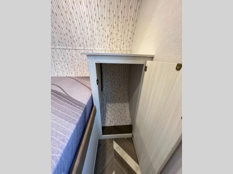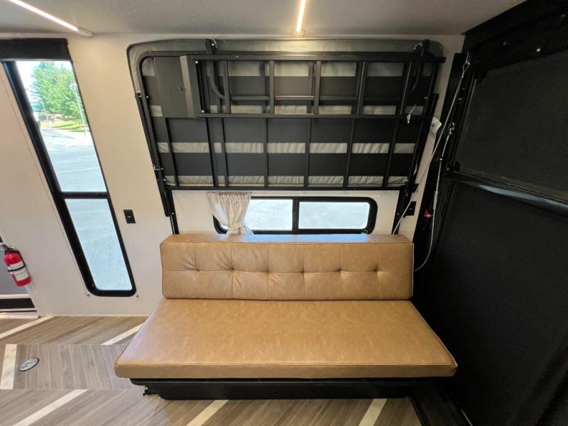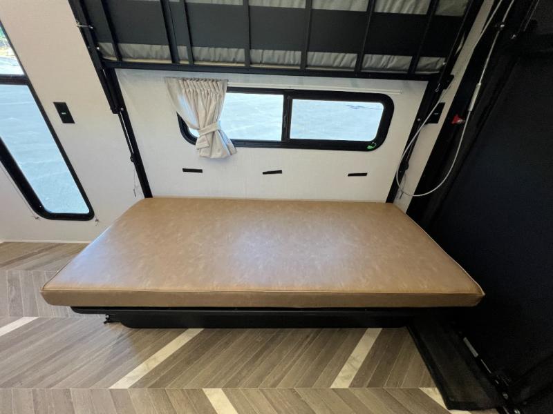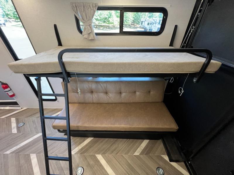 Load up your off-road toys with the ramp door into the 10' 5" garage area in this Ozark toy hauler! Once you reach your destination, unhook your toys from the tie-downs and rest on the comfortable bunk beds. The kitchen has everything you need to prepare your best home cooked meals including the deep stainless steel sink for an easy clean up and the 12V refrigerator. The full bathroom has a large shower pan so you can easily step in without worrying about a tub. Enjoy a good night's rest on the front queen bed, and there is a wardrobe to keep your clothes looking nice.