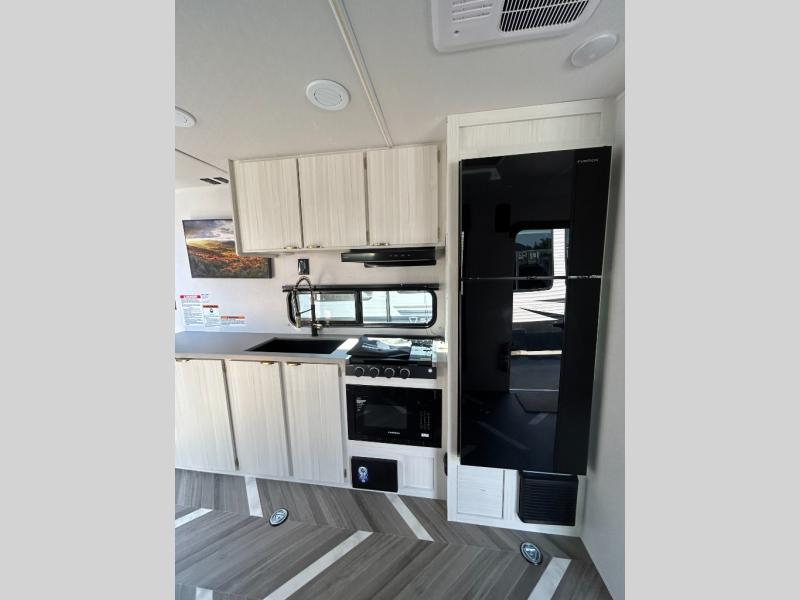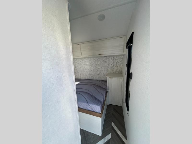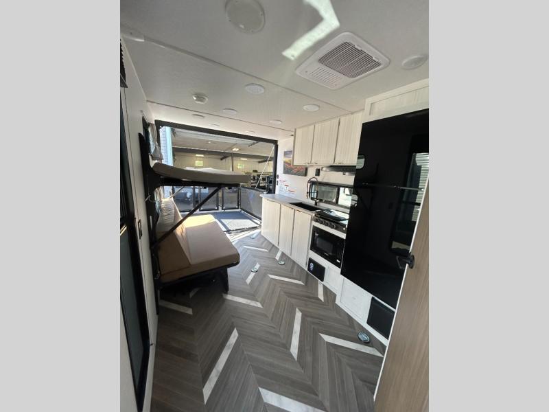 Load up your off-road toys with the ramp door into the 10' 5" garage area in this Ozark toy hauler! Once you reach your destination, unhook your toys from the tie-downs and set up the Stow N Load bunk system above the 30" x 72" sofa sleeper below. The kitchen has everything you need to prepare your best home cooked meals including the deep stainless steel sink for an easy clean up and the 12V refrigerator. The full bathroom has a large shower pan so you can easily step in without worrying about a tub. Enjoy a good night's rest on the front queen bed, and there is a wardrobe to keep your clothes looking nice.