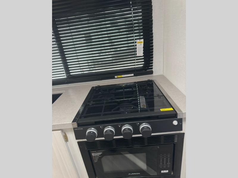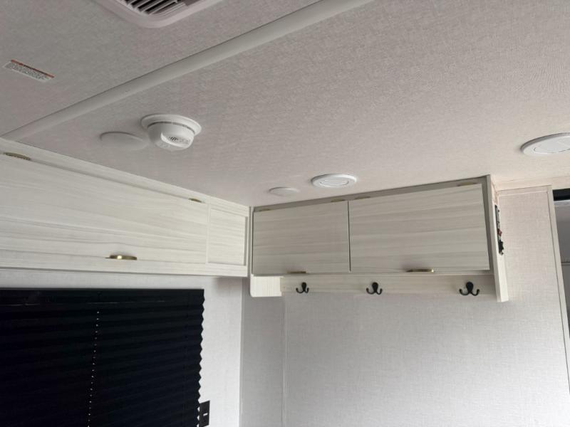 Escape the city life for weekends at the campground in this travel trailer for four. You will be pleased to find a king bed in the front private bedroom, along with dual bedroom wardrobes to keep your clothes tidy. The full rear bath includes dual bath sinks so you both can get ready at the same time, and there is a shower with a linen closet to keep clean towels close by. Your crew can relax on the L-shaped open lounge and removable table, and the chef of your group can keep themselves busy in the kitchen. There is a 3-in-1 cooktop with a convection oven, a pantry and 12V refrigerator for food storage.