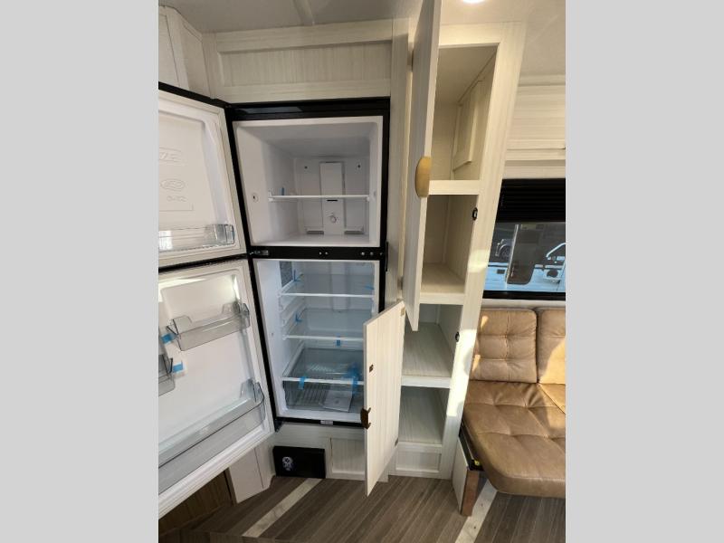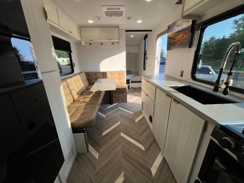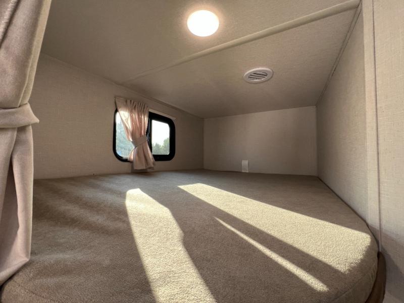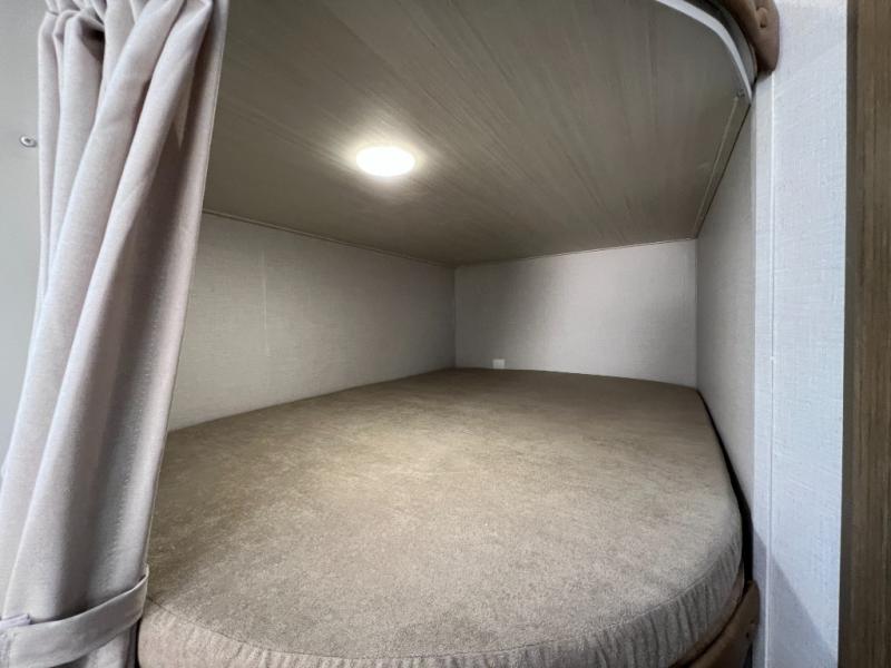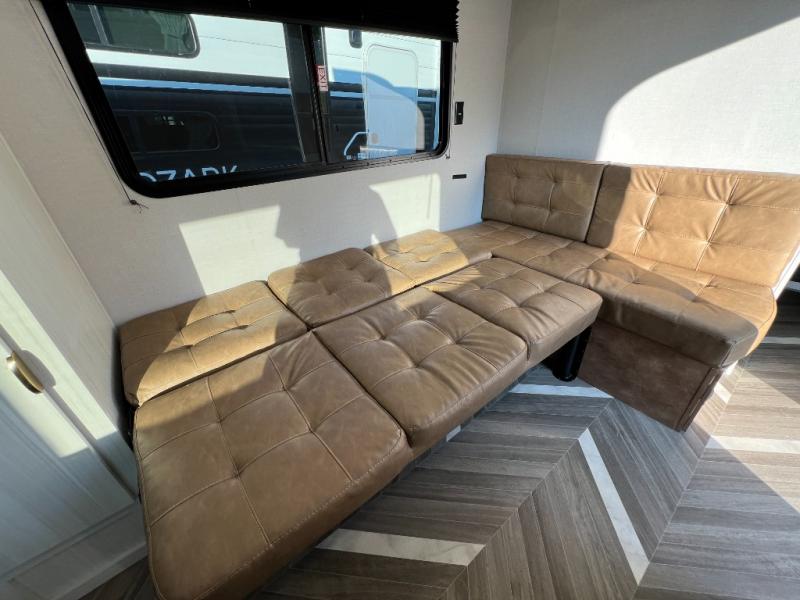 This trailer resembles the layout of 2300RB, but you'll enjoy added double-size bunks in the rear corner, with a full bath in the other rear corner! You'll have the front private bedroom all to yourselves with a king bed and dual wardrobes, and other guests can sleep on the L-shaped sofa when it's not being used to relax on. The kitchen on this Ozark includes a 3-in-1 cooktop with a convection microwave, and a window by the sink so you can have open views as you clean up. There is also a pantry and a 12V refrigerator to keep food stocked!