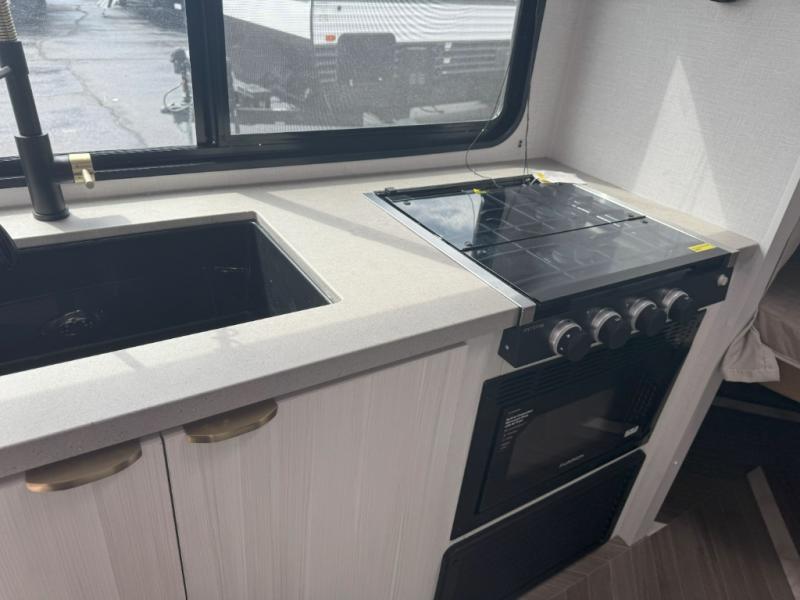 This trailer resembles the layout of 2300RB, but you'll enjoy added double-size bunks in the rear corner, with a full bath in the other rear corner! You'll have the front private bedroom all to yourselves with a king bed and dual wardrobes, and other guests can sleep on the L-shaped sofa when it's not being used to relax on. The kitchen on this Ozark includes a 3-in-1 cooktop with a convection microwave, and a window by the sink so you can have open views as you clean up. There is also a pantry and a 12V refrigerator to keep food stocked!