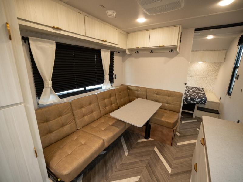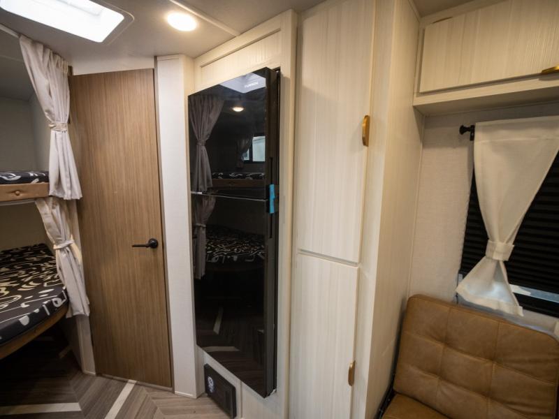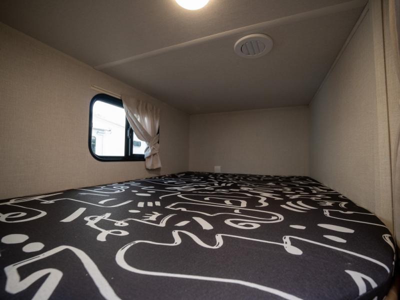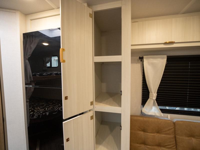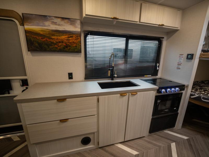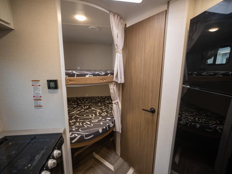 This trailer resembles the layout of 2300RB, but you'll enjoy added double-size bunks in the rear corner, with a full bath in the other rear corner! You'll have the front private bedroom all to yourselves with a king bed and dual wardrobes, and other guests can sleep on the L-shaped sofa when it's not being used to relax on. The kitchen on this Ozark includes a 3-in-1 cooktop with a convection microwave, and a window by the sink so you can have open views as you clean up. There is also a pantry and a 12V refrigerator to keep food stocked!