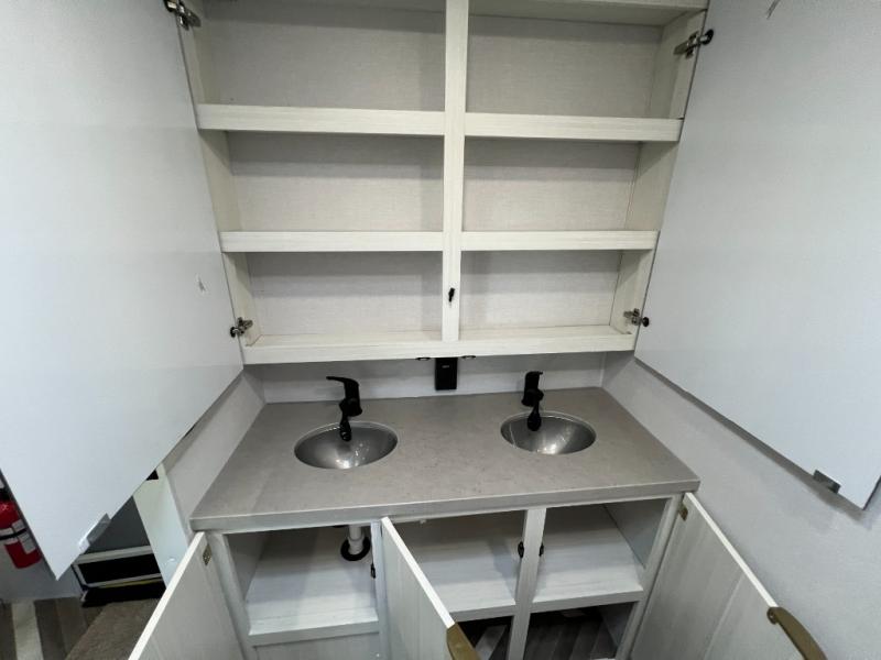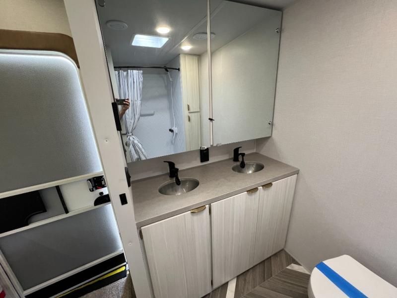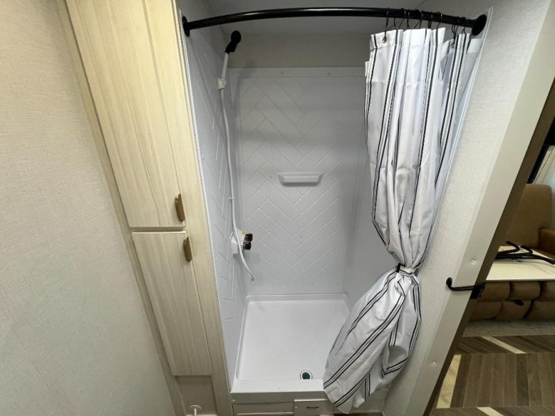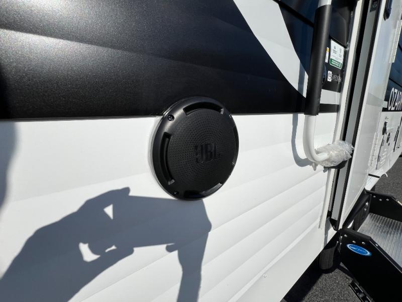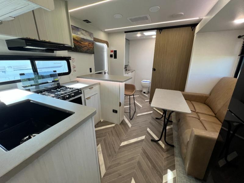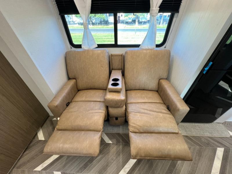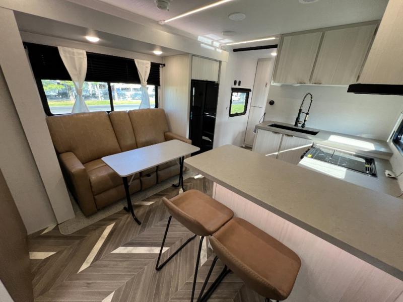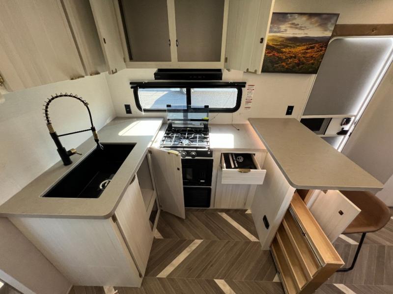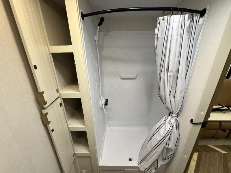 Whether you're camping in your own back yard or across the country, you'll find comfort in this spacious travel trailer. The full rear bath is not only spacious, but it's tucked away in the back for privacy. Your crew can get comfortable on the theater seating or head outdoors to relax under the 18' power awning. There is also a bar top with stools and a fully-equipped kitchen to make meals each day, or you can head outdoors to utilize the outdoor Quick Connect and 2X size camp refrigerator! When you're ready to call it a night, head to the front private bedroom for a great night's rest on the king bed that includes wardrobes on either side for your clothes.