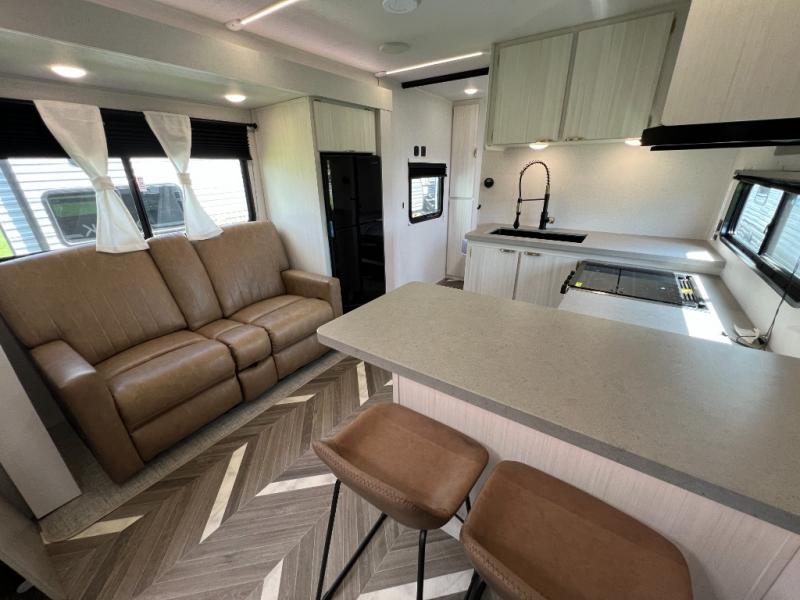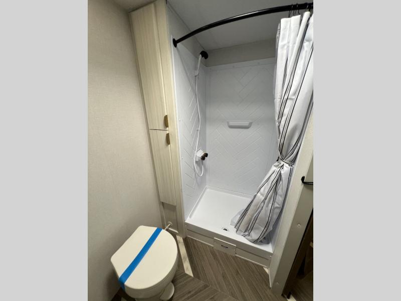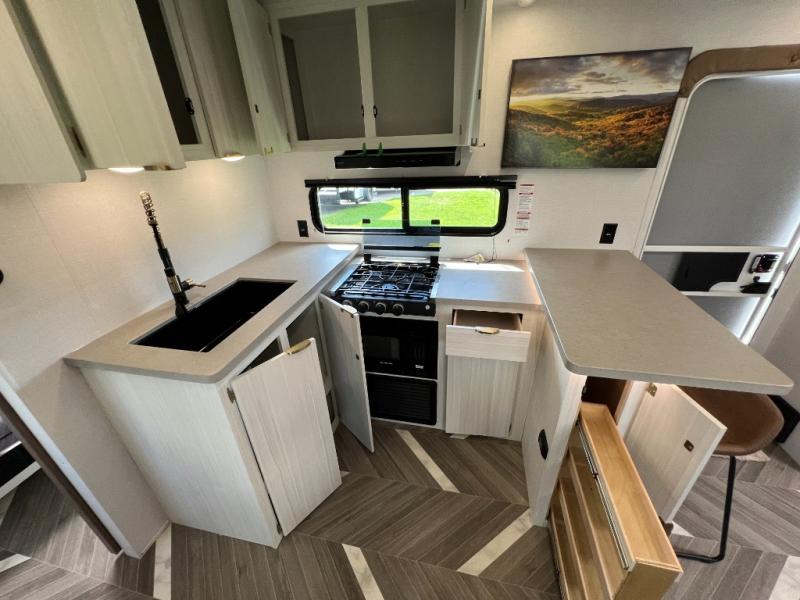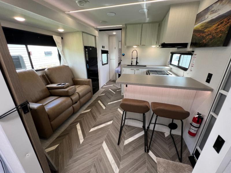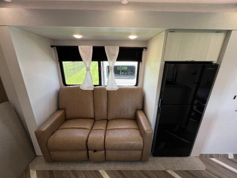 Whether you're camping in your own back yard or across the country, you'll find comfort in this spacious travel trailer. The full rear bath is not only spacious, but it's tucked away in the back for privacy. Your crew can get comfortable on the theater seating or head outdoors to relax under the 18' power awning. There is also a bar top with stools and a fully-equipped kitchen to make meals each day, or you can head outdoors to utilize the outdoor Quick Connect and 2X size camp refrigerator! When you're ready to call it a night, head to the front private bedroom for a great night's rest on the king bed that includes wardrobes on either side for your clothes.