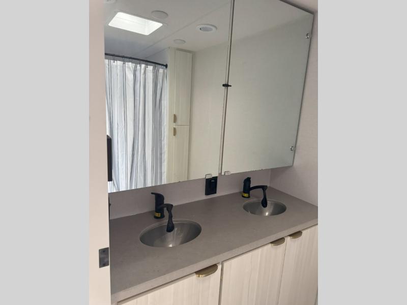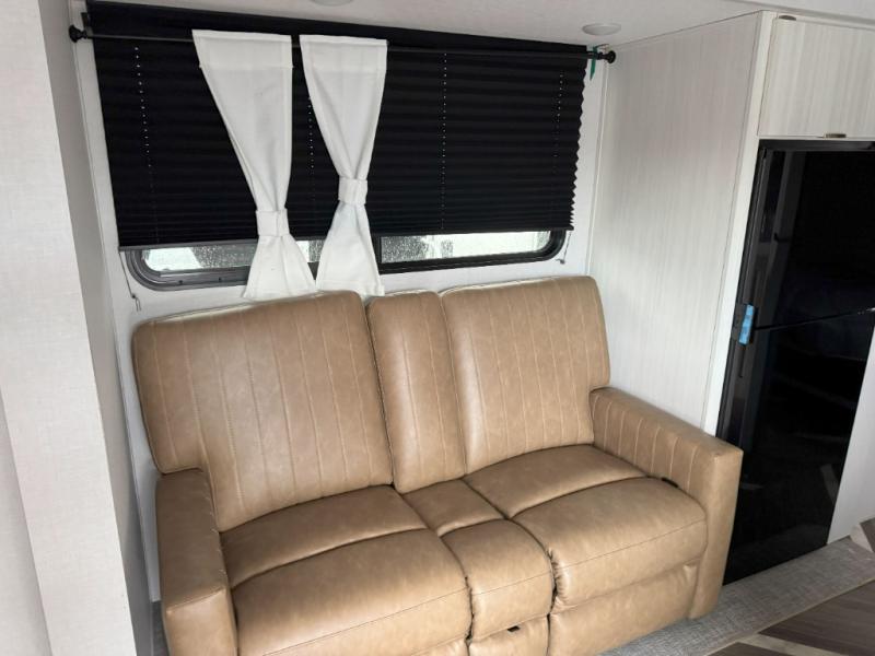 Whether you're camping in your own back yard or across the country, you'll find comfort in this spacious travel trailer. The full rear bath is not only spacious, but it's tucked away in the back for privacy. Your crew can get comfortable on the theater seating or head outdoors to relax under the 18' power awning. There is also a bar top with stools and a fully-equipped kitchen to make meals each day, or you can head outdoors to utilize the outdoor Quick Connect and 2X size camp refrigerator! When you're ready to call it a night, head to the front private bedroom for a great night's rest on the king bed that includes wardrobes on either side for your clothes.