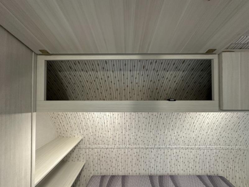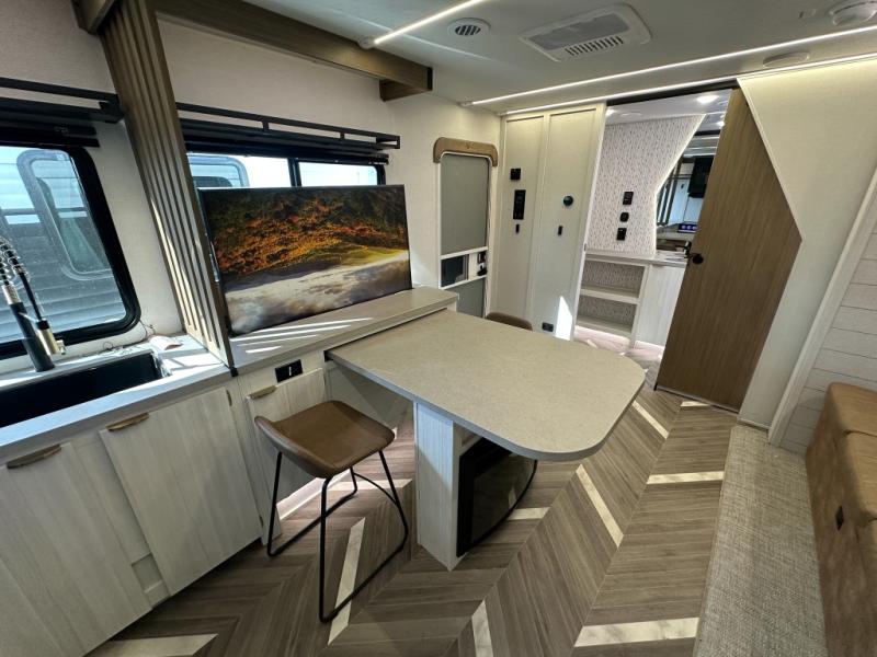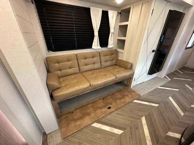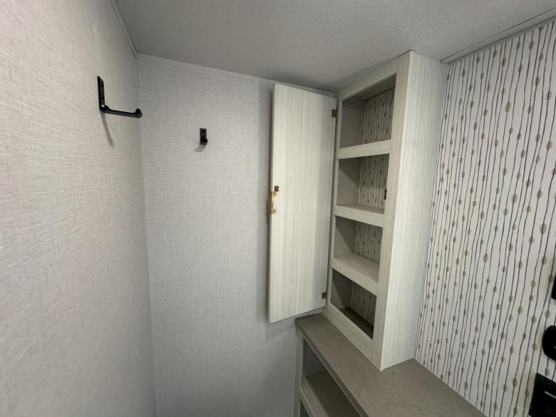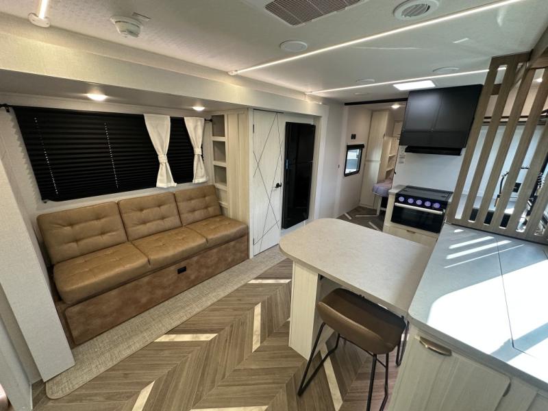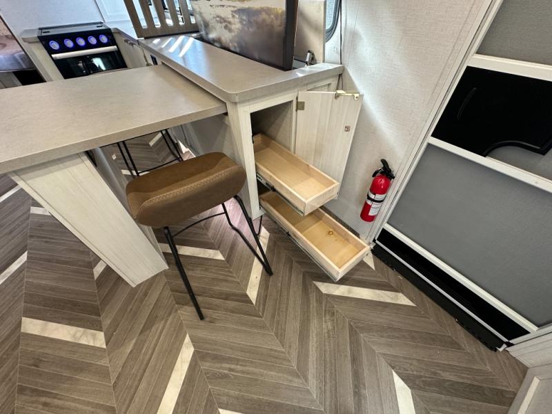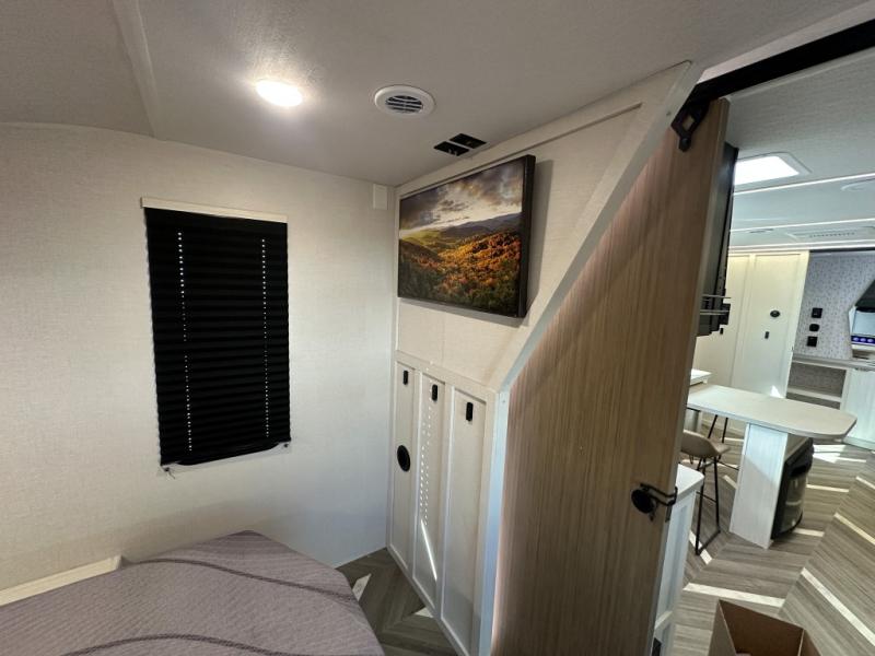 This travel trailer is perfect for two! Ita has a rear bathroom, a convenient and private space, featuring shelves for storing essentials and linens. The living area is a comfortable space, featuring a plush sofa and a televator for easy TV viewing. Plus, a fireplace that will add warmth and ambiance for cold seasons, creating a relaxing atmosphere. A pull-out table provides a convenient spot for meals or snacks. The kitchen is equipped with a microwave for quick reheating and a refrigerator for keeping drinks and ingredients fresh. In the main bedroom, you will find a king-sized bed for ultimate comfort and relaxation, and a wardrobe for storing your clothes.