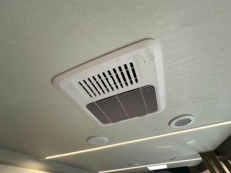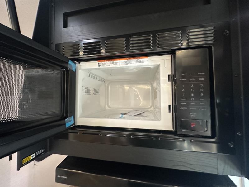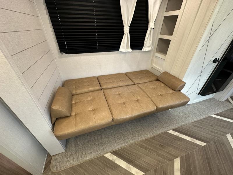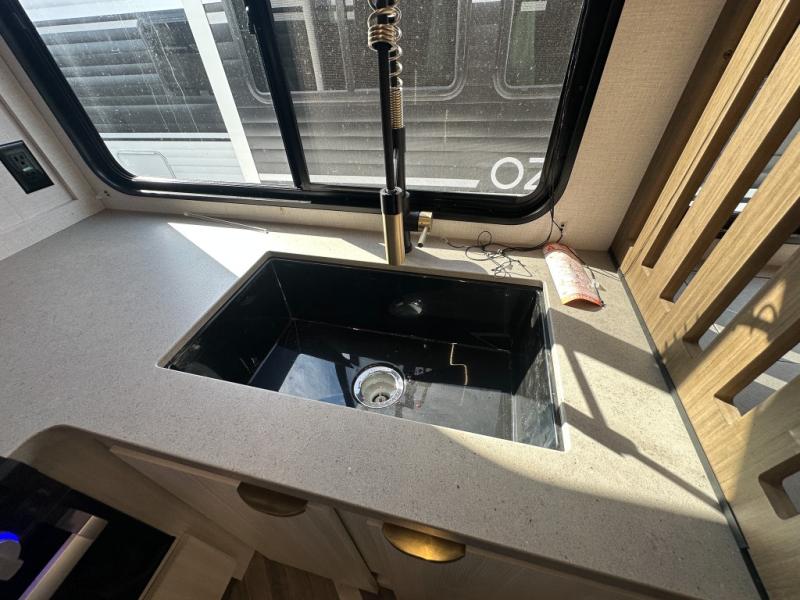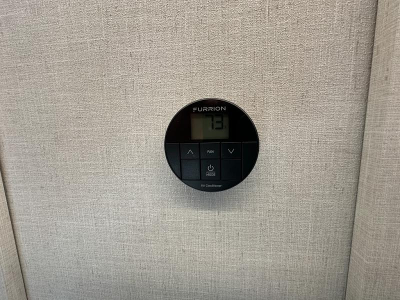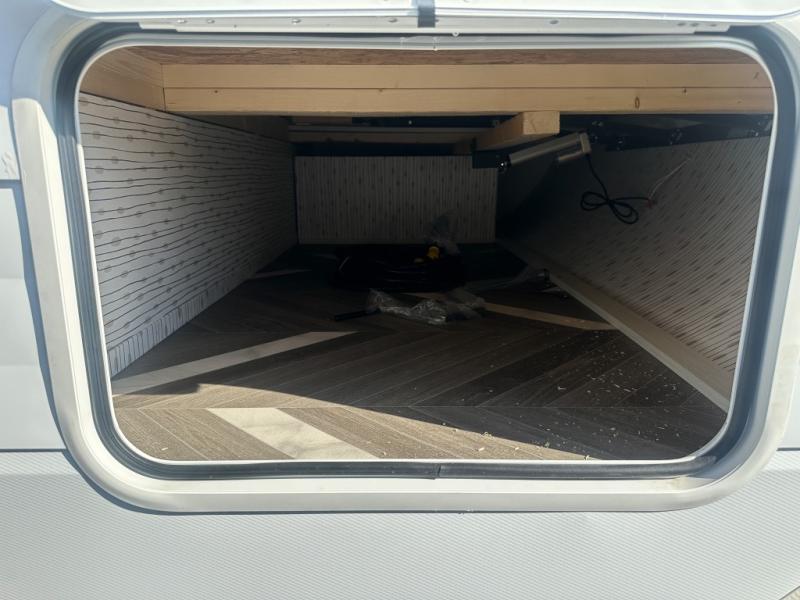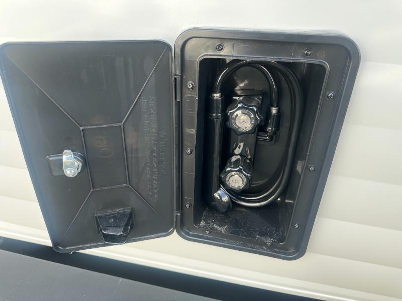 This travel trailer is perfect for two! Ita has a rear bathroom, a convenient and private space, featuring shelves for storing essentials and linens. The living area is a comfortable space, featuring a plush sofa and a televator for easy TV viewing. Plus, a fireplace that will add warmth and ambiance for cold seasons, creating a relaxing atmosphere. A pull-out table provides a convenient spot for meals or snacks. The kitchen is equipped with a microwave for quick reheating and a refrigerator for keeping drinks and ingredients fresh. In the main bedroom, you will find a king-sized bed for ultimate comfort and relaxation, and a wardrobe for storing your clothes.
