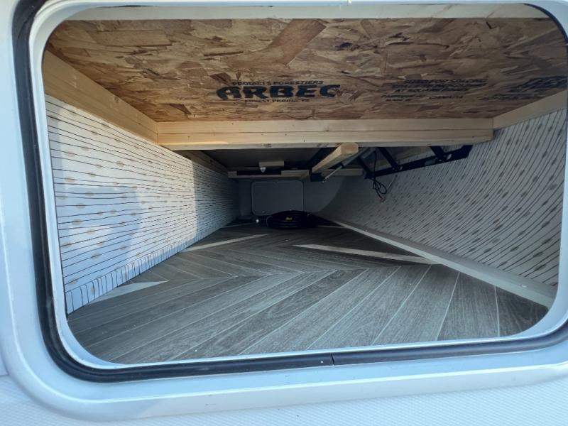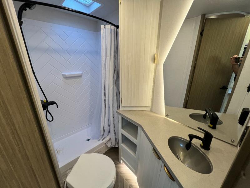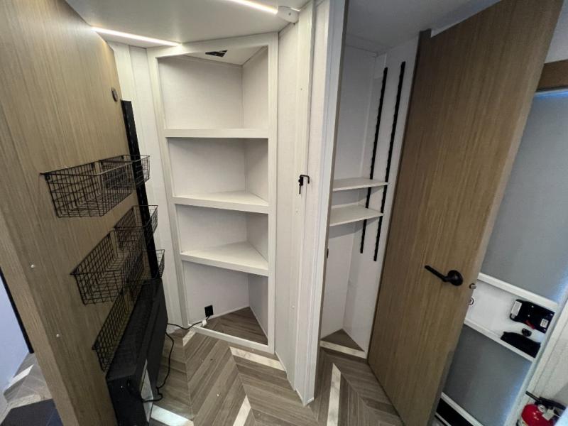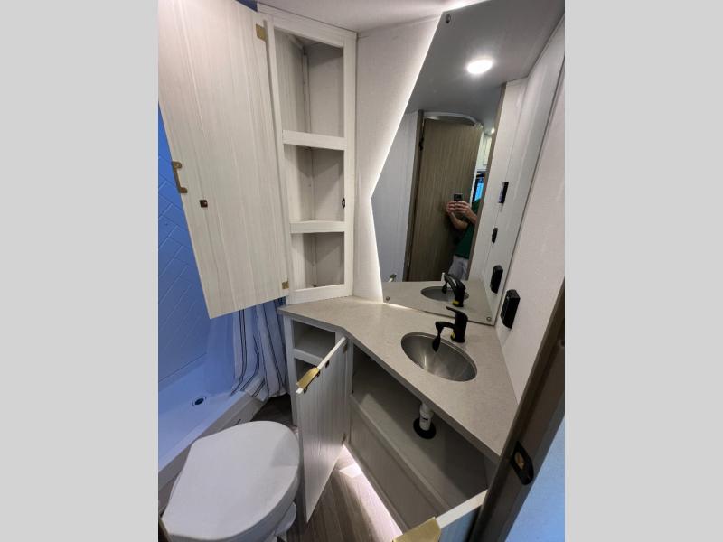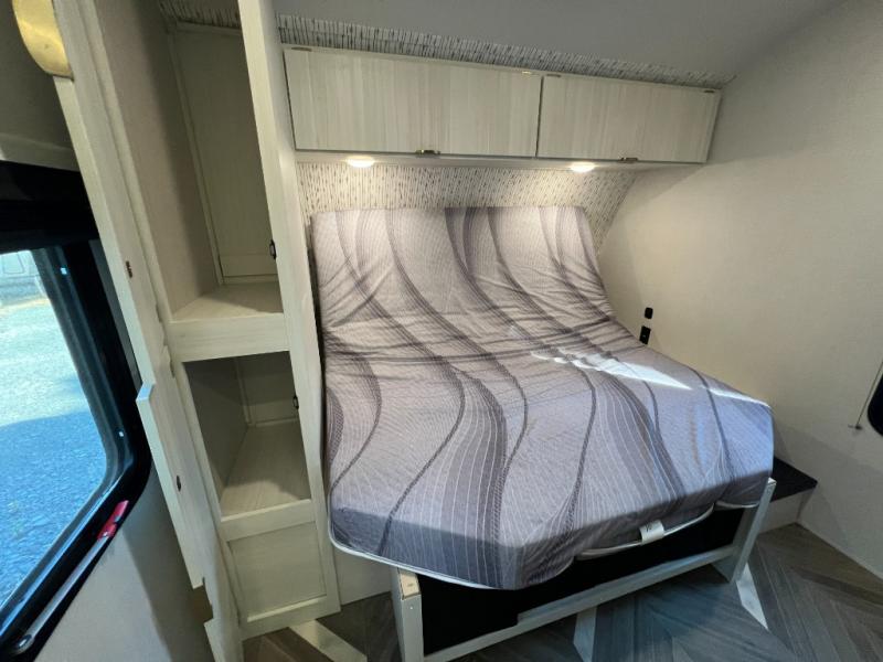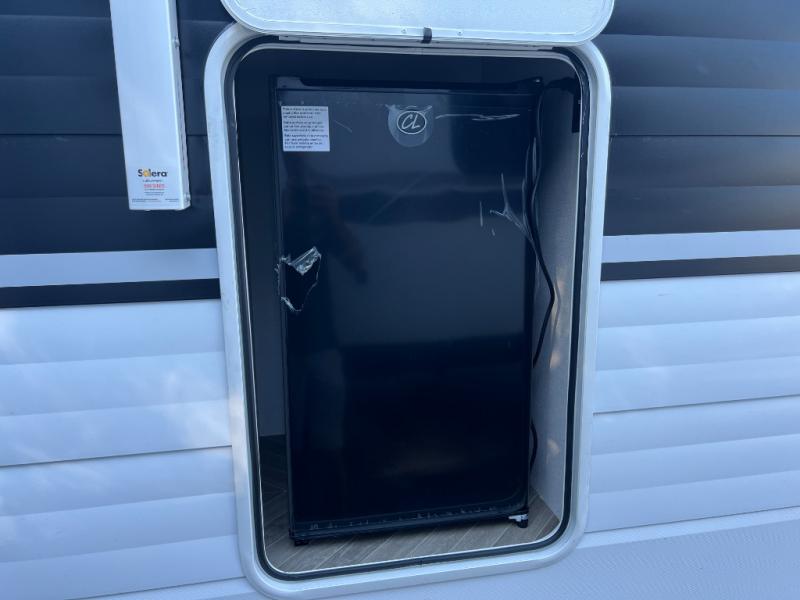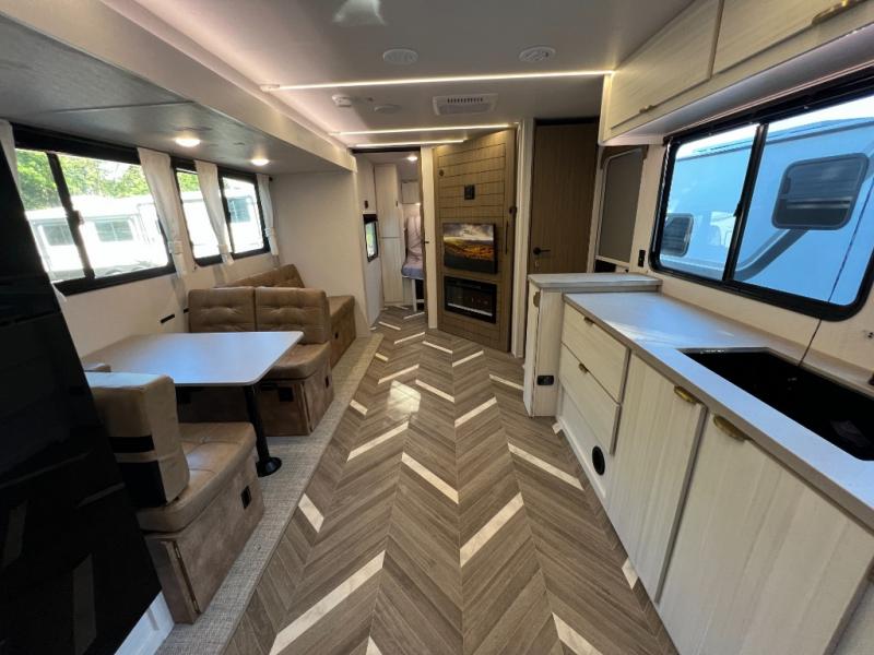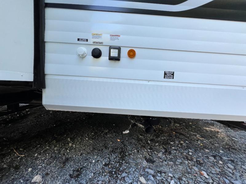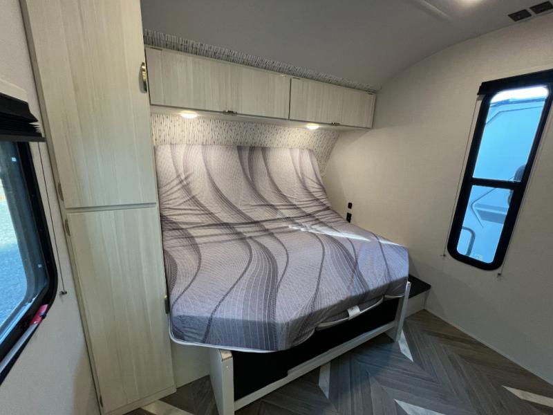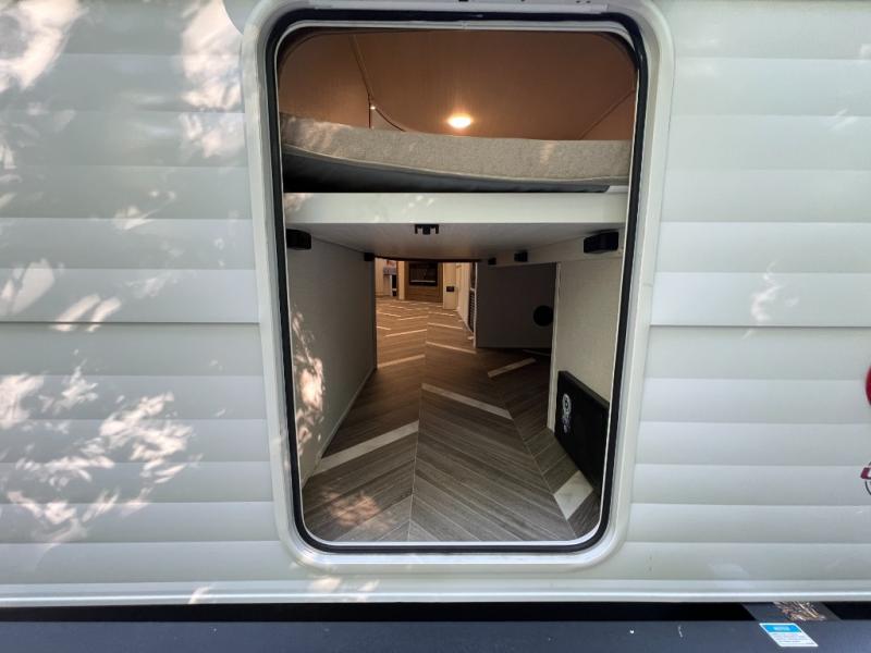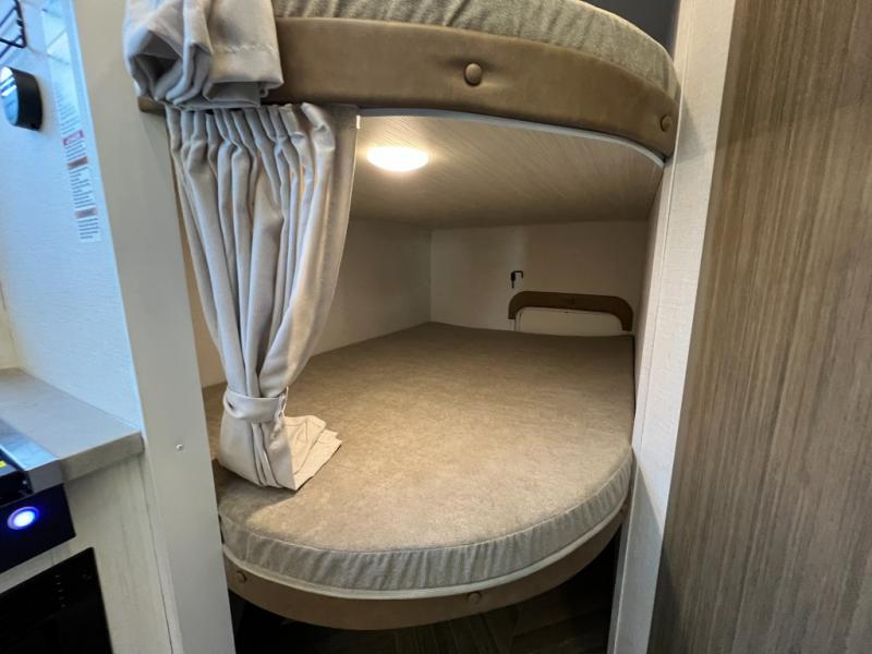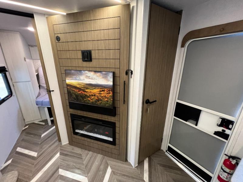 Trips to the lake just got sweeter in this travel trailer with a large slide for more space. Here, you'll find an versa lounge , and the entertainment center with a fireplace will make it feel a little more like home. A full bath with a 36" x 30" shower will let you clean up each day without having to use the camp's facilities, and the double-size bunks with an exterior bike door will let you easily pack gear in. Head up front to enjoy the private bedroom all to yourselves with a king bed and dual wardrobes for wrinkle-free clothes!