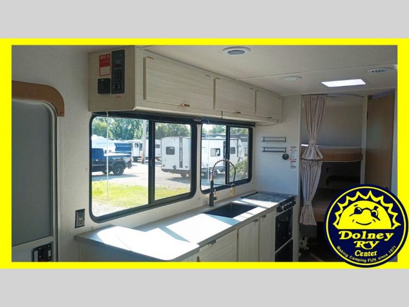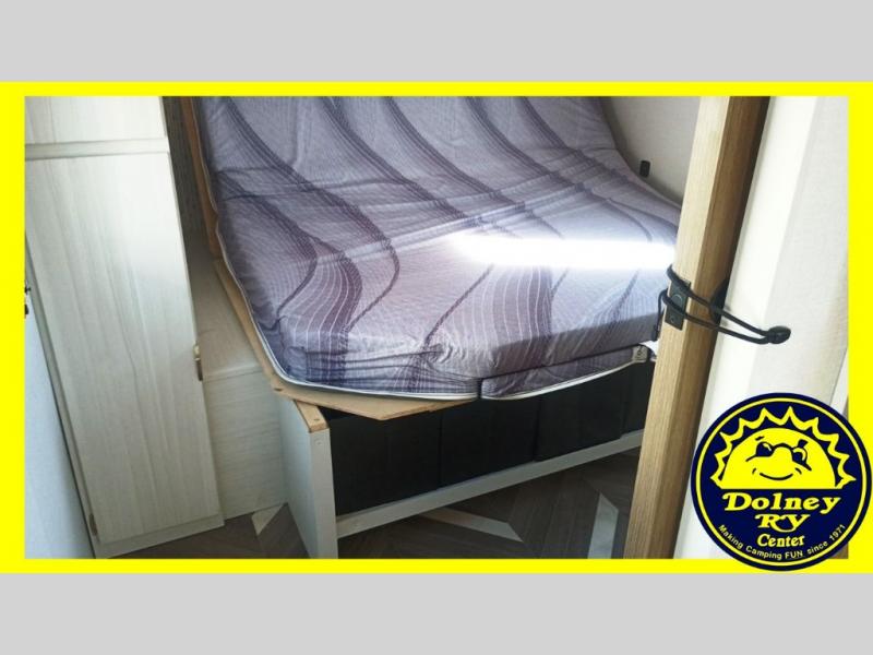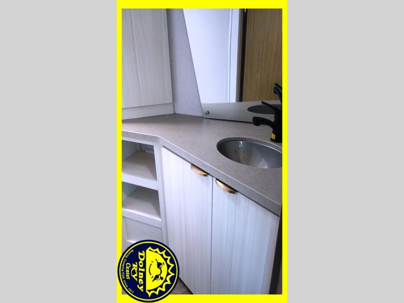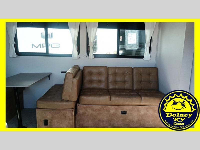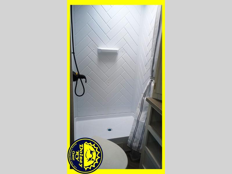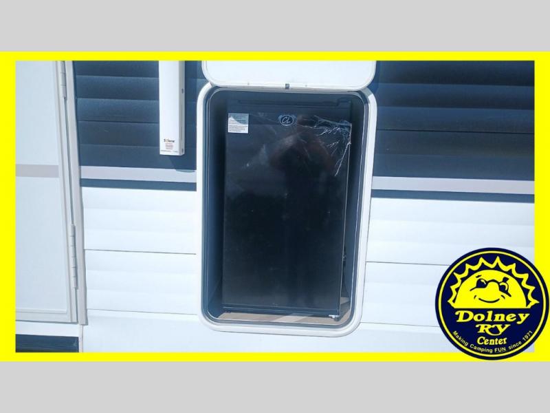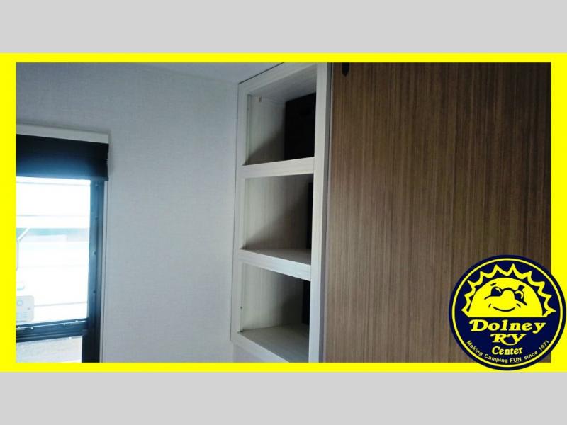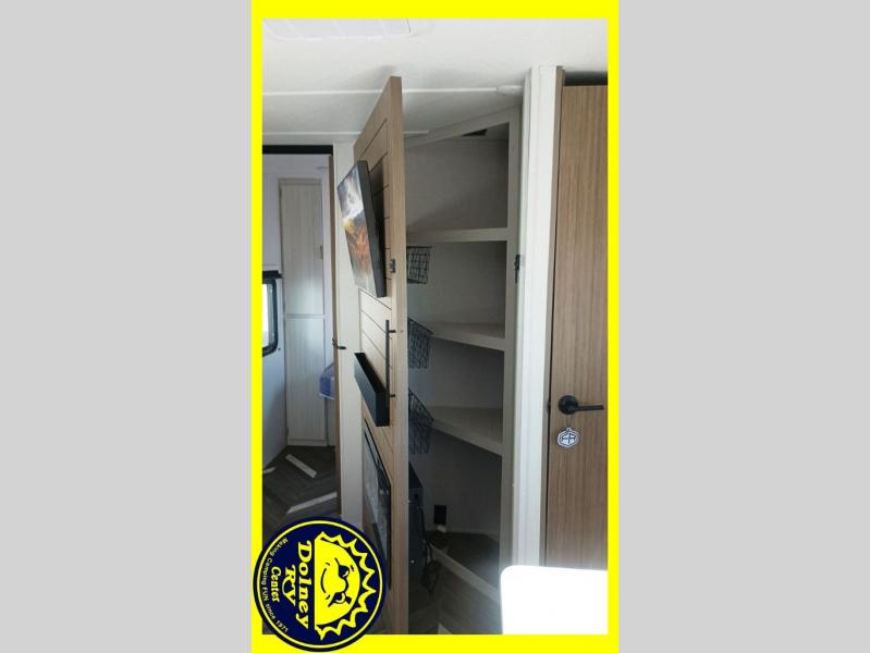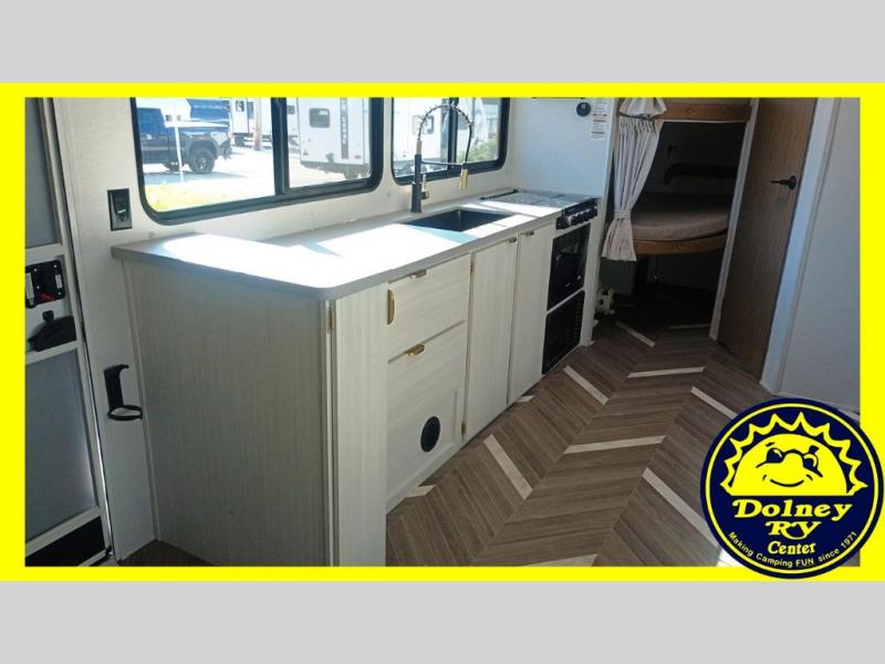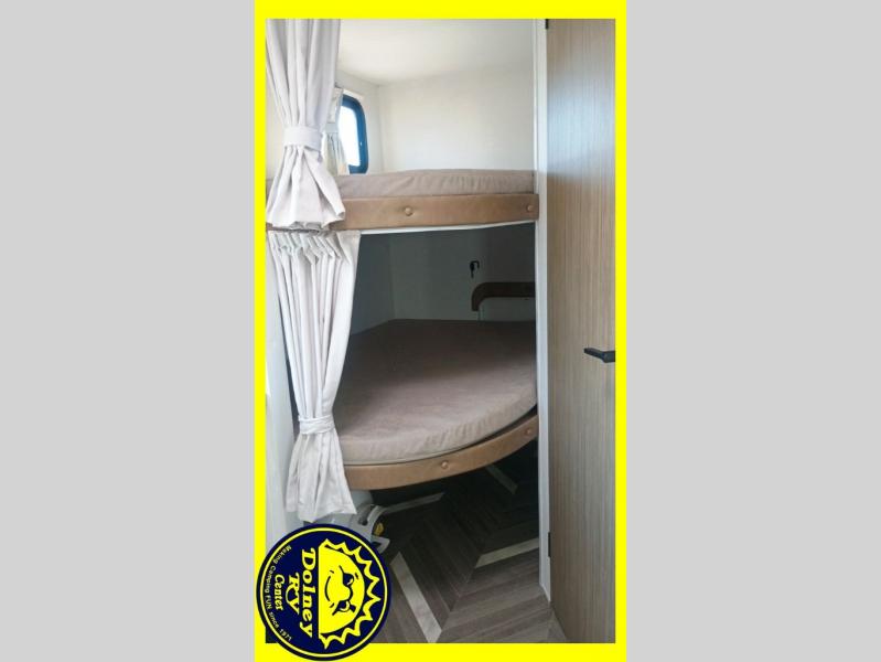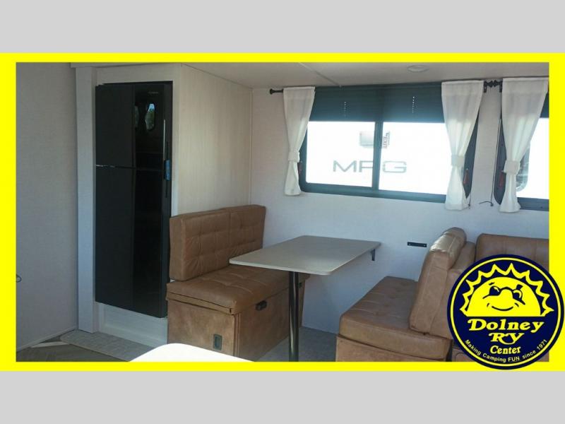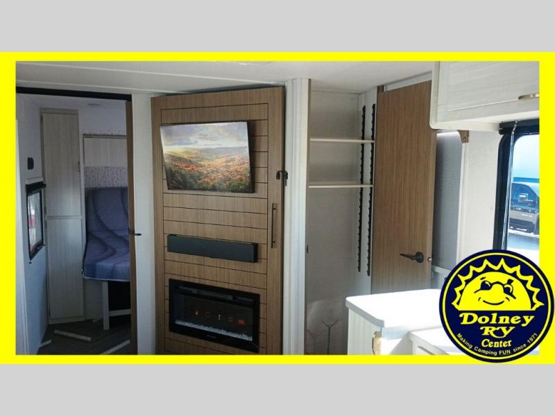 Trips to the lake just got sweeter in this travel trailer with a large slide for more space. Here, you'll find an L-shaped open lounge with a removable table, and the entertainment center with a fireplace will make it feel a little more like home. A full bath with a 36" x 30" shower will let you clean up each day without having to use the camp's facilities, and the double-size bunks with an exterior bike door will let you easily pack gear in. Head up front to enjoy the private bedroom all to yourselves with a king bed and dual wardrobes for wrinkle-free clothes!