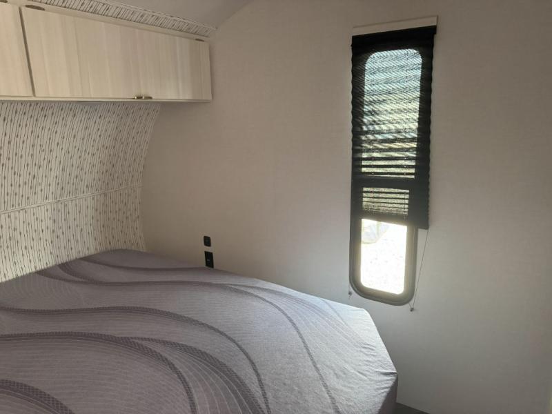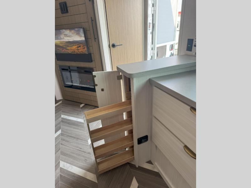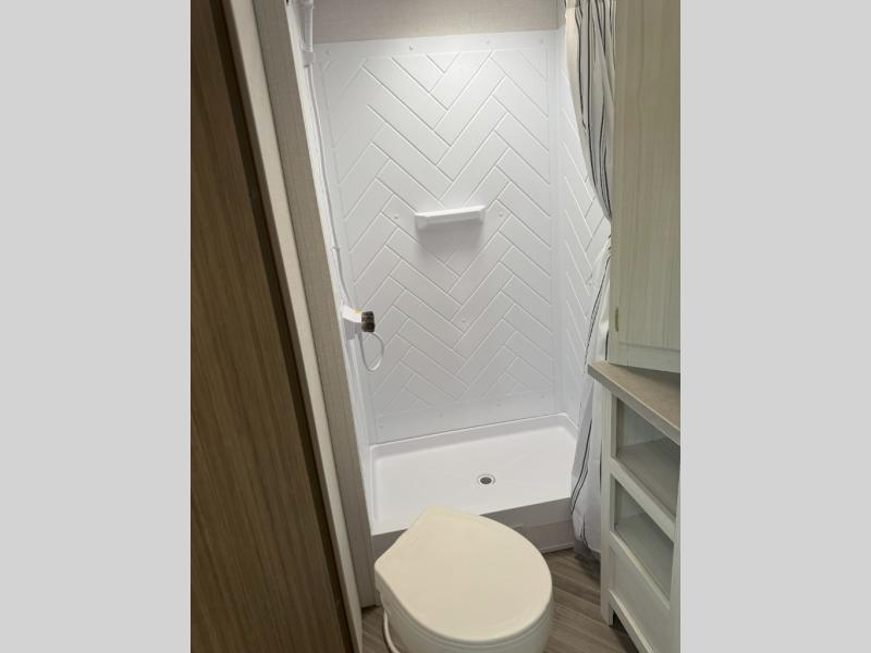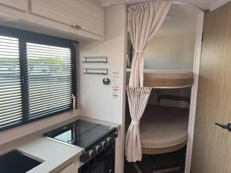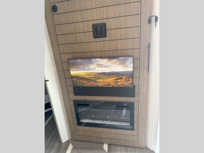 Trips to the lake just got sweeter in this travel trailer with a large slide for more space. Here, you'll find an versa lounge , and the entertainment center with a fireplace will make it feel a little more like home. A full bath with a 36" x 30" shower will let you clean up each day without having to use the camp's facilities, and the double-size bunks with an exterior bike door will let you easily pack gear in. Head up front to enjoy the private bedroom all to yourselves with a king bed and dual wardrobes for wrinkle-free clothes!