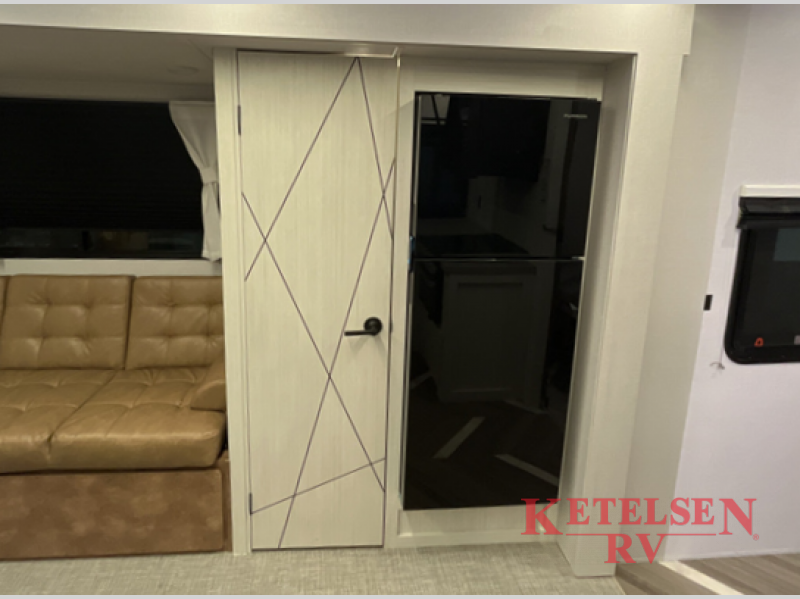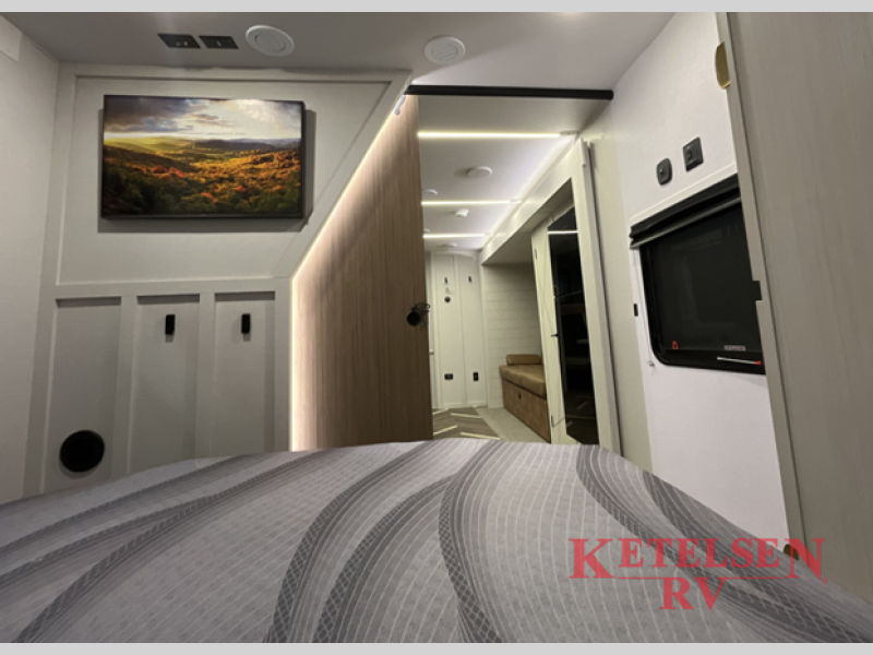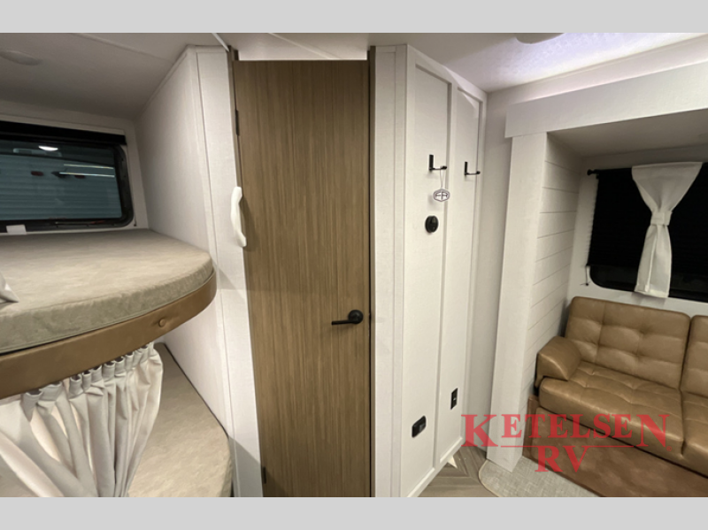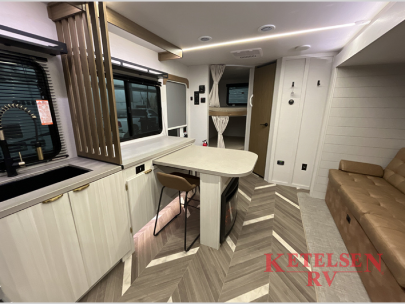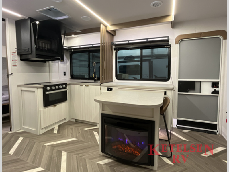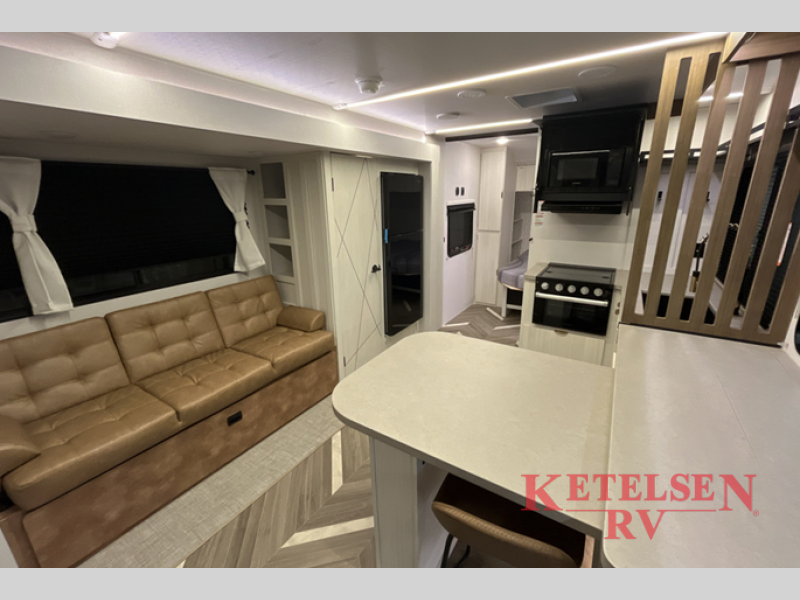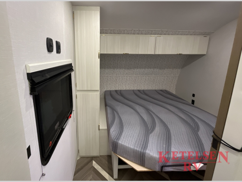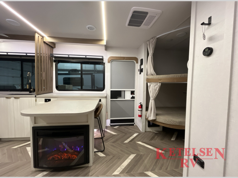 In the rear area of this travel trailer, the double-size bunks provide a snug sleeping spot, and the full bathroom serves as an oasis of relaxation, equipped with premium fixtures and amenities for a refreshing stay. The plush jackknife sofa provides a comfortable seating area that can be converted into a convenient sleeping space. The televator allows for effortless TV viewing, while the fireplace adds warmth and ambiance on chilly evenings. A convenient pull-out table provides a perfect spot for meals, snacks, or games, and the kitchen is equipped with a high-performance fridge, a rapid-cooking microwave, and a spacious pantry for storing gourmet ingredients and snacks. The front bedroom is a peaceful retreat, featuring a spacious wardrobe for storing fine attire and personal items. Overhead cabinets provide additional storage for linens, towels, and essentials.