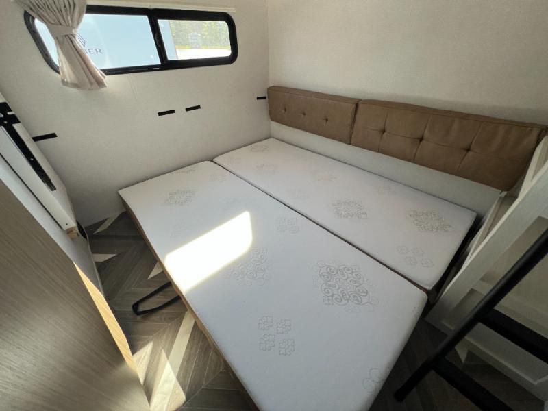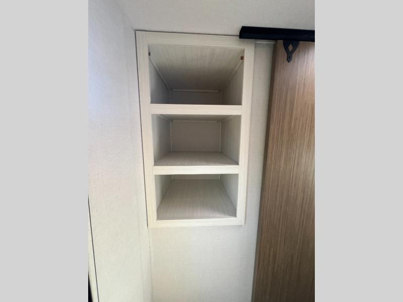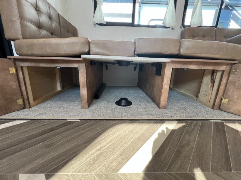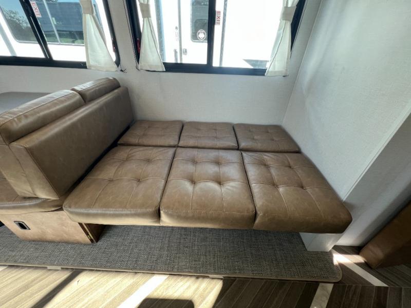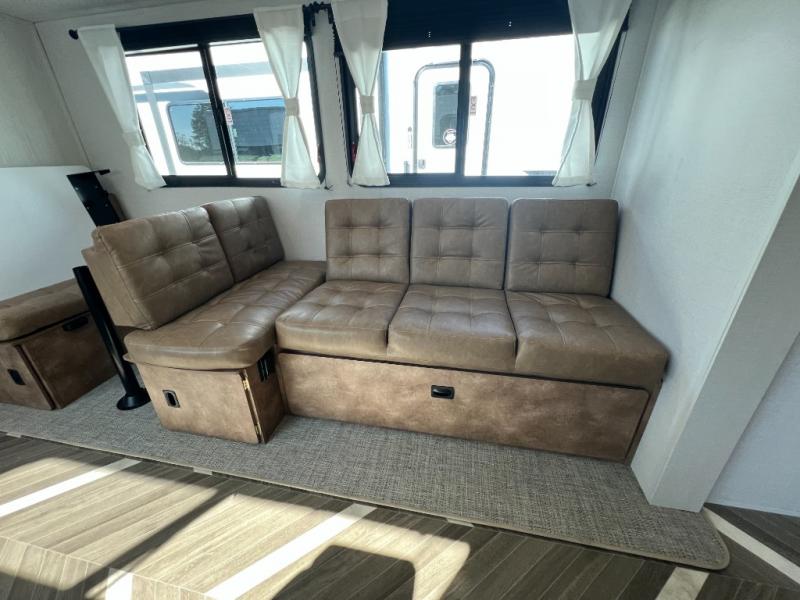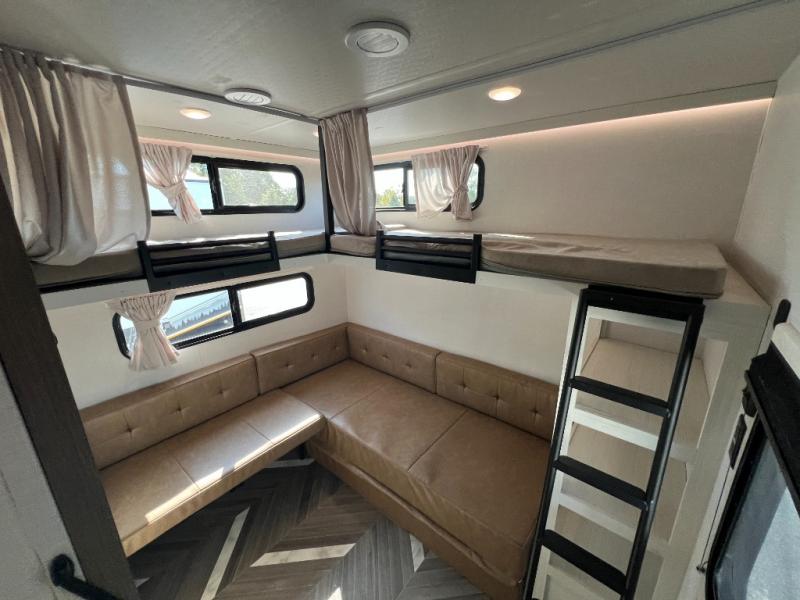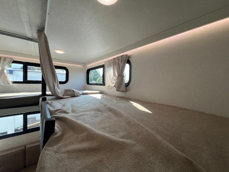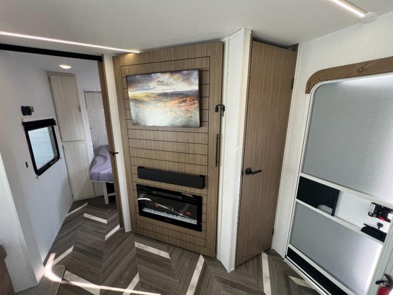 Trips to the lake just got sweeter in this travel trailer with a large slide for more space. Here, you'll find an versa lounge, and the entertainment center with a fireplace will make it feel a little more like home. A full bath with a 24' x 36" shower will let you clean up each day without having to use the camp's facilities, and the rear bunkhouse will provide sleeping space for your guests or kids. There are two bunk beds here, along with an open lounge/queen bed combo and storage space to keep this room tidy. Head up front to enjoy the private bedroom all to yourselves with a king bed and dual wardrobes for wrinkle-free clothes!