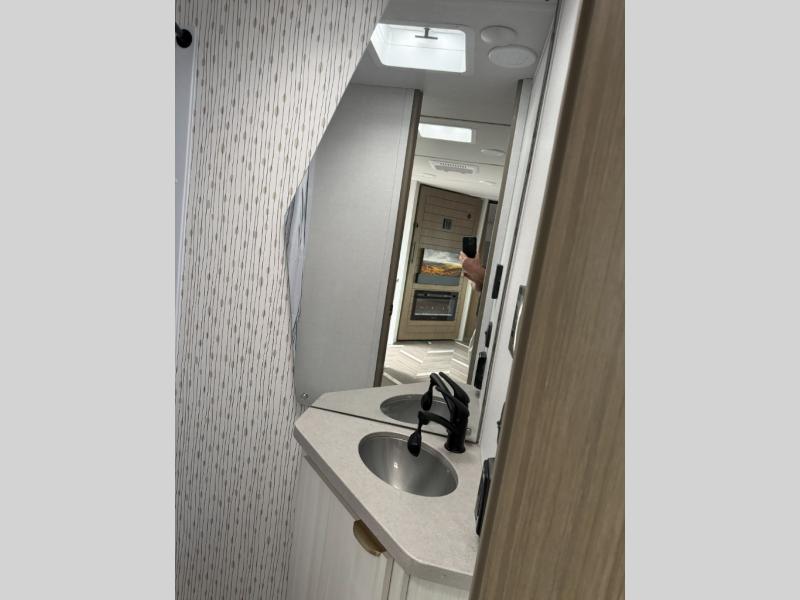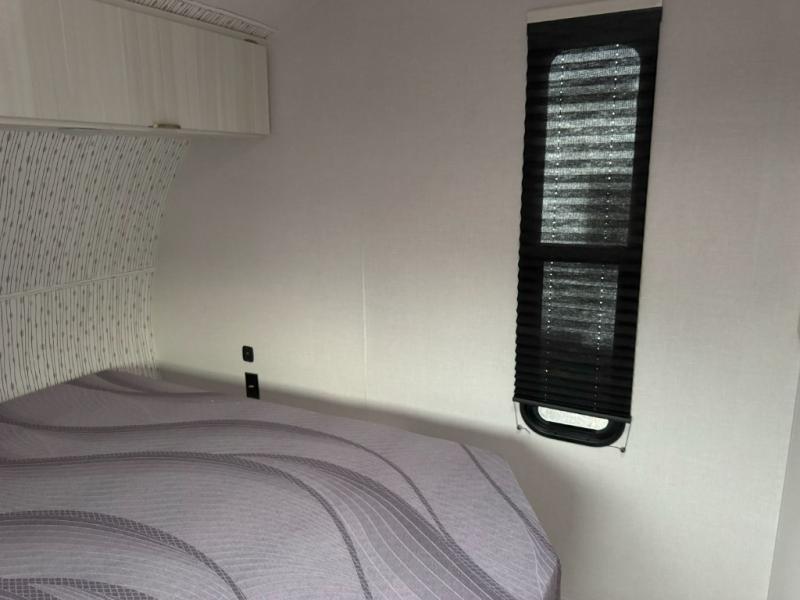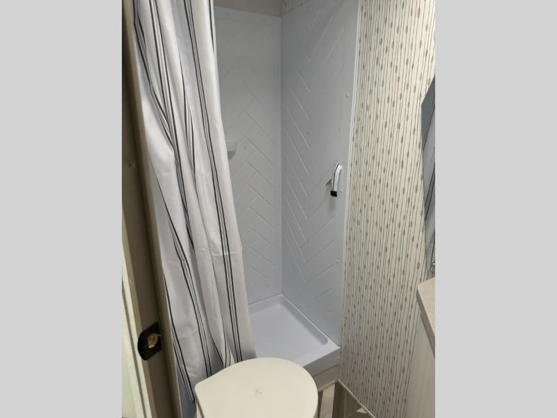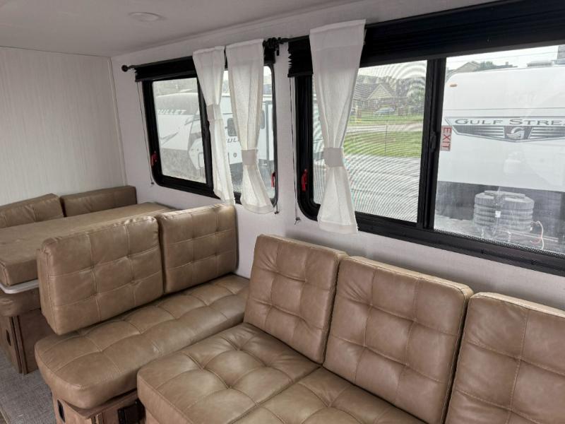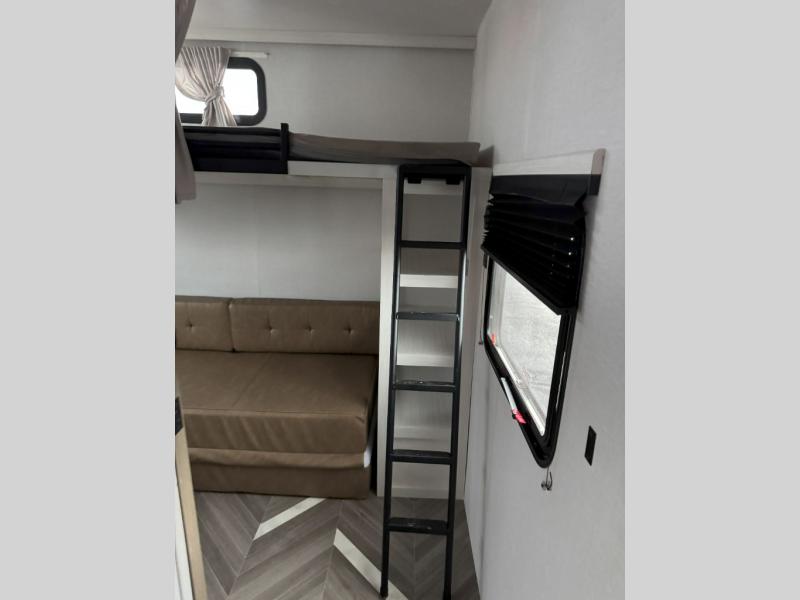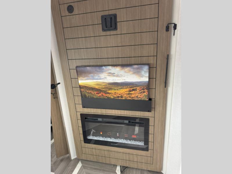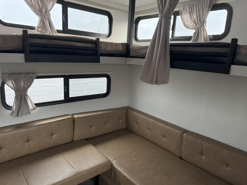 Trips to the lake just got sweeter in this travel trailer with a large slide for more space. Here, you'll find an L-shaped open lounge with a removable table, and the entertainment center with a fireplace will make it feel a little more like home. A full bath with a 24' x 36" shower will let you clean up each day without having to use the camp's facilities, and the rear bunkhouse will provide sleeping space for your guests or kids. There are two bunk beds here, along with an open lounge/queen bed combo and storage space to keep this room tidy. Head up front to enjoy the private bedroom all to yourselves with a king bed and dual wardrobes for wrinkle-free clothes!