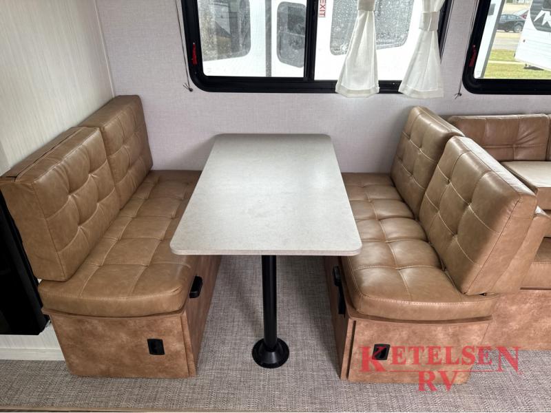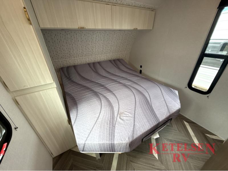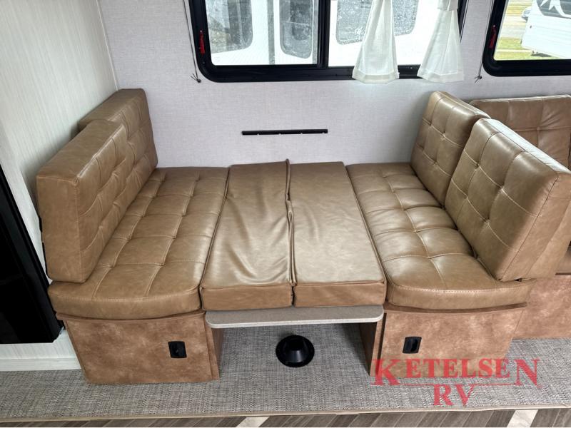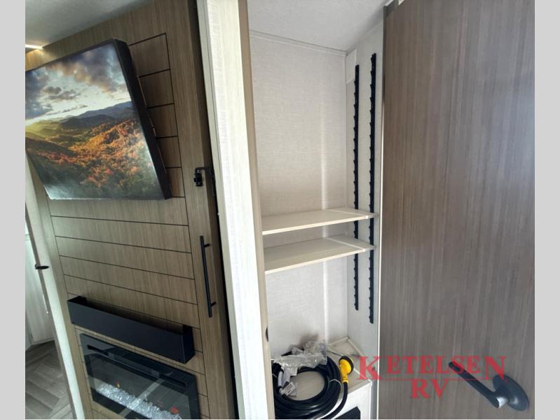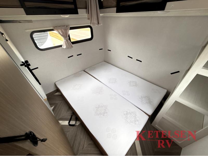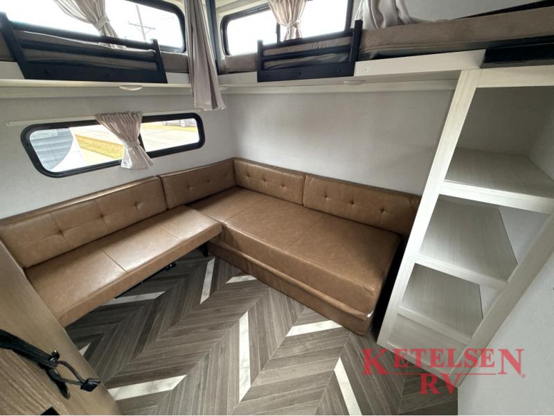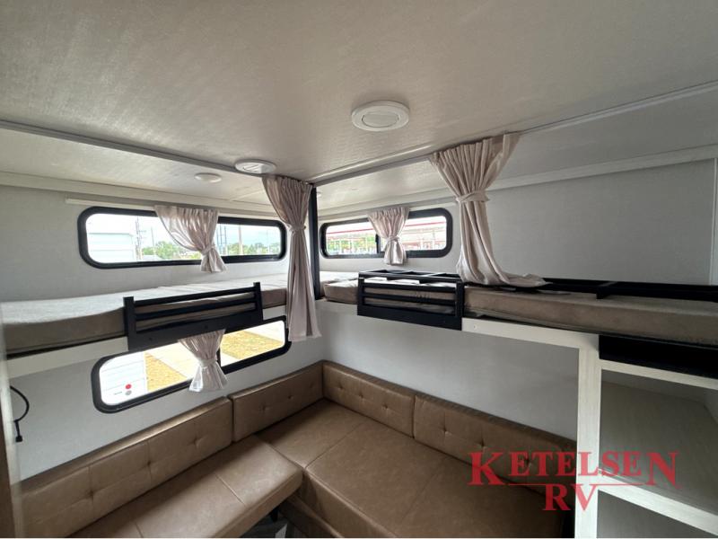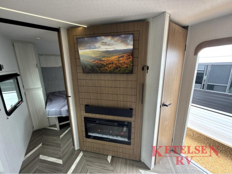 Trips to the lake just got sweeter in this travel trailer with a large slide for more space. Here, you'll find an versa lounge, and the entertainment center with a fireplace will make it feel a little more like home. A full bath with a 24' x 36" shower will let you clean up each day without having to use the camp's facilities, and the rear bunkhouse will provide sleeping space for your guests or kids. There are two bunk beds here, along with an open lounge/queen bed combo and storage space to keep this room tidy. Head up front to enjoy the private bedroom all to yourselves with a king bed and dual wardrobes for wrinkle-free clothes!