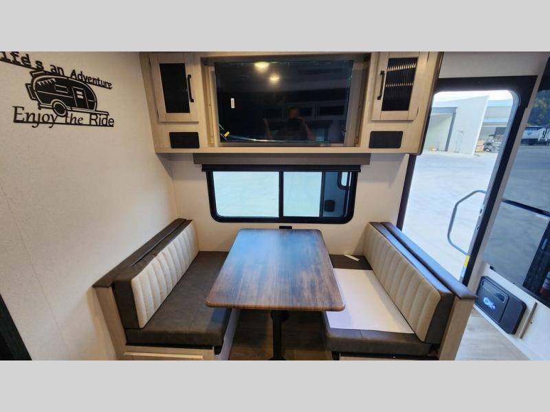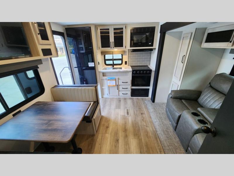 This rear kitchen travel trailer will be perfect for camping trips to the lake or woods! Once you've made breakfast on the stainless steel oven and range, you can dine at the booth dinette or take your plate outdoors to sit under the 18' electric awning. There is also a sofa slide out inside for a comfy place to relax. The walk-thru bath features a shower with a seat for added comfort, and you'll love having your own space in the front master bedroom. Here, you'll find a queen bed plus dual bedside closets to keep your things organized!
