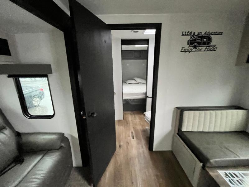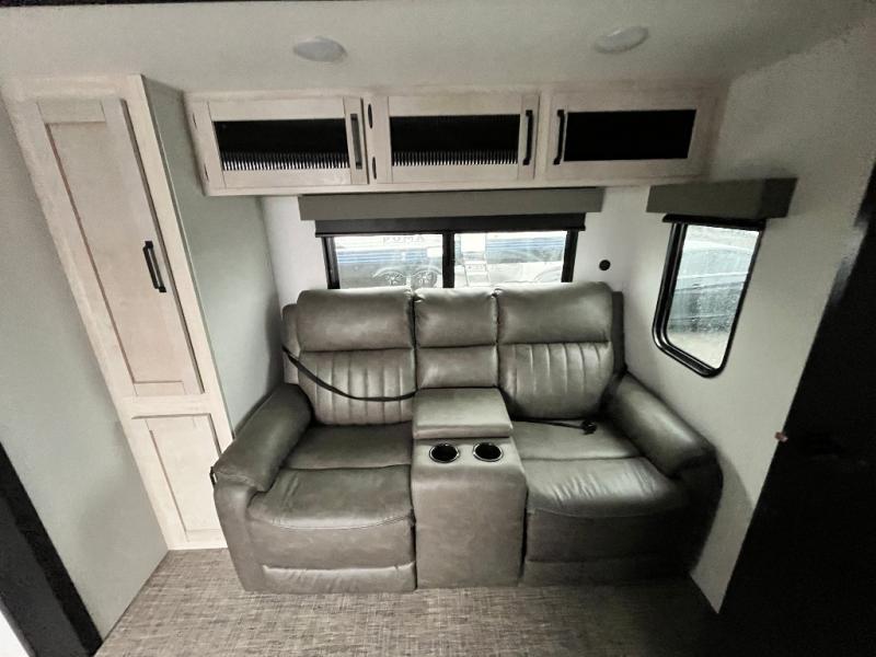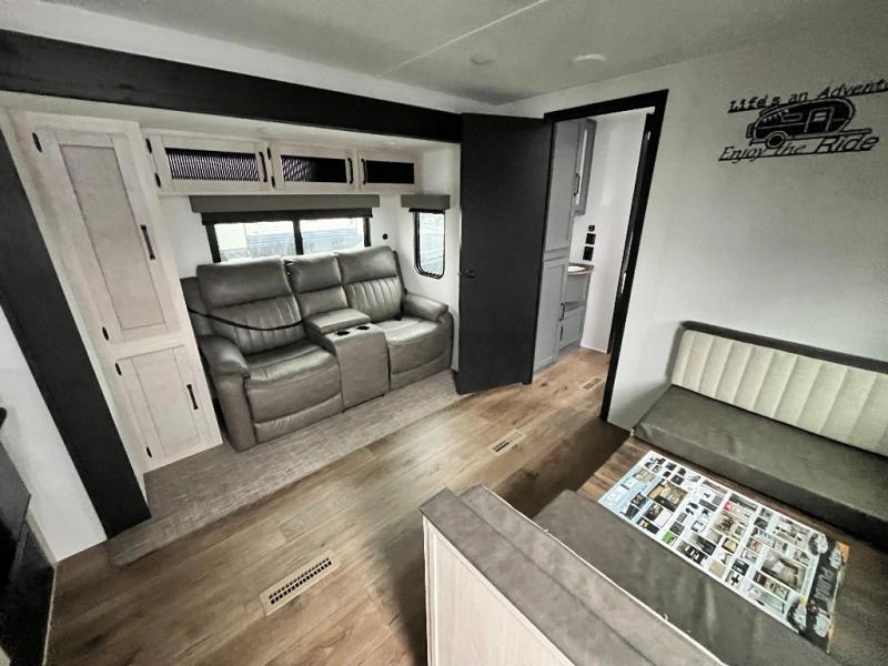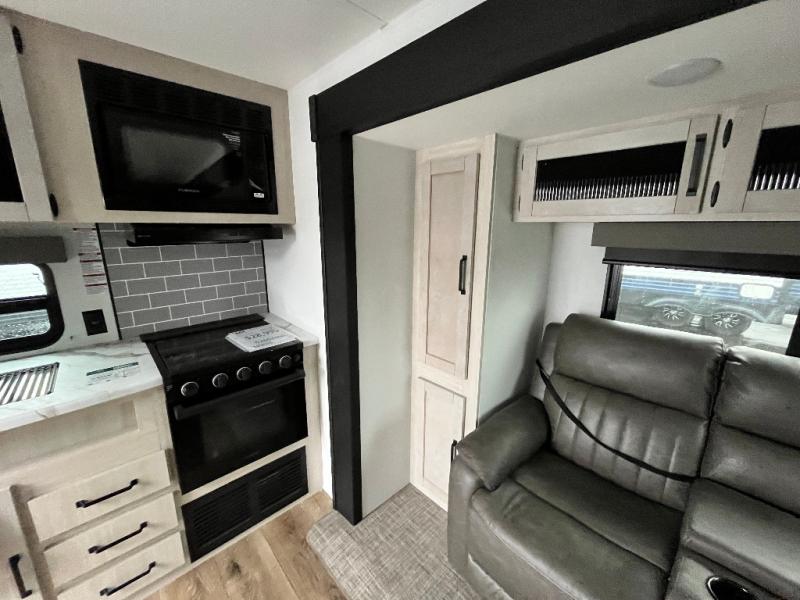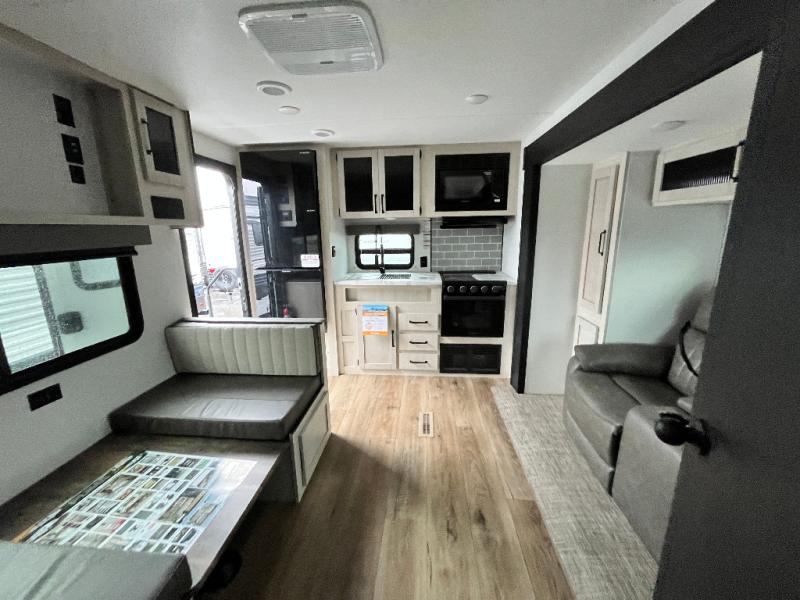 This rear kitchen travel trailer will be perfect for camping trips to the lake or woods! Once you've made breakfast on the stainless-steel oven and range, you can dine at the booth dinette or take your plate outdoors to sit under the 18' electric awning. There is also a sofa slide out inside for a comfy place to relax. The walk-thru bath features a shower with a seat for added comfort, and you'll love having your own space in the front master bedroom. Here, you'll find a queen bed plus dual bedside closets to keep your things organized!