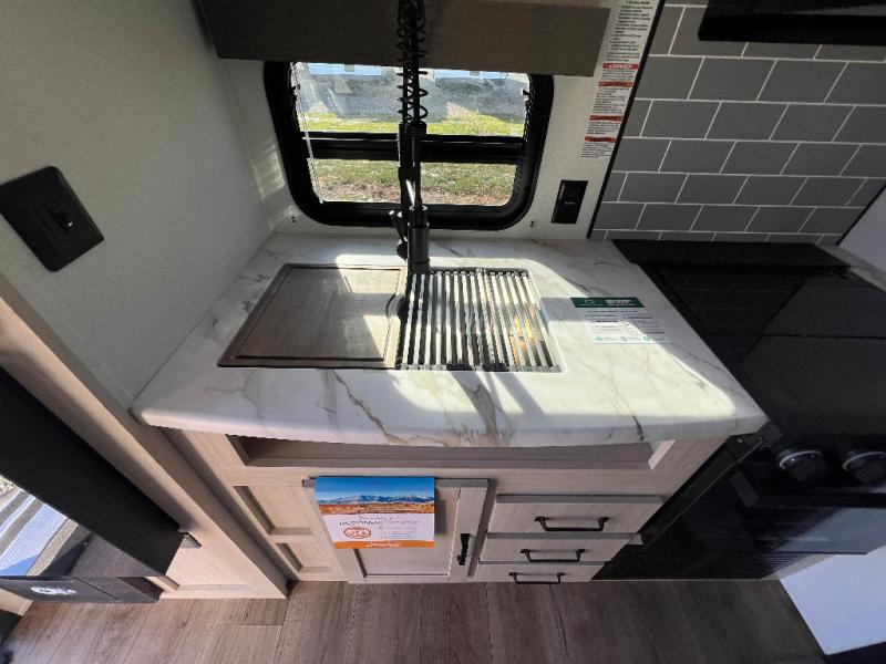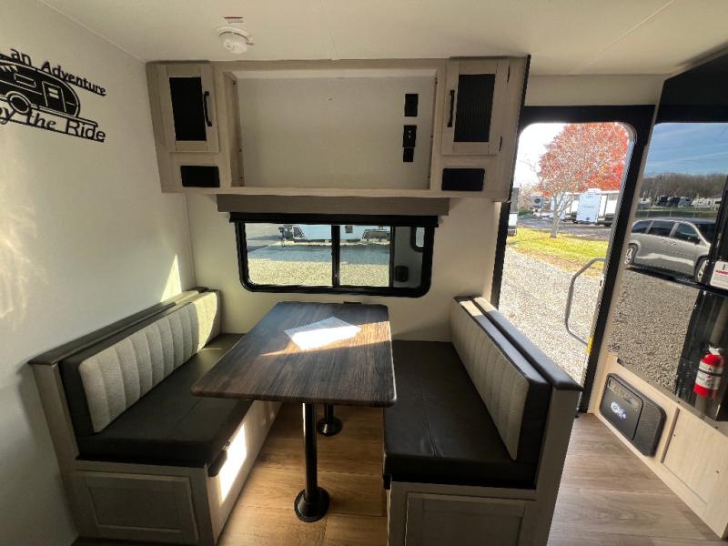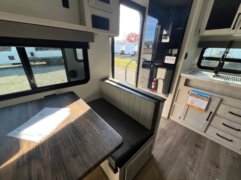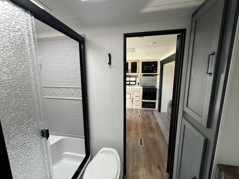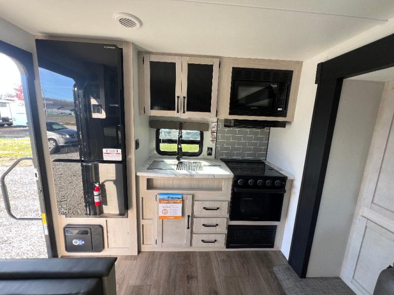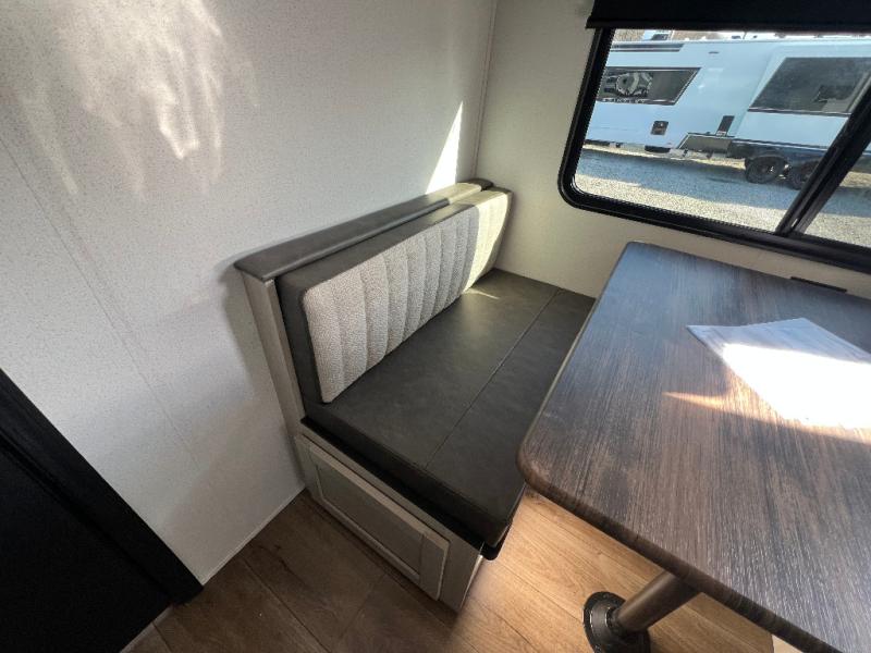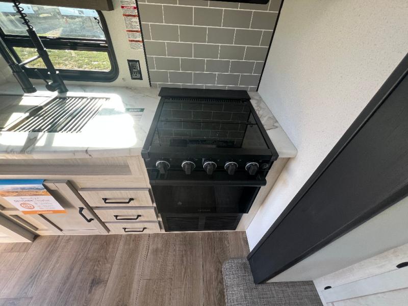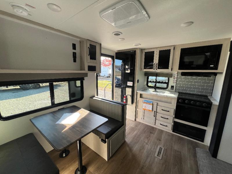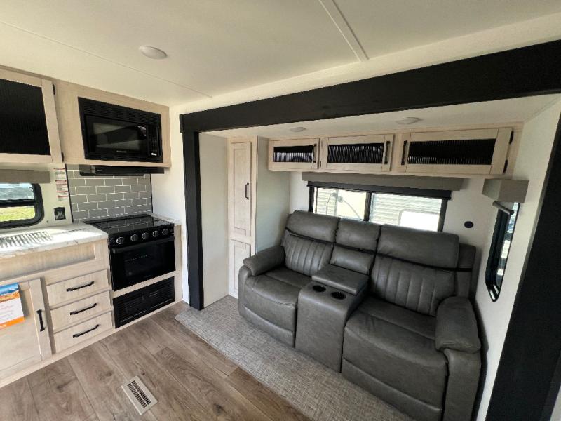 This rear kitchen travel trailer will be perfect for camping trips to the lake or woods! Once you've made breakfast on the stainless-steel oven and range, you can dine at the booth dinette or take your plate outdoors to sit under the 18' electric awning. There is also a sofa slide out inside for a comfy place to relax. The walk-thru bath features a shower with a seat for added comfort, and you'll love having your own space in the front master bedroom. Here, you'll find a queen bed plus dual bedside closets to keep your things organized!