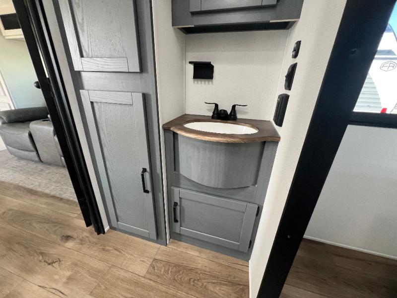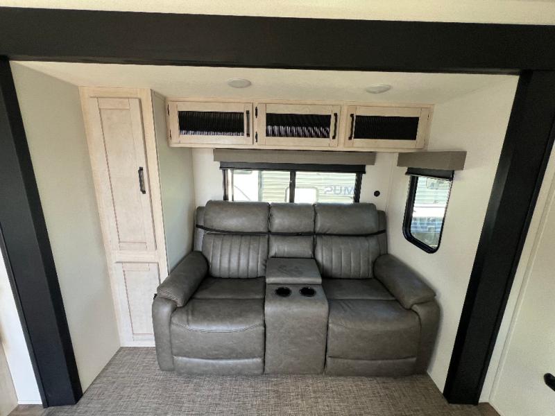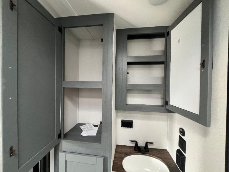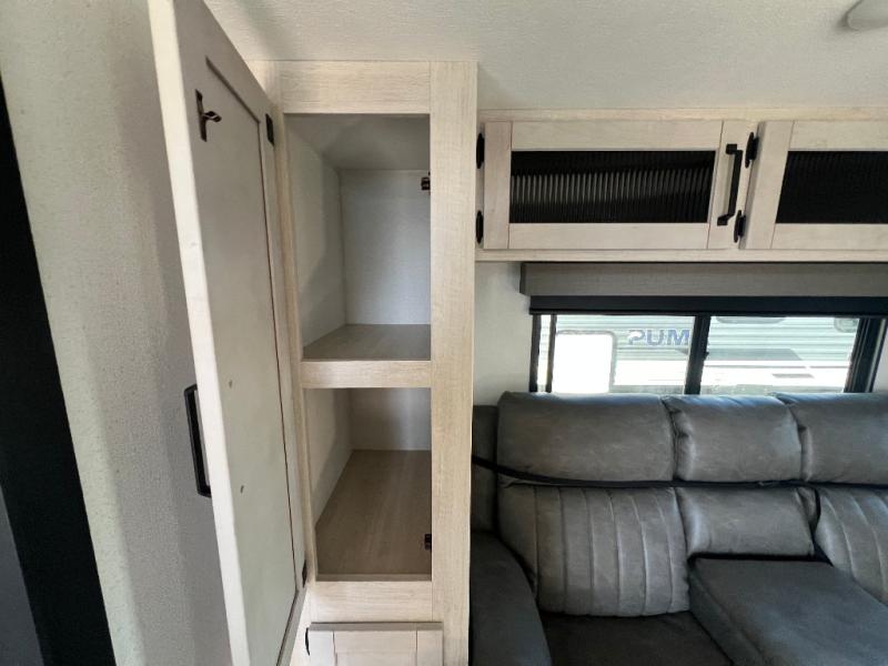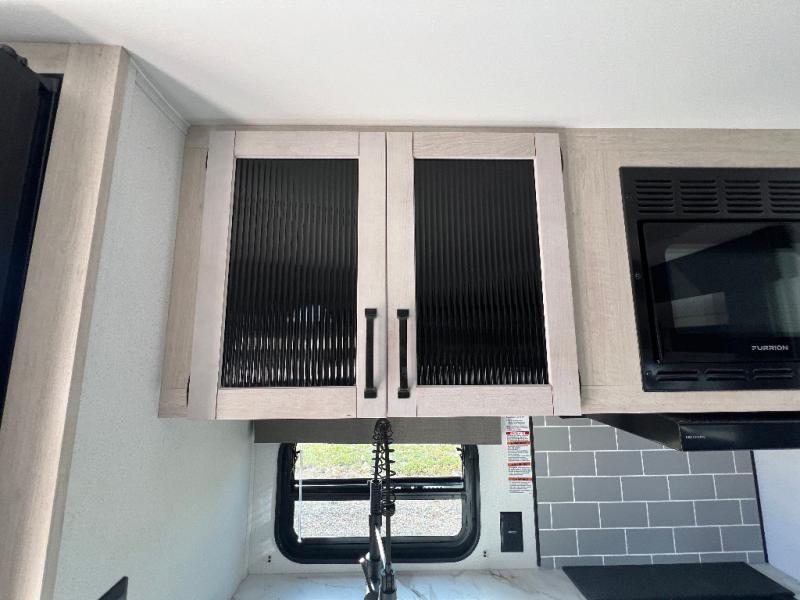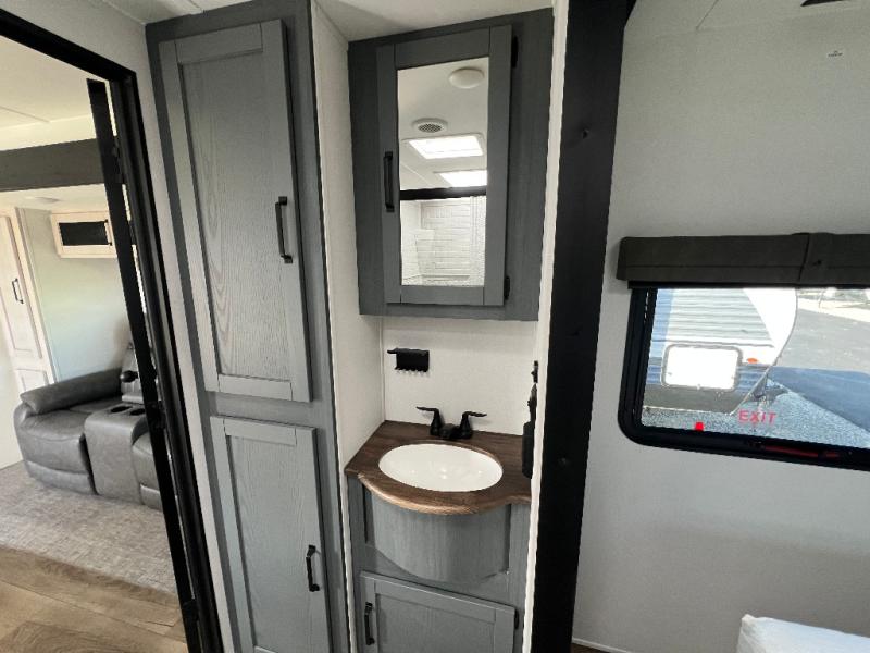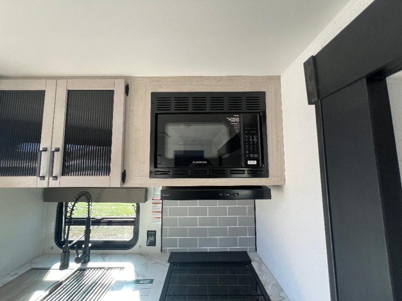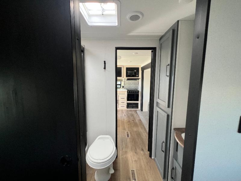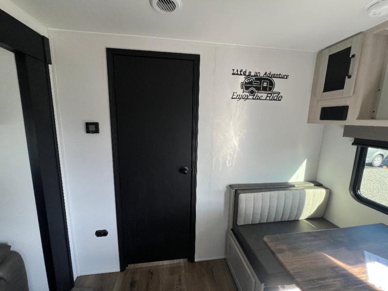 This rear kitchen travel trailer will be perfect for camping trips to the lake or woods! Once you've made breakfast on the stainless-steel oven and range, you can dine at the booth dinette or take your plate outdoors to sit under the 18' electric awning. There is also a sofa slide out inside for a comfy place to relax. The walk-thru bath features a shower with a seat for added comfort, and you'll love having your own space in the front master bedroom. Here, you'll find a queen bed plus dual bedside closets to keep your things organized!