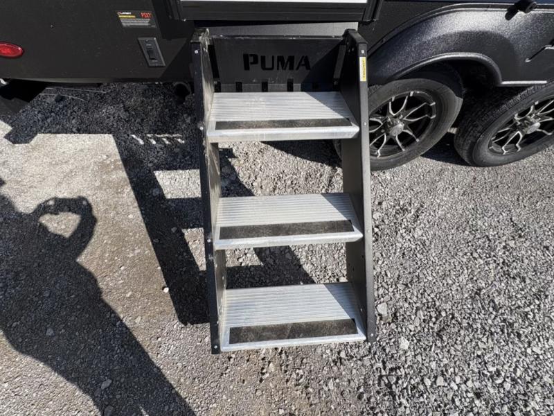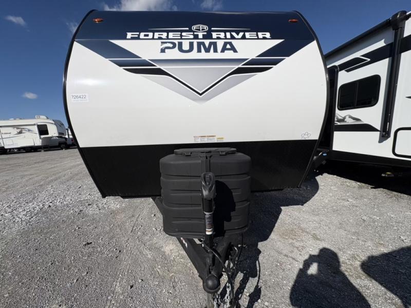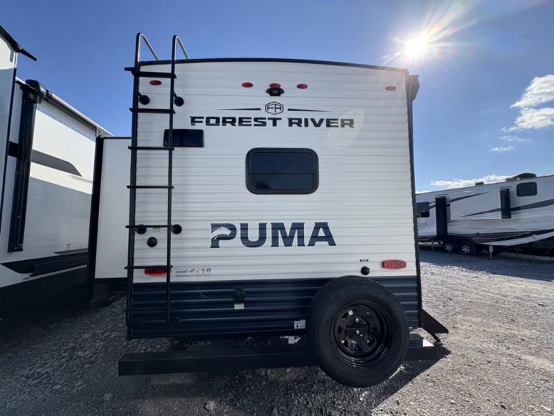 If you're looking for family-fun adventures, then you need one of these Forest River Puma travel trailers! They are built rugged, easy to tow, and jam packed with features. The Darco wrapped underbelly will help protect your unit, and the roof and side mount solar prep gives you the option to add off-grid power. Inside, the Congoleum linoleum will be easy to keep clean, and the night roller shades will provide privacy when it's time to turn in. You'll also enjoy an electric awning with an LED light strip plus an AM/FM/Bluetooth stereo and two outside speakers to keep the party going!