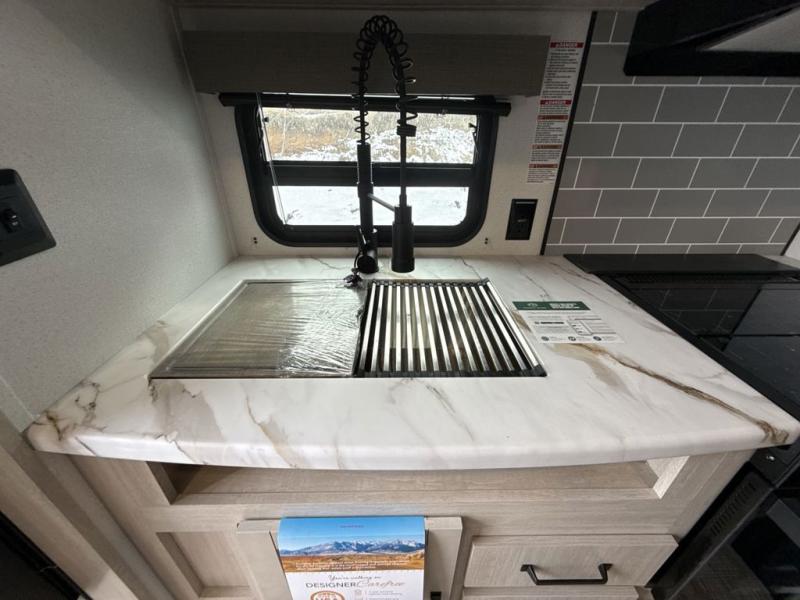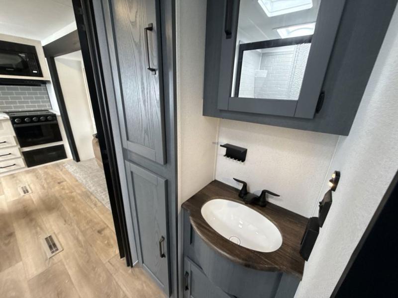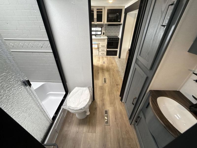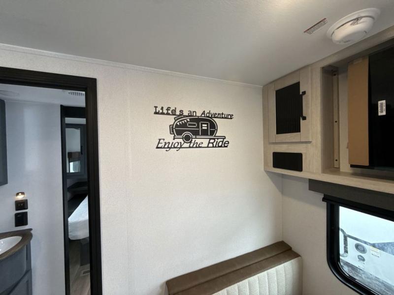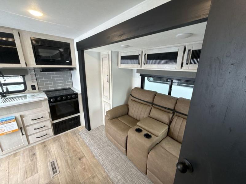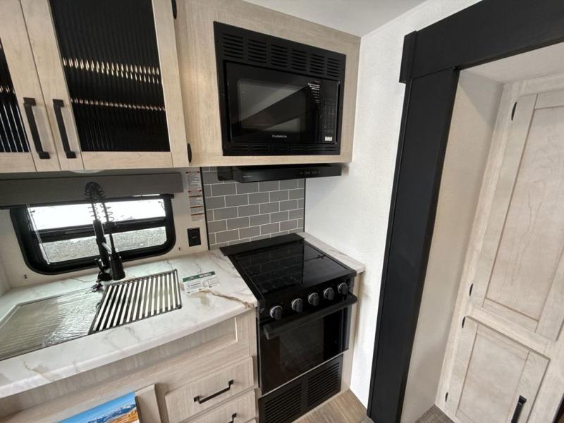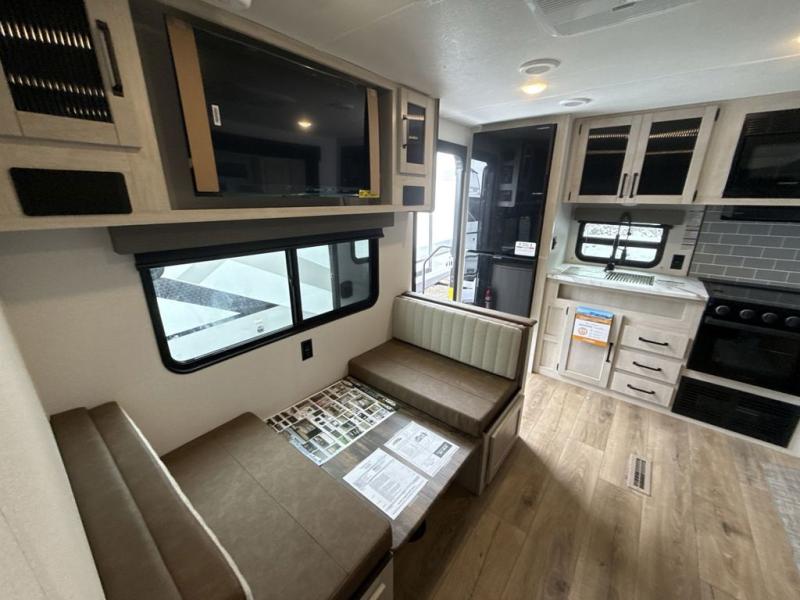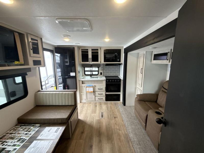 This rear kitchen travel trailer will be perfect for camping trips to the lake or woods! Once you've made breakfast on the stainless-steel oven and range, you can dine at the booth dinette or take your plate outdoors to sit under the 18' electric awning. There is also a sofa slide out inside for a comfy place to relax. The walk-thru bath features a shower with a seat for added comfort, and you'll love having your own space in the front master bedroom. Here, you'll find a queen bed plus dual bedside closets to keep your things organized!