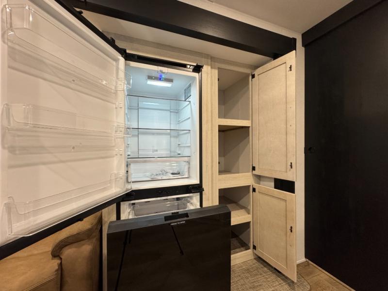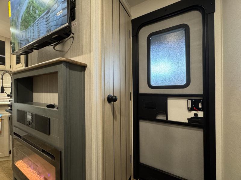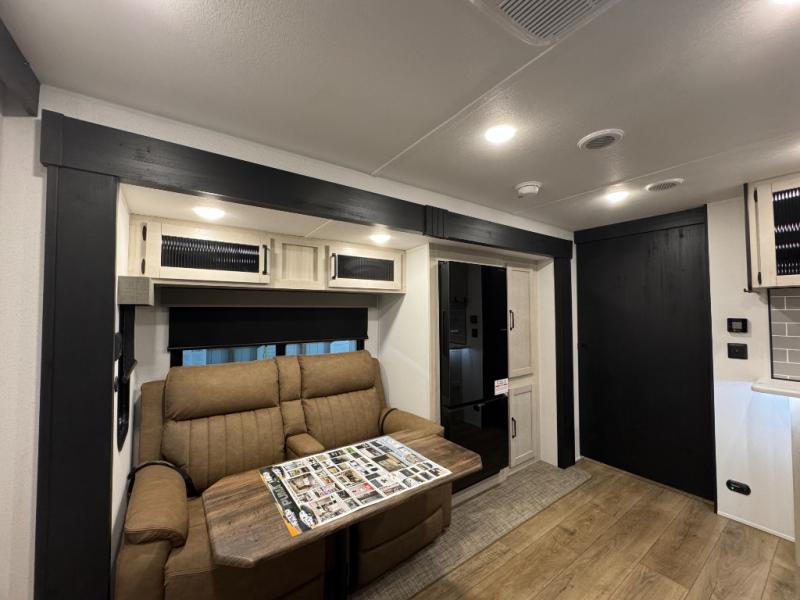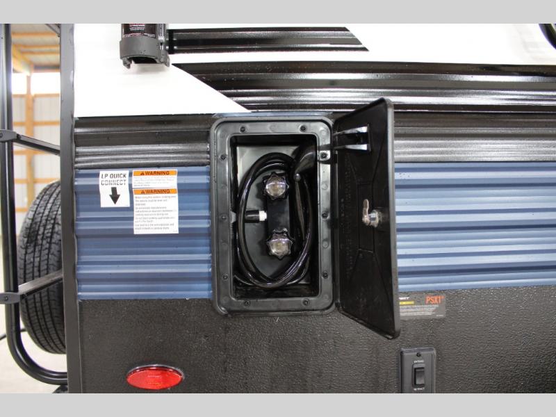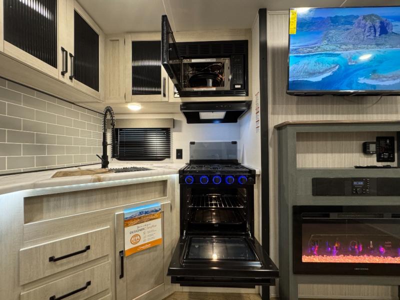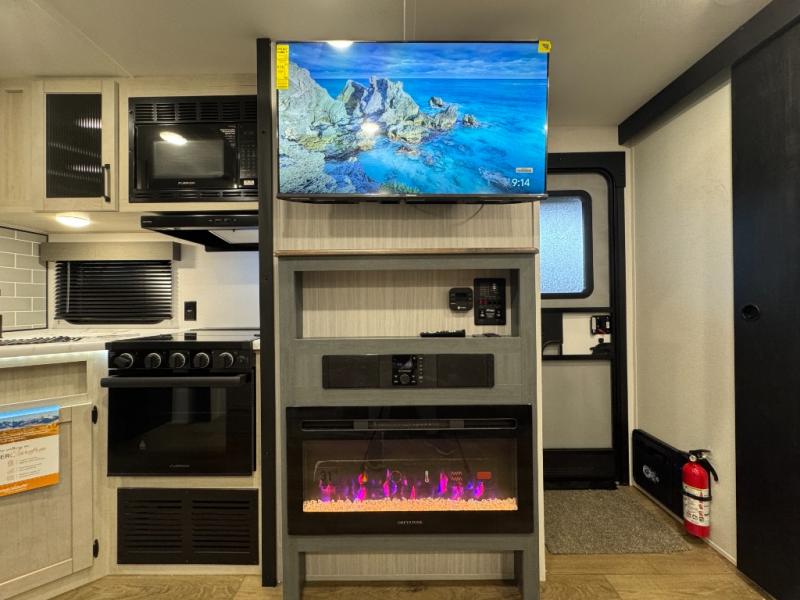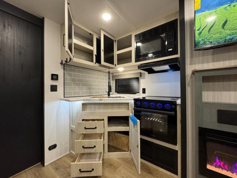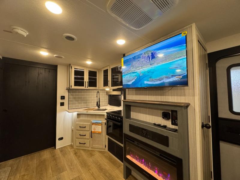 This travel trailer is inviting and spacious thanks to the large slide out, which houses the sofa, 12V refrigerator and second pantry! There is a fireplace across from the sofa for added comfort, and the full rear bath will be easy to get to. A full kitchen inside includes a stainless steel oven and range plus a stainless steel microwave to cook meals, and you can choose to add the optional micro kitchen with a griddle if you enjoy cooking outdoors! When you're ready to call it a night, the queen bed in the front private bedroom will be calling your name!