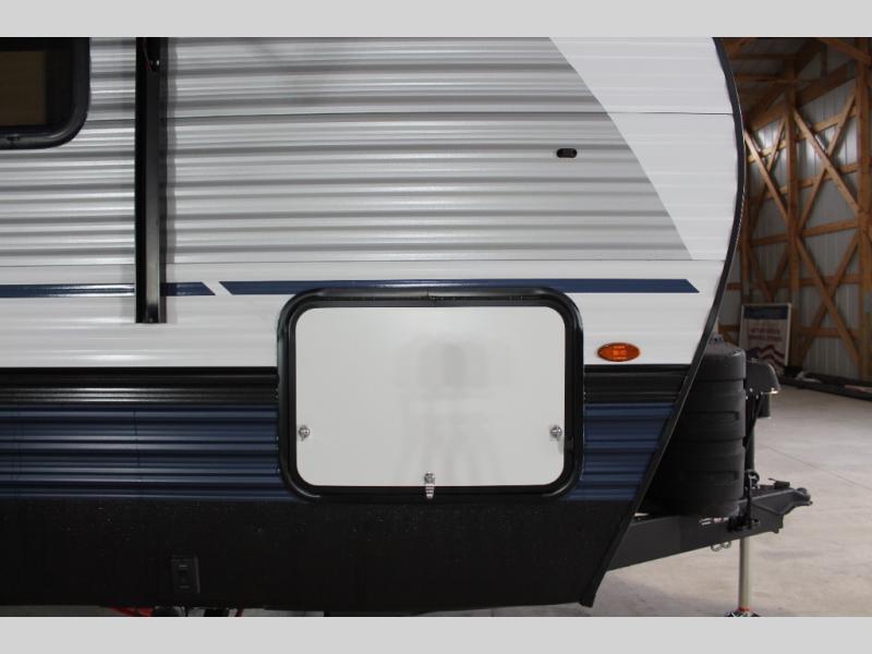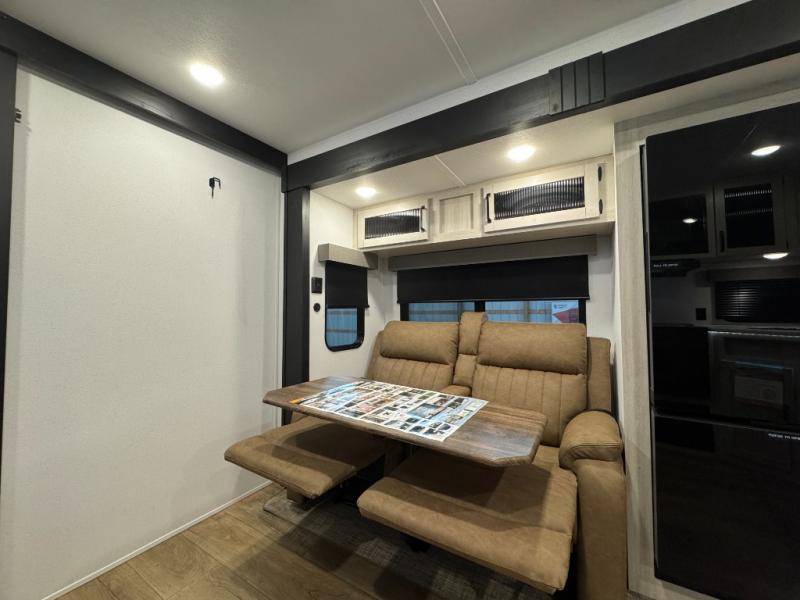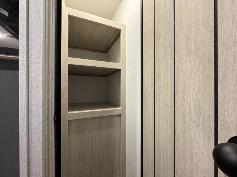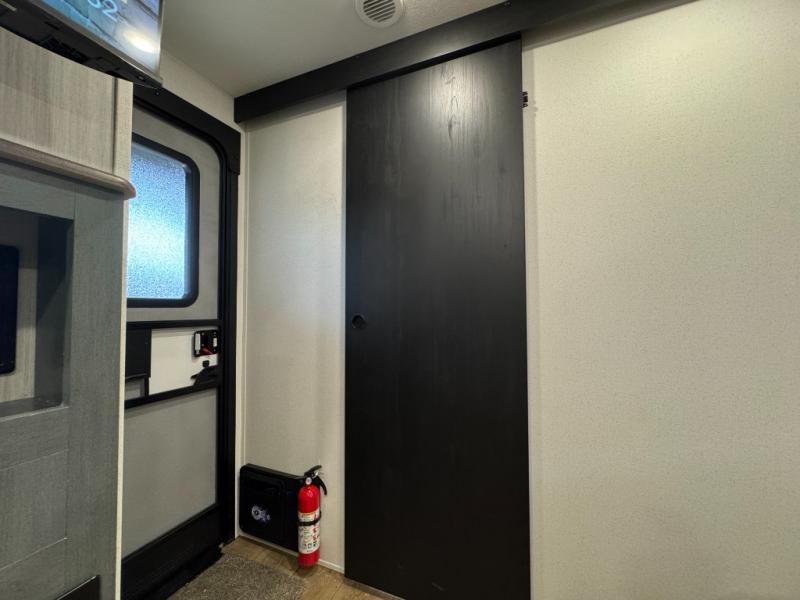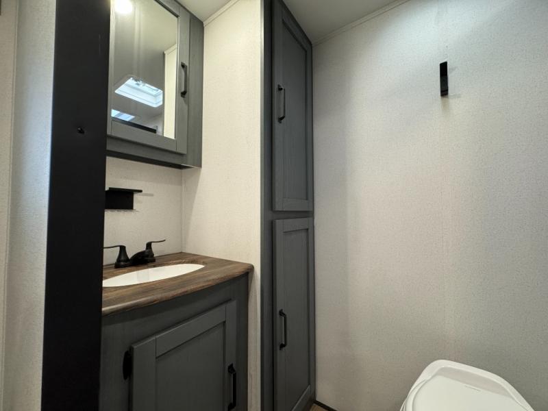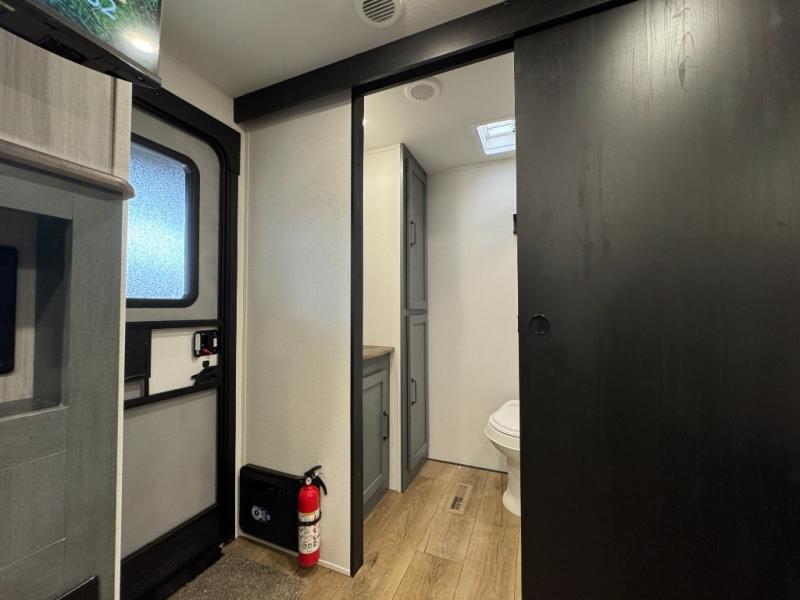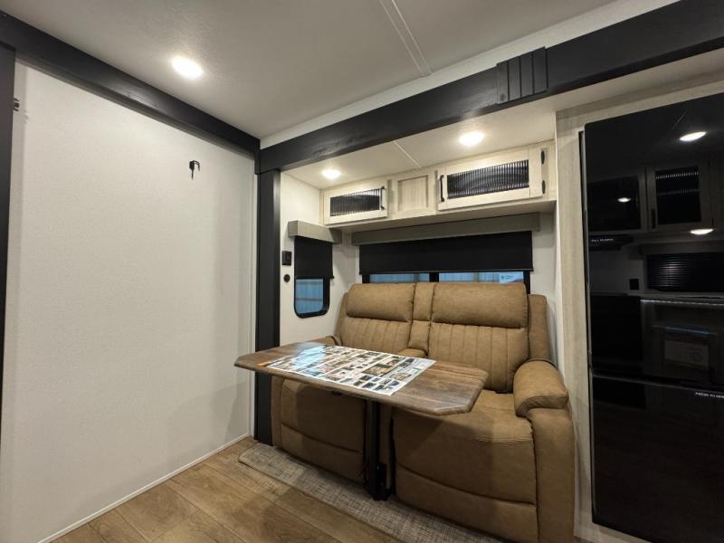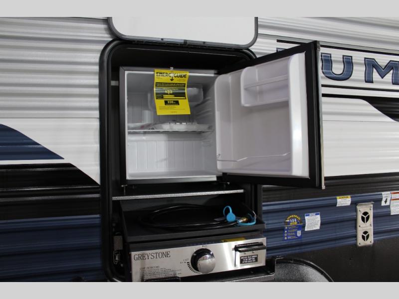 This travel trailer is inviting and spacious thanks to the large slide out, which houses the sofa, 12V refrigerator and second pantry! There is a fireplace across from the sofa for added comfort, and the full rear bath will be easy to get to. A full kitchen inside includes a stainless steel oven and range plus a stainless steel microwave to cook meals, and you can choose to add the optional micro kitchen with a griddle if you enjoy cooking outdoors! When you're ready to call it a night, the queen bed in the front private bedroom will be calling your name!