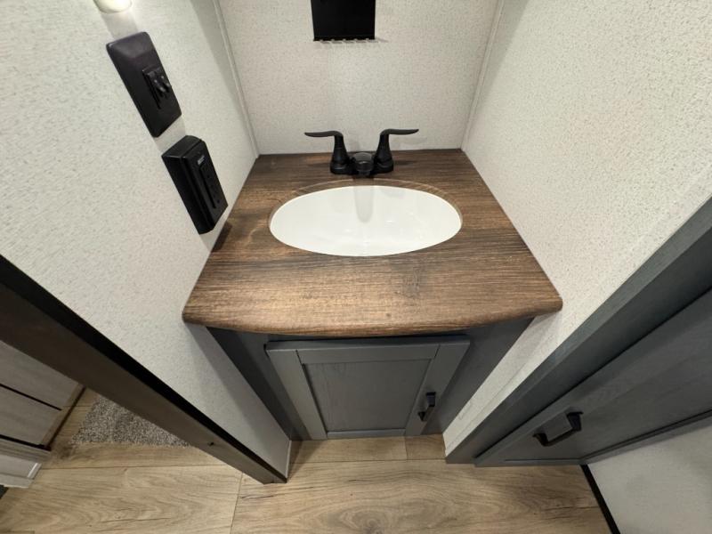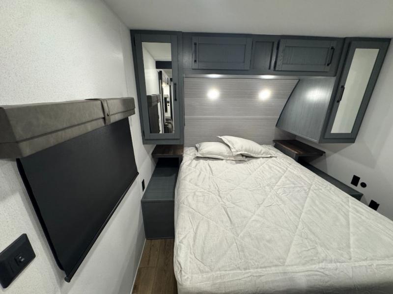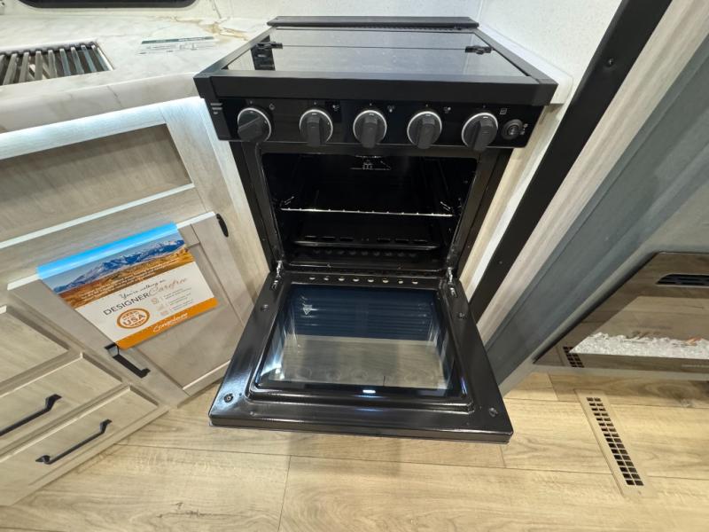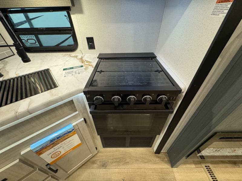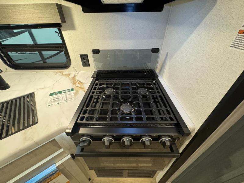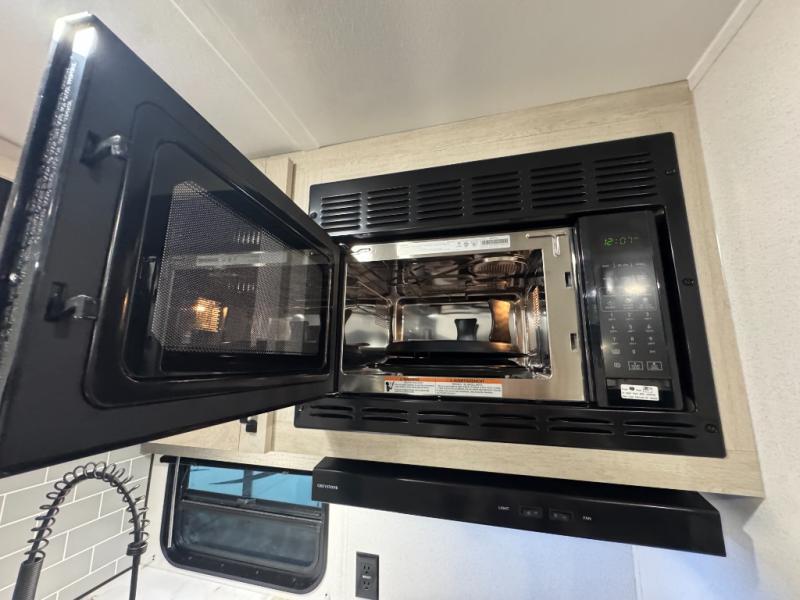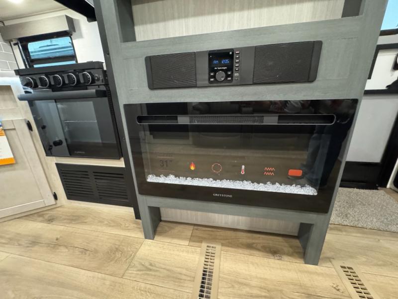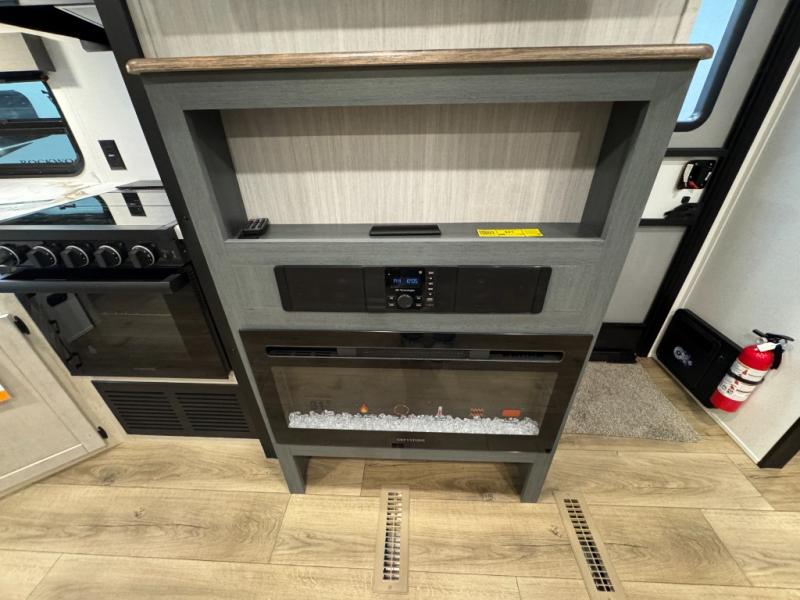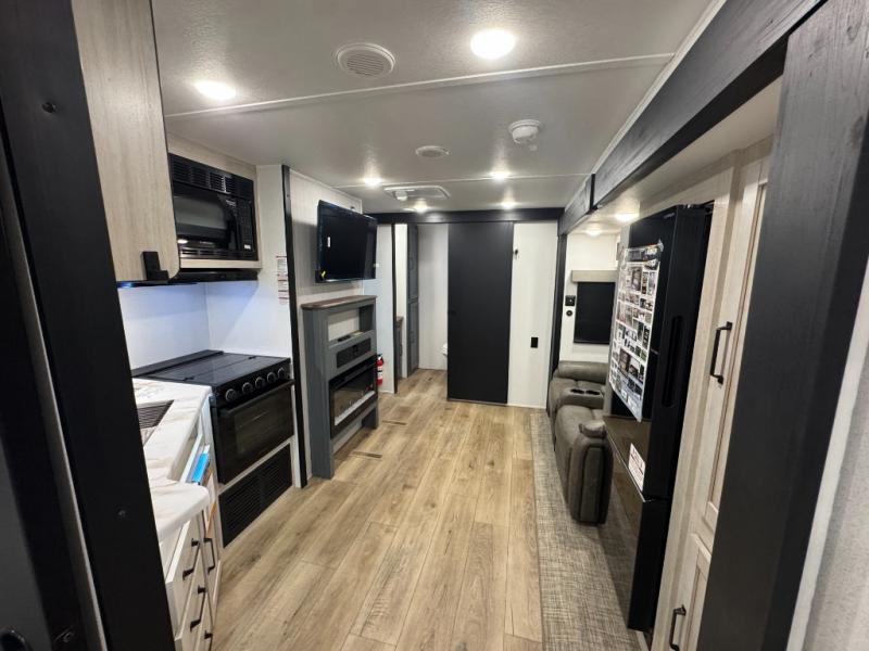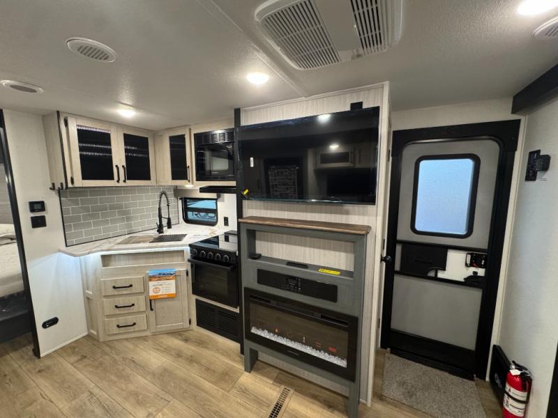 This travel trailer is inviting and spacious thanks to the large slide out, which houses the sofa, 12V refrigerator and second pantry! There is a fireplace across from the sofa for added comfort, and the full rear bath will be easy to get to. A full kitchen inside includes a stainless steel oven and range plus a stainless steel microwave to cook meals, and you can choose to add the optional micro kitchen with a griddle if you enjoy cooking outdoors! When you're ready to call it a night, the queen bed in the front private bedroom will be calling your name!