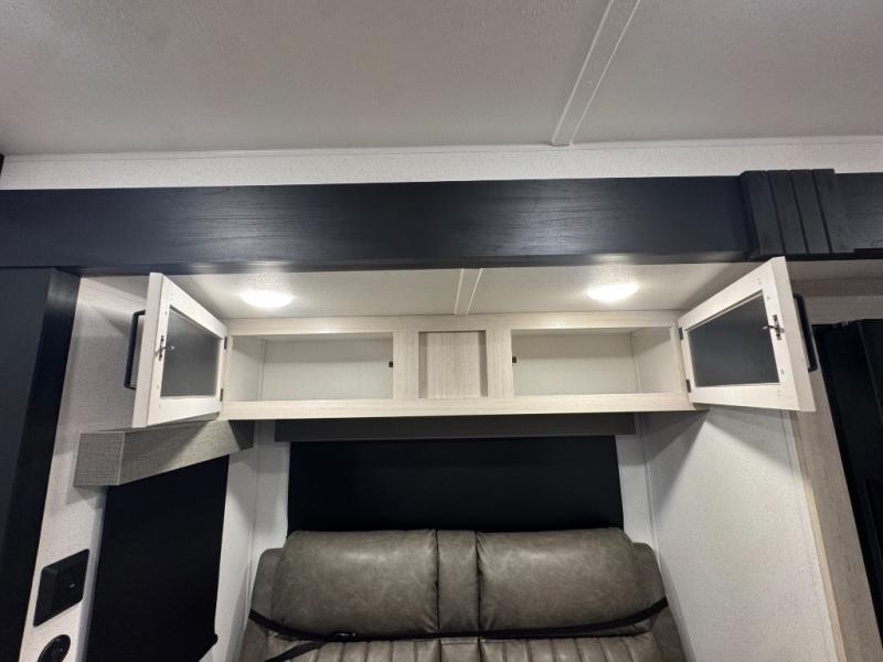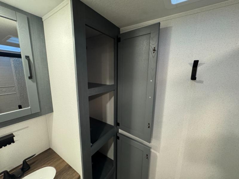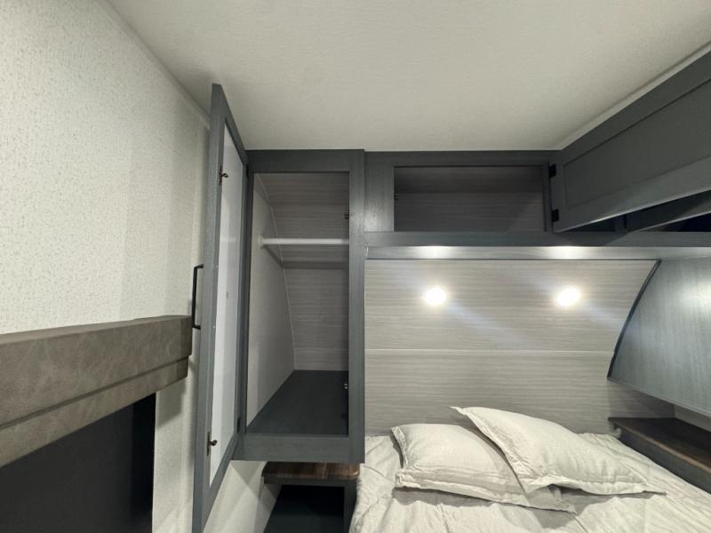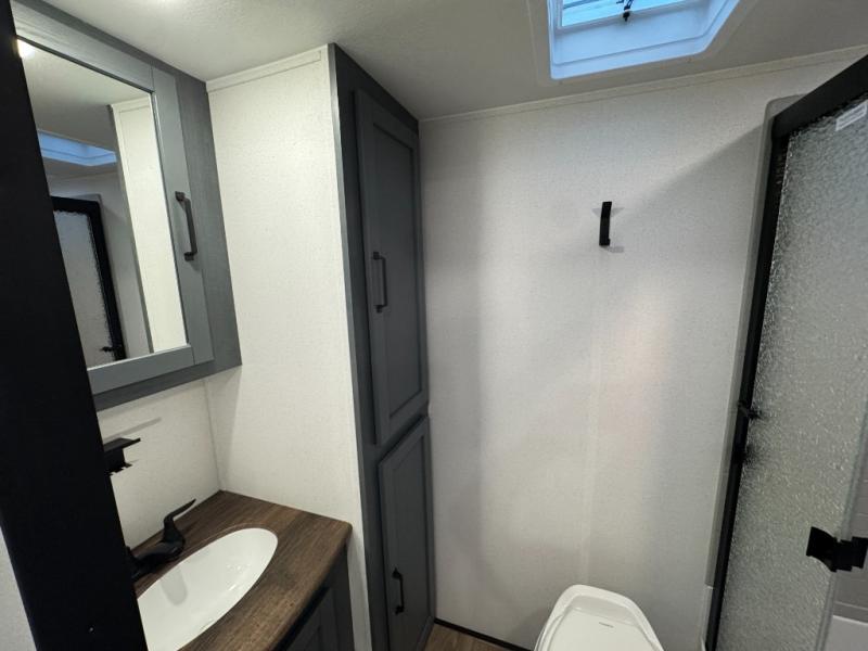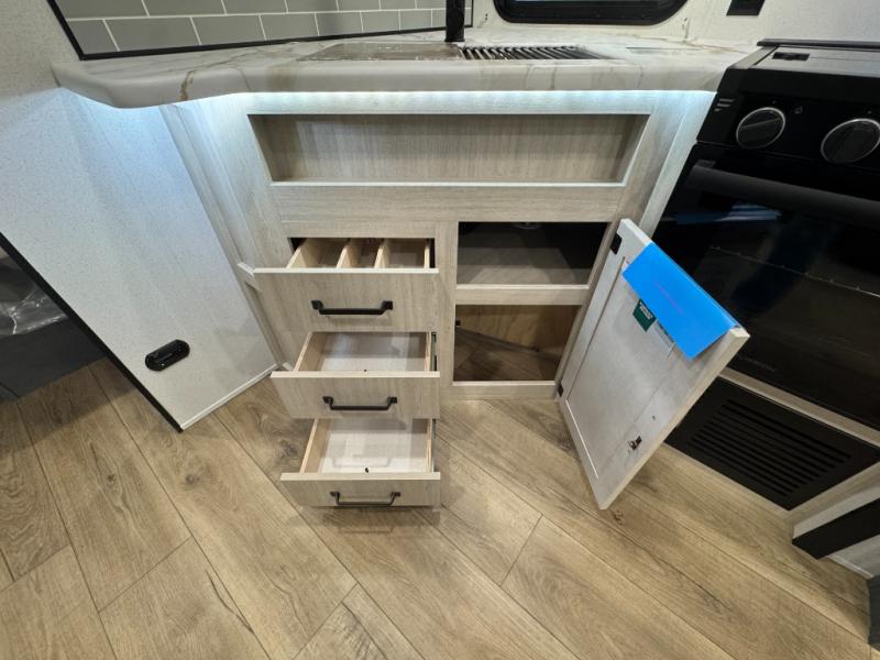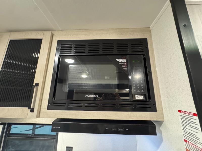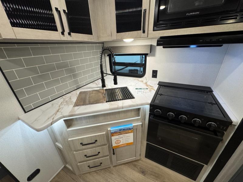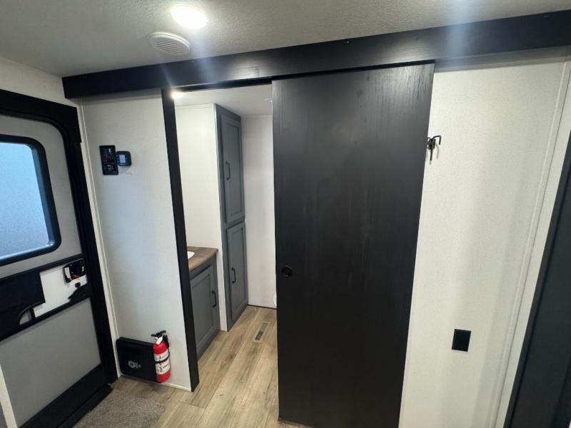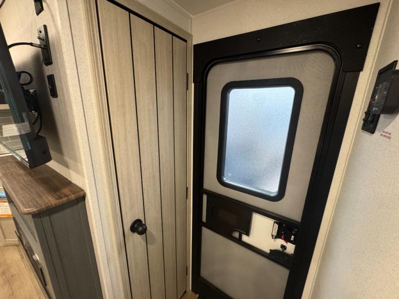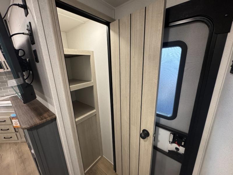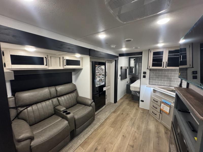 This travel trailer is inviting and spacious thanks to the large slide out, which houses the sofa, 12V refrigerator and second pantry! There is a fireplace across from the sofa for added comfort, and the full rear bath will be easy to get to. A full kitchen inside includes a stainless steel oven and range plus a stainless steel microwave to cook meals, and you can choose to add the optional micro kitchen with a griddle if you enjoy cooking outdoors! When you're ready to call it a night, the queen bed in the front private bedroom will be calling your name!