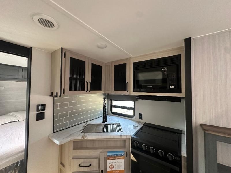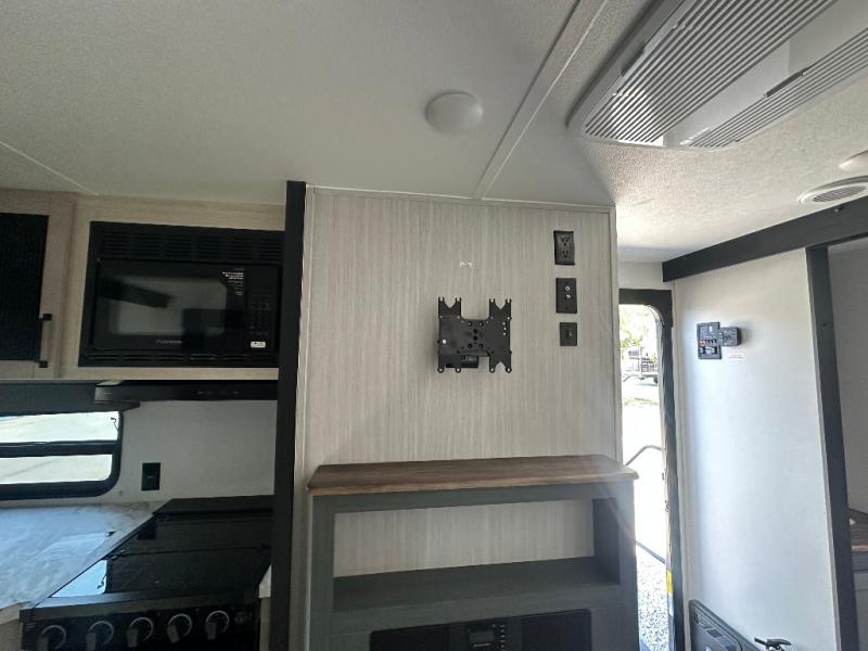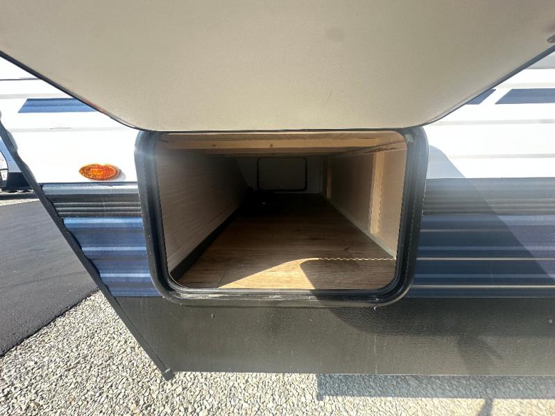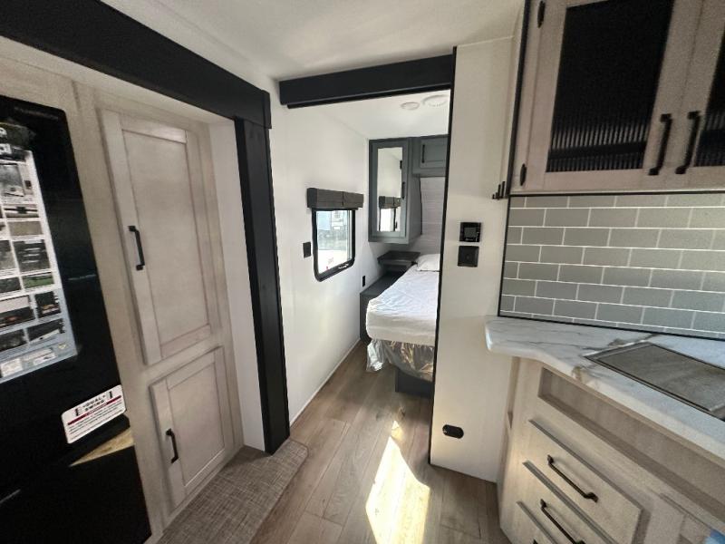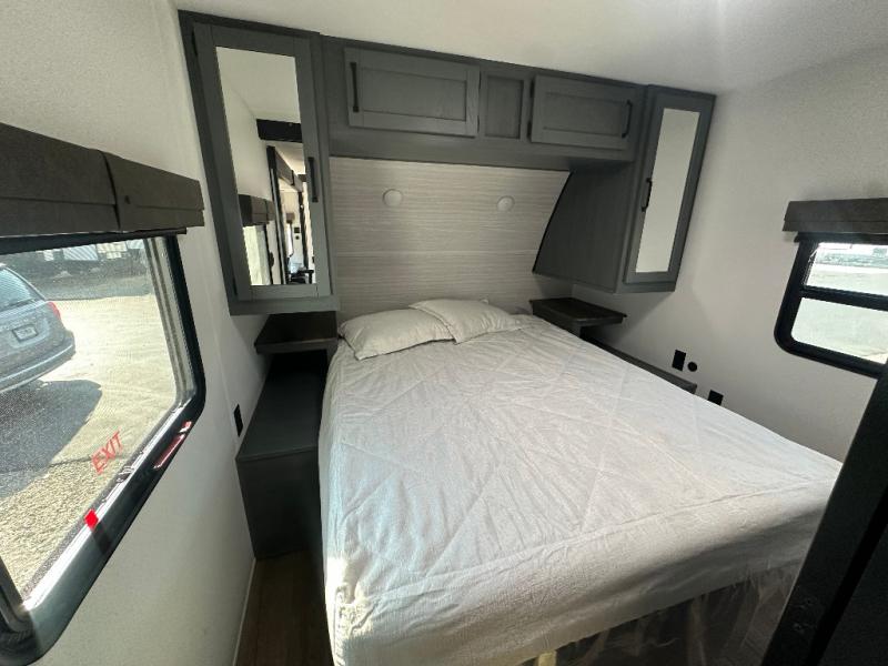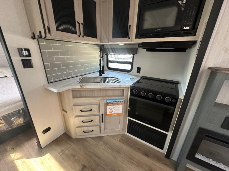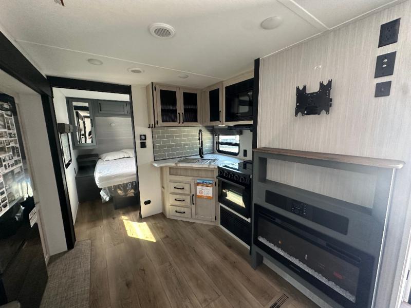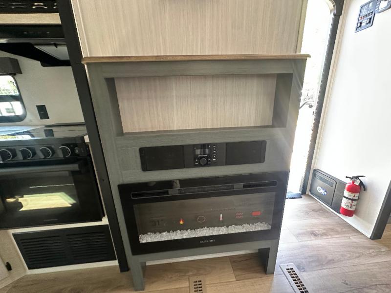 This travel trailer is inviting and spacious thanks to the large slide out, which houses the sofa, 12V refrigerator and second pantry! There is a fireplace across from the sofa for added comfort, and the full rear bath will be easy to get to. A full kitchen inside includes a stainless steel oven and range plus a stainless steel microwave to cook meals, and you can choose to add the optional micro kitchen with a griddle if you enjoy cooking outdoors! When you're ready to call it a night, the queen bed in the front private bedroom will be calling your name!