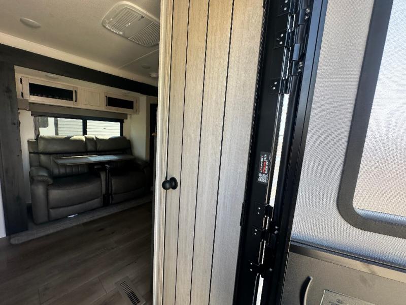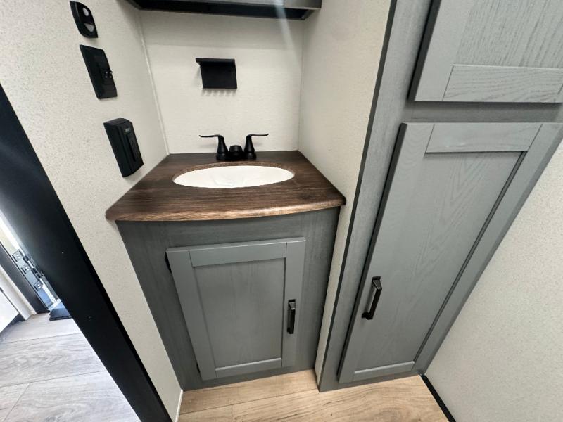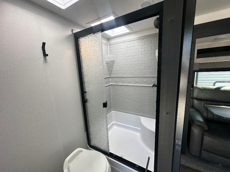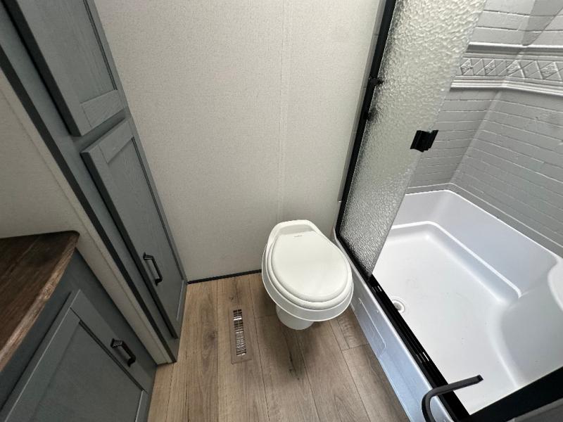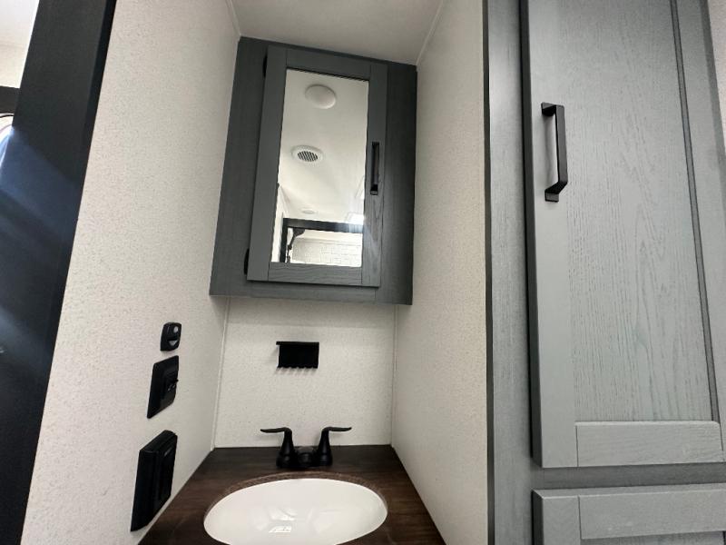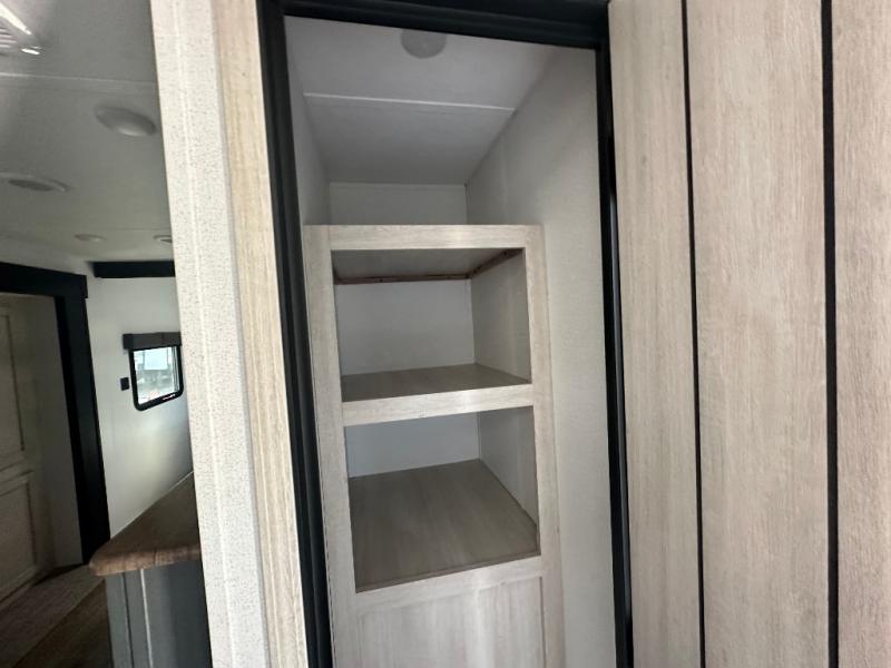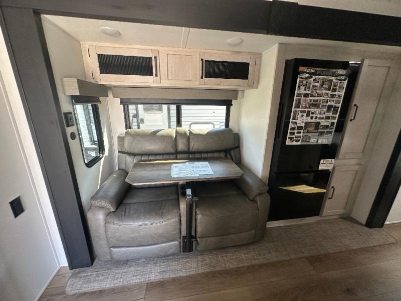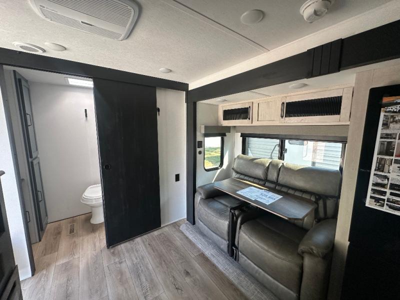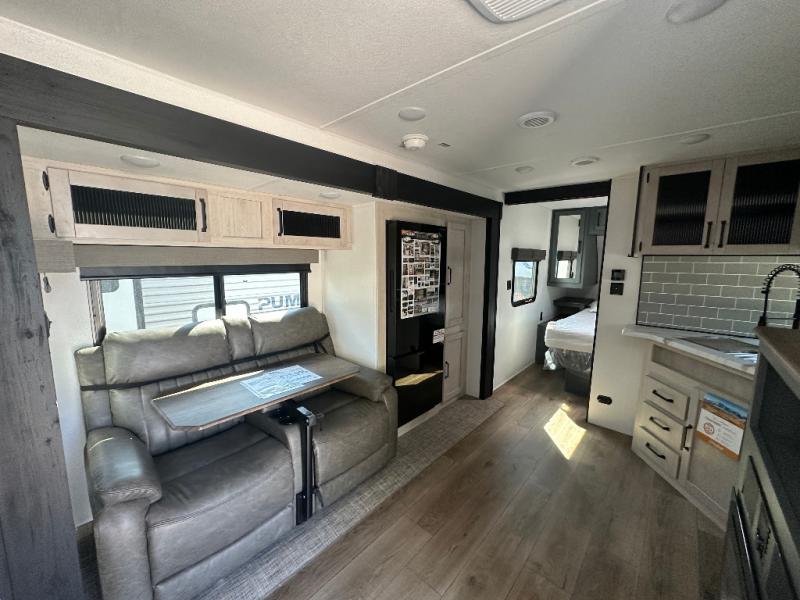 This travel trailer is inviting and spacious thanks to the large slide out, which houses the sofa, 12V refrigerator and second pantry! There is a fireplace across from the sofa for added comfort, and the full rear bath will be easy to get to. A full kitchen inside includes a stainless steel oven and range plus a stainless steel microwave to cook meals, and you can choose to add the optional micro kitchen with a griddle if you enjoy cooking outdoors! When you're ready to call it a night, the queen bed in the front private bedroom will be calling your name!