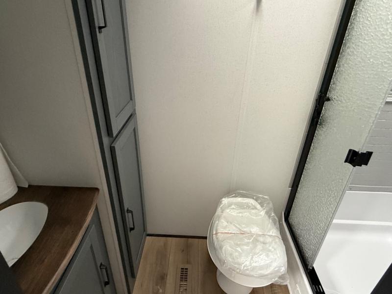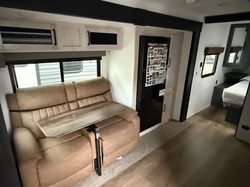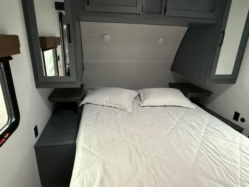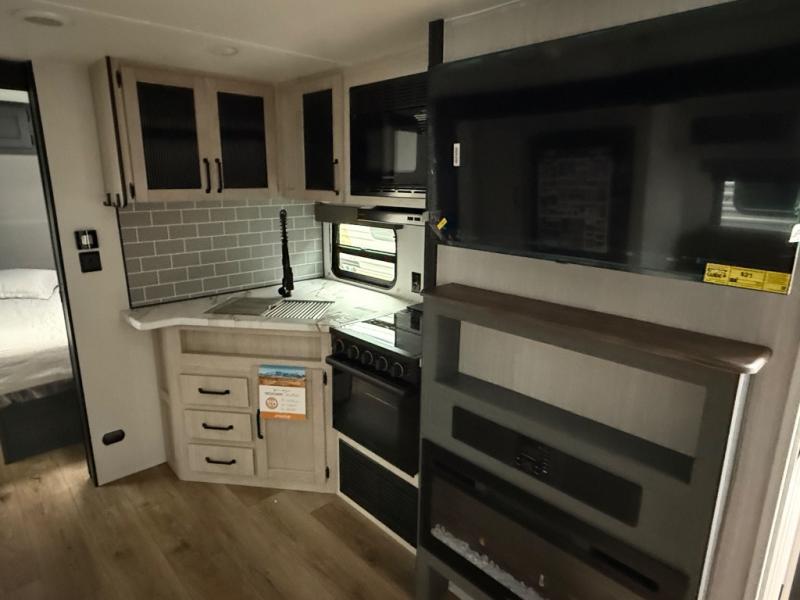 This travel trailer is inviting and spacious thanks to the large slide out, which houses the sofa, 12V refrigerator and second pantry! There is a fireplace across from the sofa for added comfort, and the full rear bath will be easy to get to. A full kitchen inside includes a stainless steel oven and range plus a stainless steel microwave to cook meals, and you can choose to add the optional micro kitchen with a griddle if you enjoy cooking outdoors! When you're ready to call it a night, the queen bed in the front private bedroom will be calling your name!