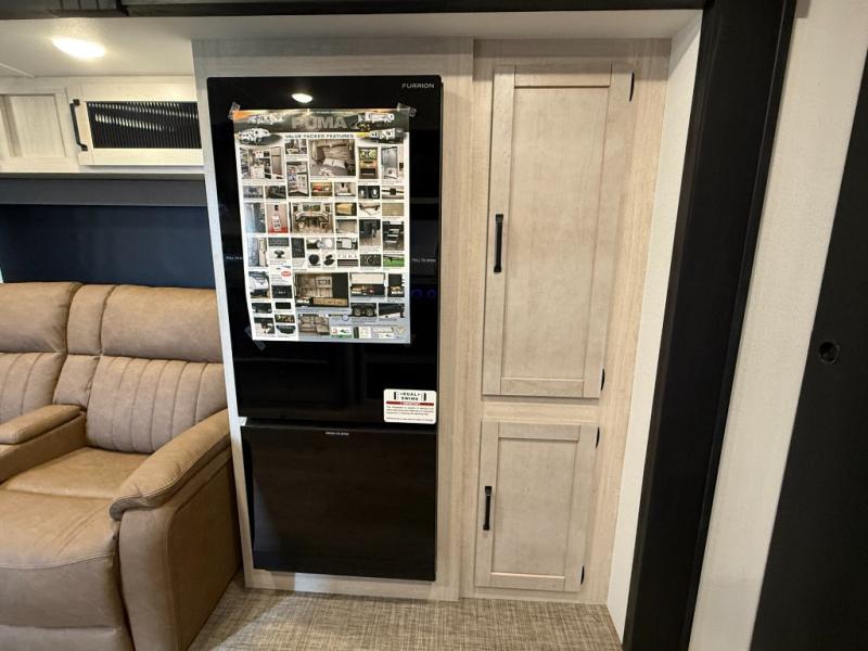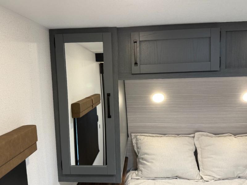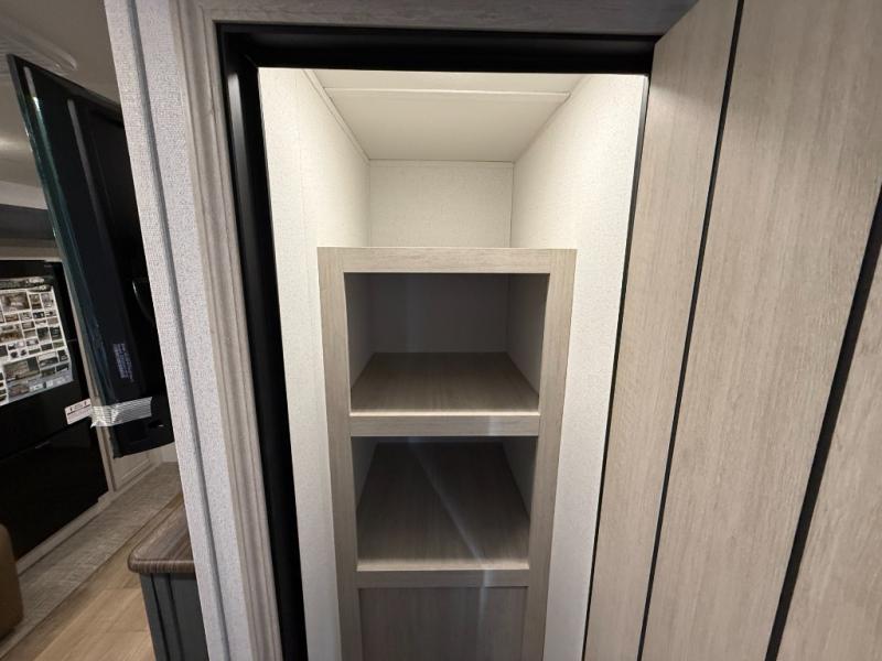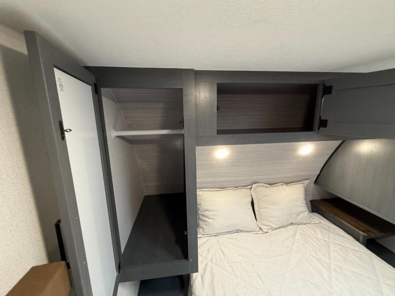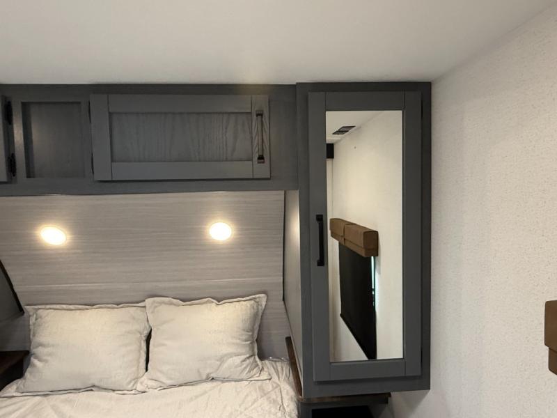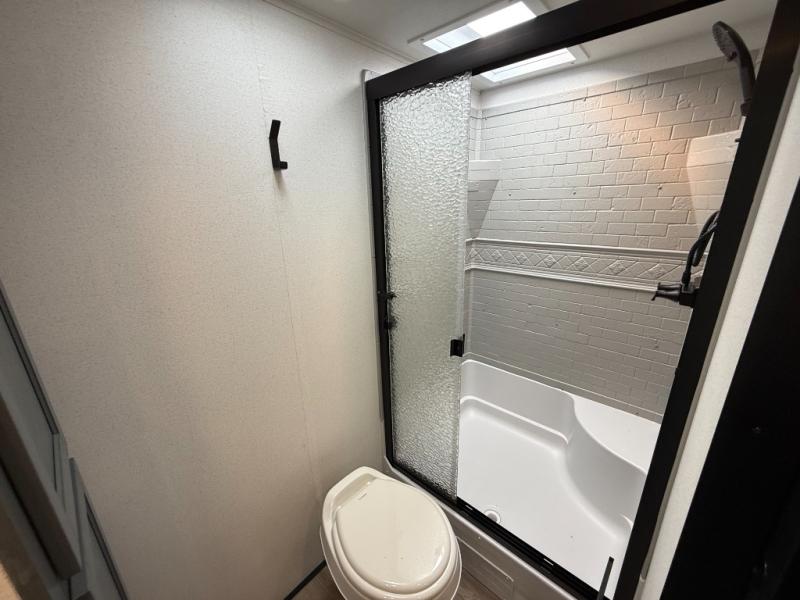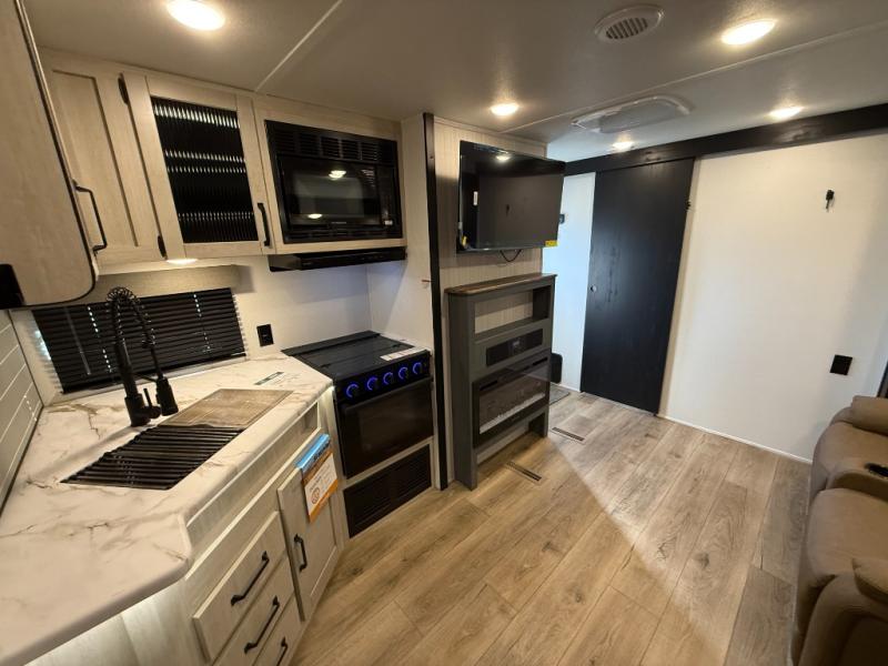Comfortable couple’s or small-family layout with private bedroom, slide-out living space, fireplace, modern kitchen appliance suite, and useful exterior features like solar prep and outside shower. Great for weekend camping or longer trips.