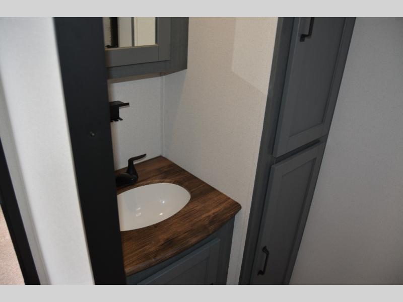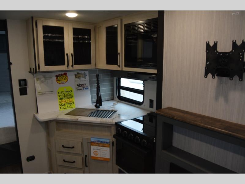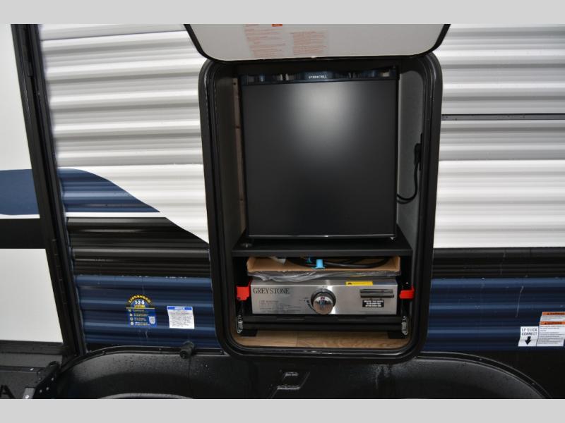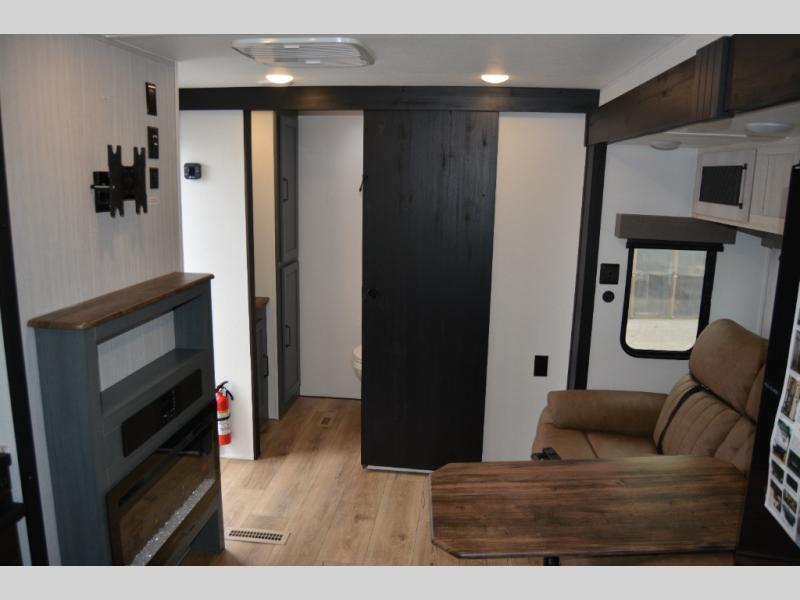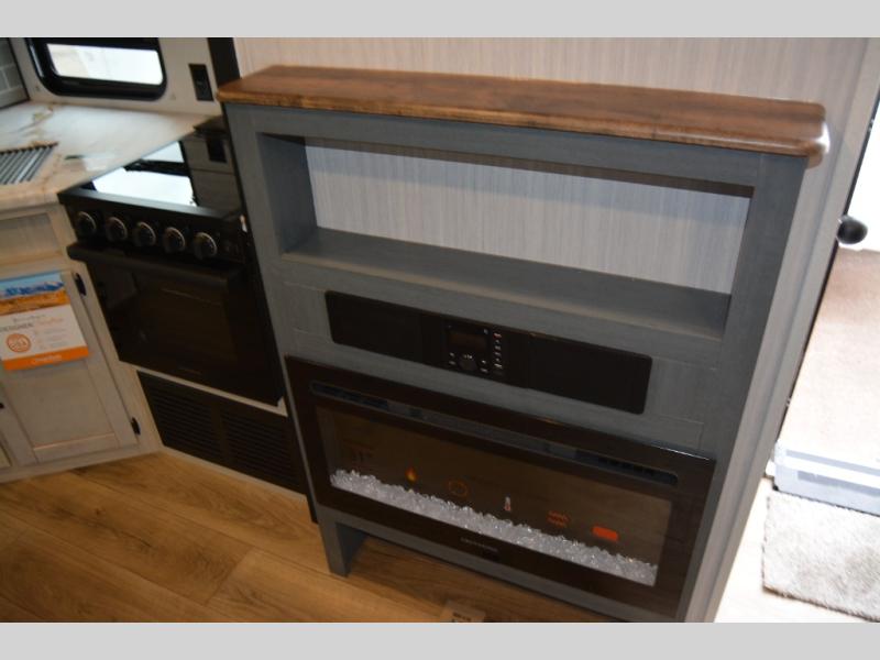 This travel trailer is inviting and spacious thanks to the large slide out, which houses the sofa, 12V refrigerator and second pantry! There is a fireplace across from the sofa for added comfort, and the full rear bath will be easy to get to. A full kitchen inside includes a stainless-steel oven and range plus a stainless-steel microwave to cook meals, and you can choose to add the optional micro kitchen with a griddle if you enjoy cooking outdoors! When you're ready to call it a night, the queen bed in the front private bedroom will be calling your name!