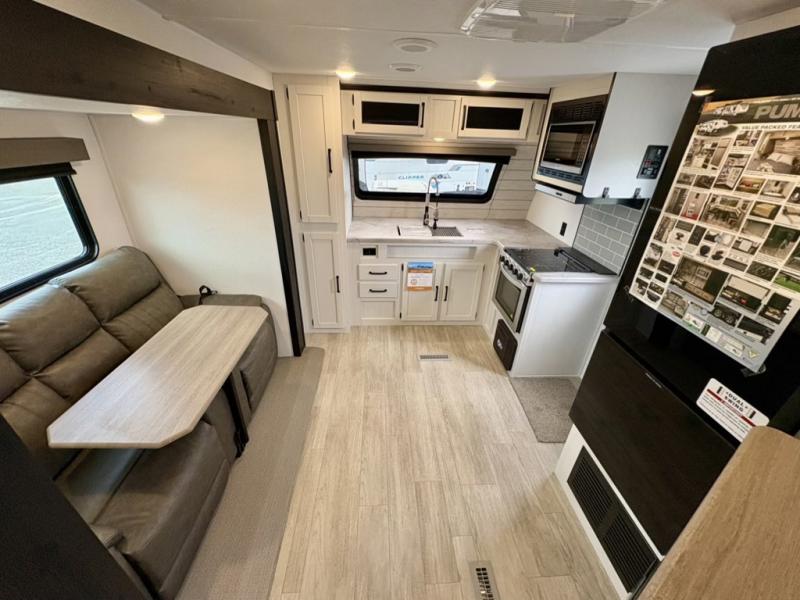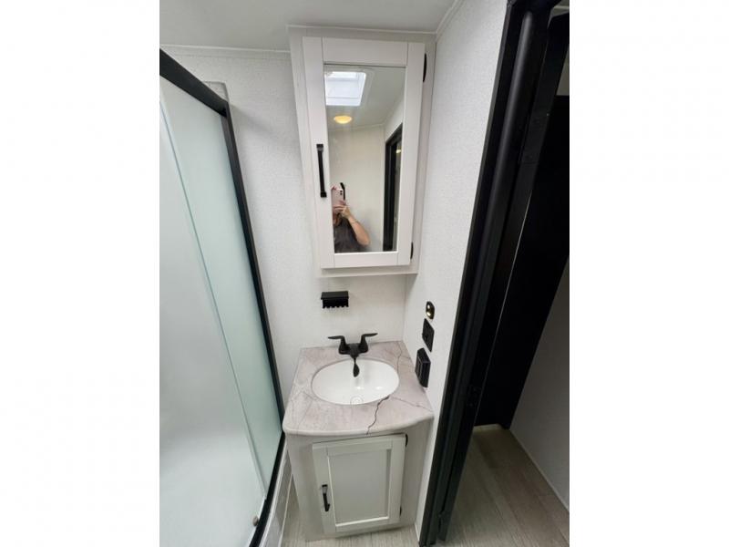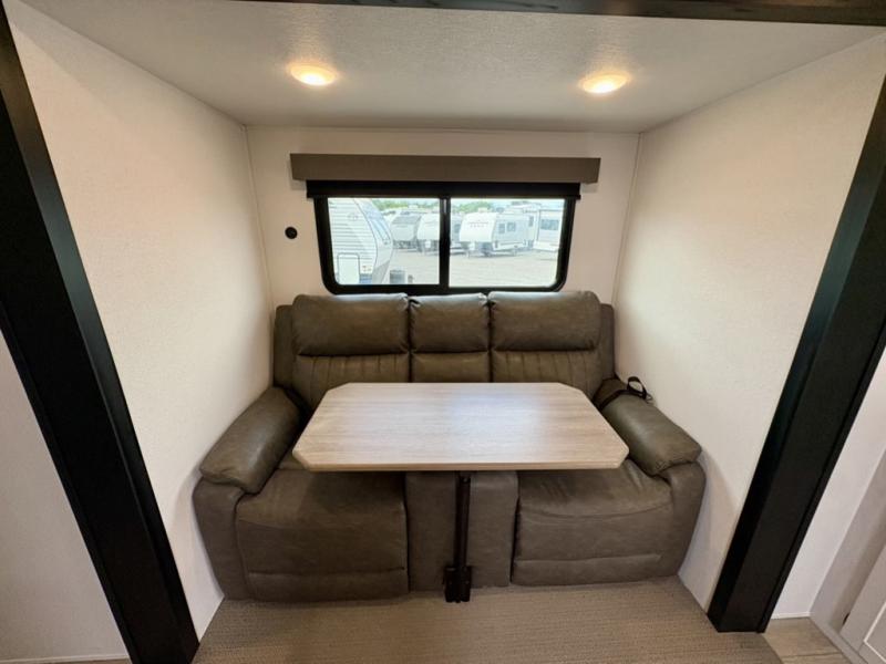 The chef will love cooking in the front kitchen of this travel trailer! They will have plenty of countertop space for meal prepping and a stainless steel oven and range to cook it all. Enjoy your meals at the sofa with table slide. After a fun day outdoors, head to the full bathroom and clean up in the 34" x 34" radius shower then change into your pajamas in the rear private bedroom and enjoy a good night's rest on the 60" x 80" queen bed! This unit also features an abundance of exterior storage for all of your outdoor camping items, along with an optional micro kitchen with a griddle.