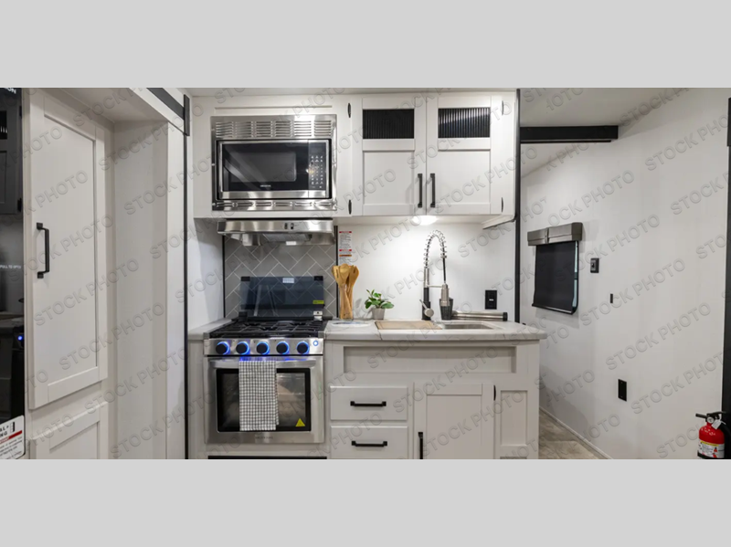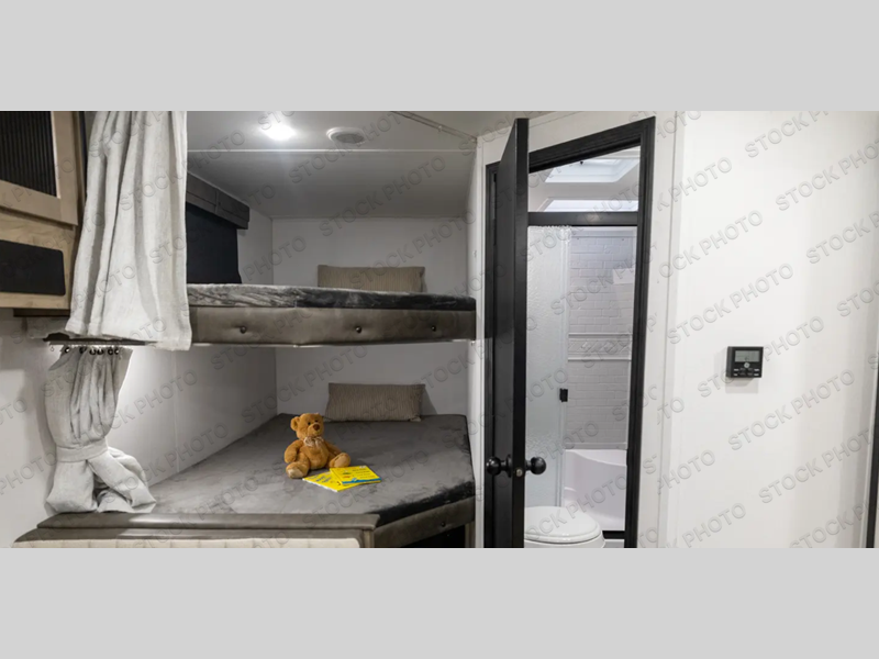 There's room for the whole family in this travel trailer! You will enjoy your own privacy with the front private bedroom which features a 60" x 80" queen bed with shirt closets on either side to hang your clothes, and a shelf above for your books or alarm clock. The kiddos can sleep on the set of 48" x 76" double-size bunk beds. They can even invite a friend or two to join in on the fun and sleep on either the sofa or booth dinette once converted. Everyone can freshen up in the rear corner bathroom with a 32" x 40" shower with a seat, and keep their bellies full with the stainless steel oven and range. You could even choose to add the optional outside mini kitchen if you enjoy cooking outdoors!