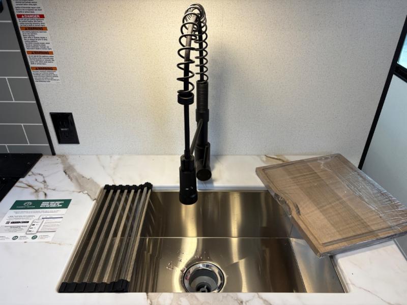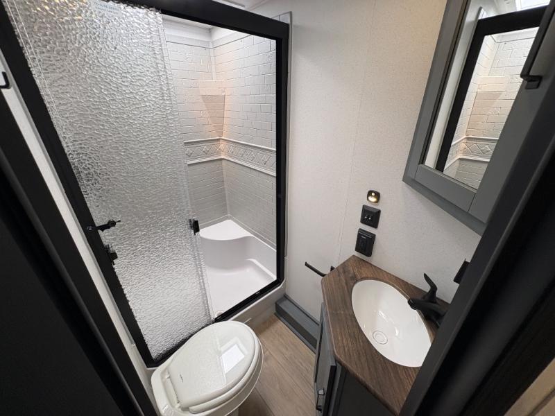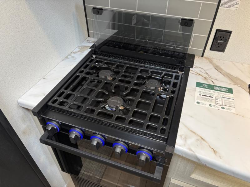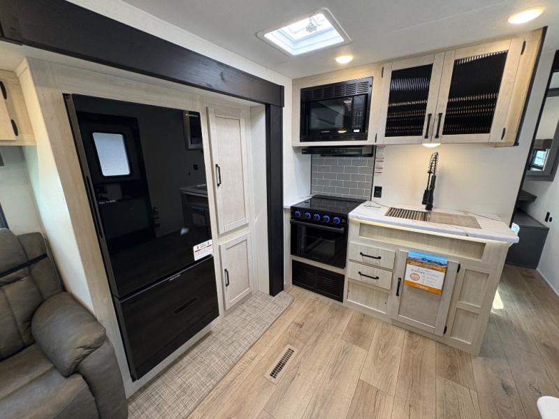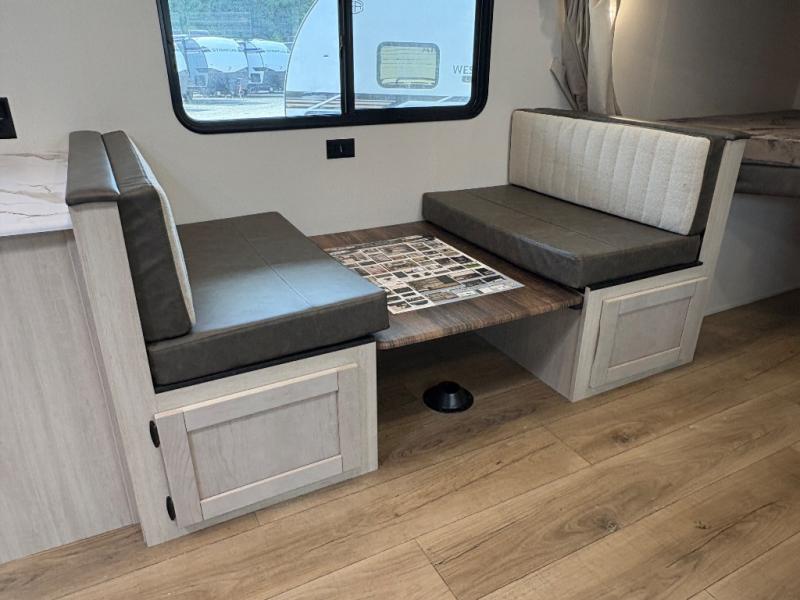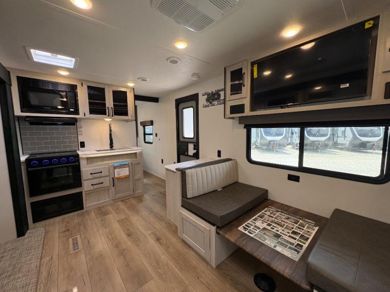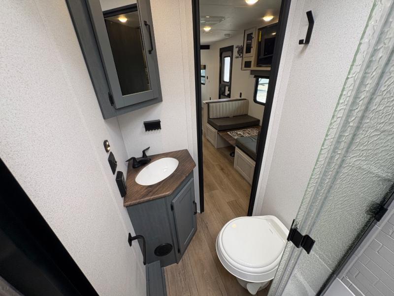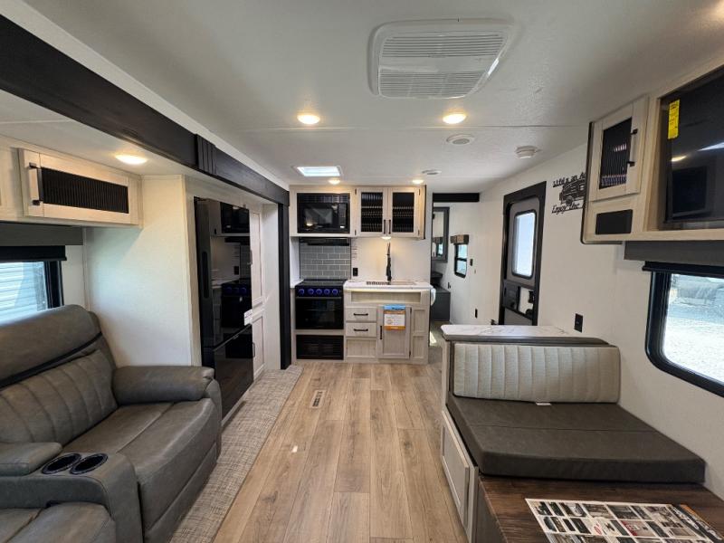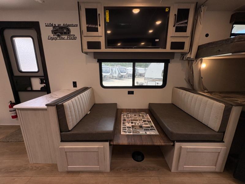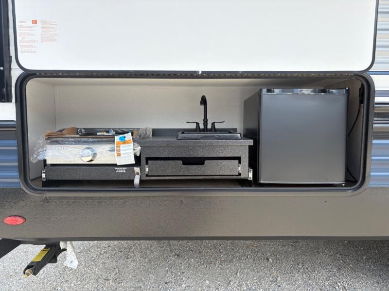 There's room for the whole family in this travel trailer! You will enjoy your own privacy with the front private bedroom which features a 60" x 80" queen bed with shirt closets on either side to hang your clothes, and a shelf above for your books or alarm clock. The kiddos can sleep on the set of 48" x 76" double-size bunk beds. They can even invite a friend or two to join in on the fun and sleep on either the sofa or booth dinette once converted. Everyone can freshen up in the rear corner bathroom with a 32" x 40" shower with a seat, and keep their bellies full with the stainless steel oven and range. You could even choose to add the optional outside mini kitchen if you enjoy cooking outdoors!